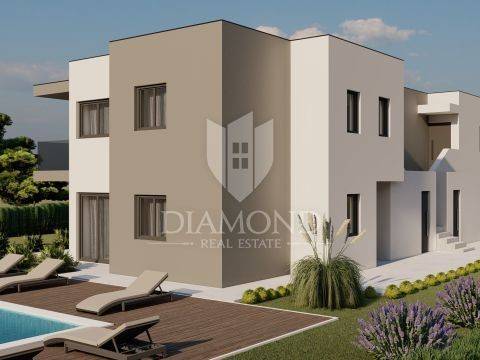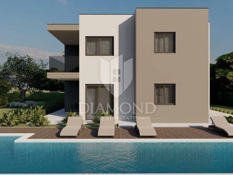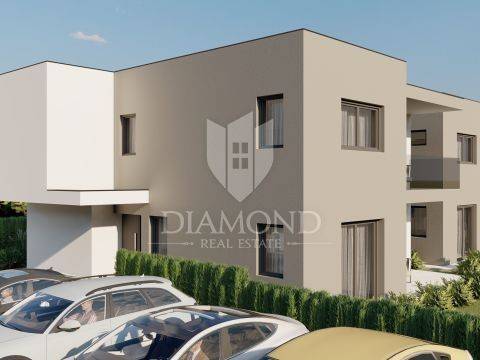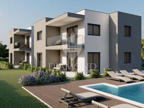 This modern building with five residential units is located in the immediate vicinity of the Poreč train station. The building is only 4 km away from the city and the first beaches. It is located on the edge of the village and is surrounded by modern houses and greenery. All the necessary facilities for life are a few minutes' drive away. The apartment is located on the first floor of the building and its square footage is 93.68 m2. The apartment consists of an entrance hall, a spacious living room with a kitchen and a dining room from which there is access to a covered terrace, three bedrooms, one of which has its own bathroom, and the other has access to its own terrace, another bathroom and a toilet. Air conditioners will be installed in the apartment and electric underfloor heating in the bathrooms, and the first phase for central heating can also be installed upon agreement. The entire building will have a common pool that will be used by all tenants. The apartment will also have its own parking lot. A well-known investor starts construction in 02/2024. and the planned completion is December 2024. The property is an ideal investment for family life as well as for tourist rental.