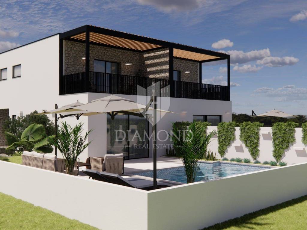 The house is spread over 2 floors and the total area of ​​the house is 132 m2. On the ground floor there is a spacious living room with an open-plan kitchen and dining room, 1 bedroom with a bathroom, a laundry room, a storage room and a guest toilet. From the living room you can reach the landscaped garden where there is a swimming pool with a sunbathing area. The first floor is reached by internal stairs where there are 2 more bedrooms, each with its own bathroom and terrace. The house will have underfloor heating throughout the house and air conditioning in each room. In front of the house there are 2 parking spaces, one of which will also have an electric vehicle charger.