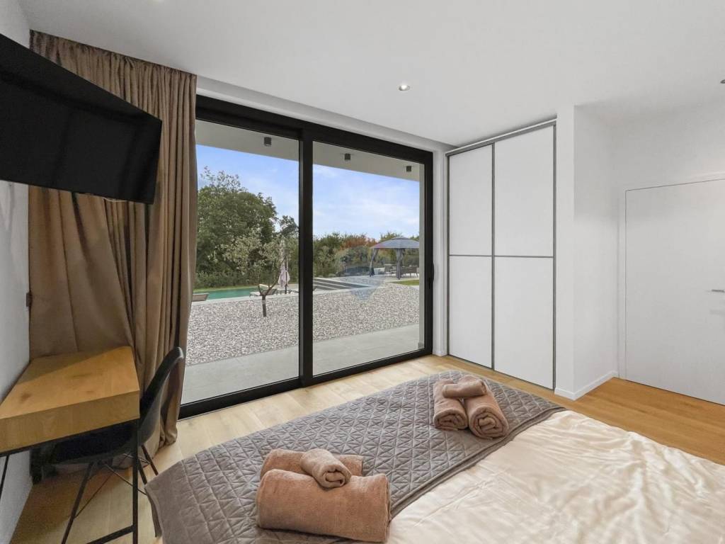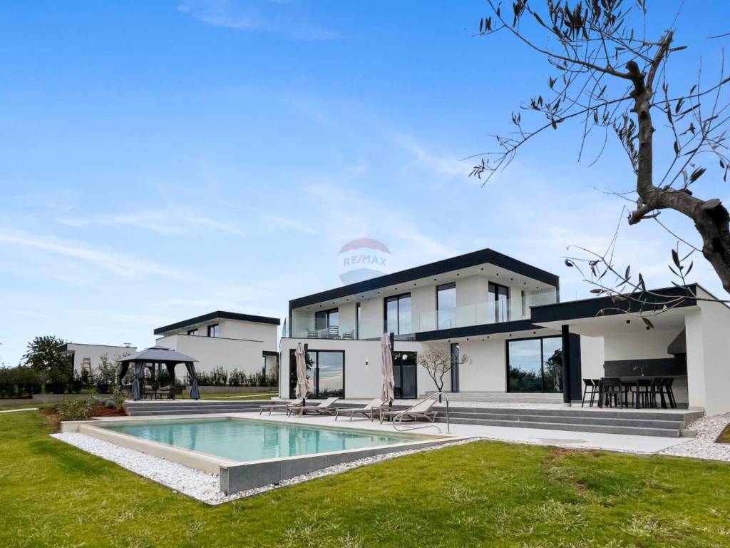 In a quiet and small village, surrounded by greenery and olive groves, we are selling a modern and tastefully decorated house. The house is located on a plot of about 1450 m2 and has a total usable area of about 260 m2. On the ground floor there is a spacious living area - living room, kitchen, bathroom for guests and one bedroom with its own bathroom. From the living room and bedroom there is access to a landscaped garden with an outdoor kitchen and a large pool of 50 m2. Upstairs there are three bedrooms, each with a separate bathroom. Top quality materials were used in the construction, and the house has underfloor heating in the bathrooms and living room, while the rest of the heating and cooling is handled by heat pumps. The house also has solar panels for the hot water heating system. The house also has a wellness area of about 60 m2 in the basement.