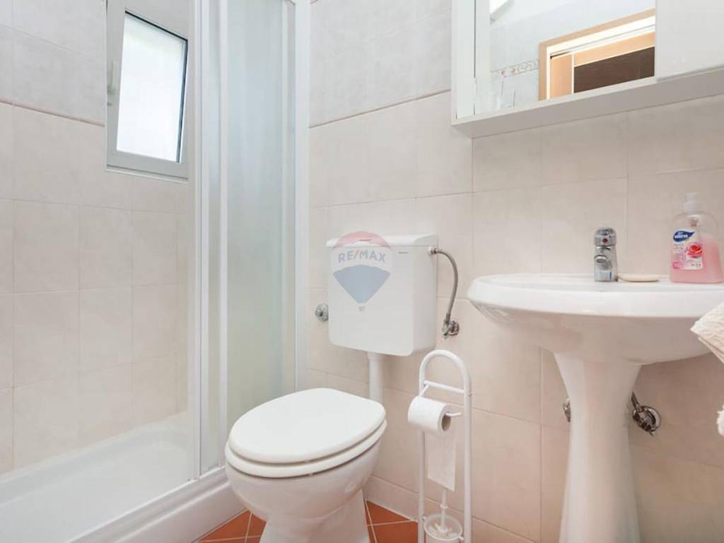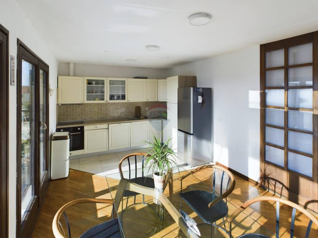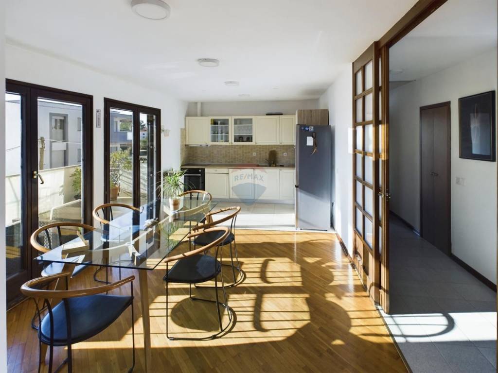 On the top floor is a larger, more comfortable apartment with an area of 115 m², consisting of a living room, kitchen with dining area, with access to a beautiful spacious balcony, 3 bedrooms, a bathroom, a toilet, and a large terrace with a stunning view of the sea and Umag.