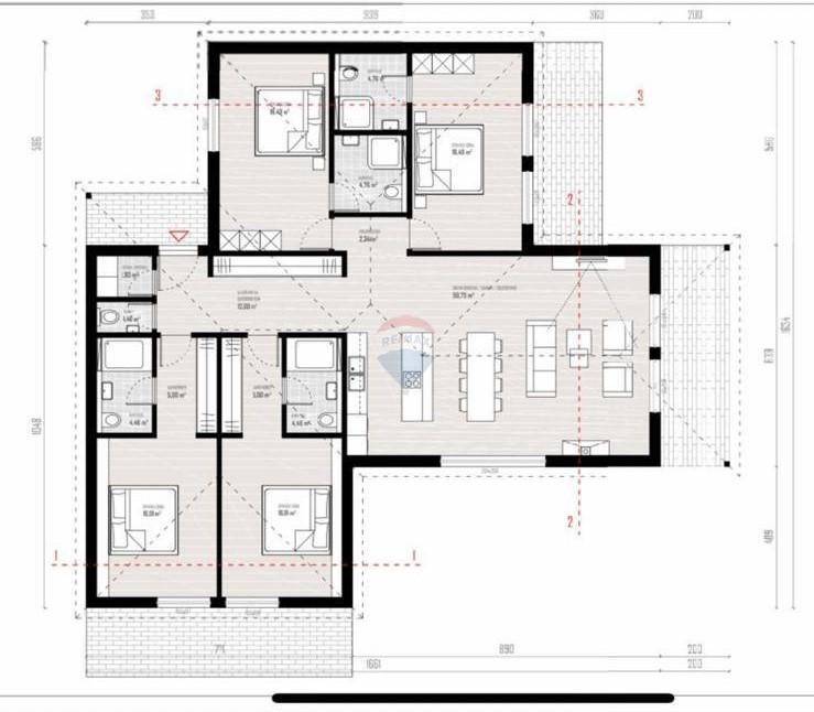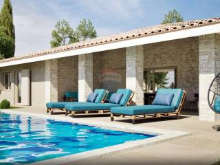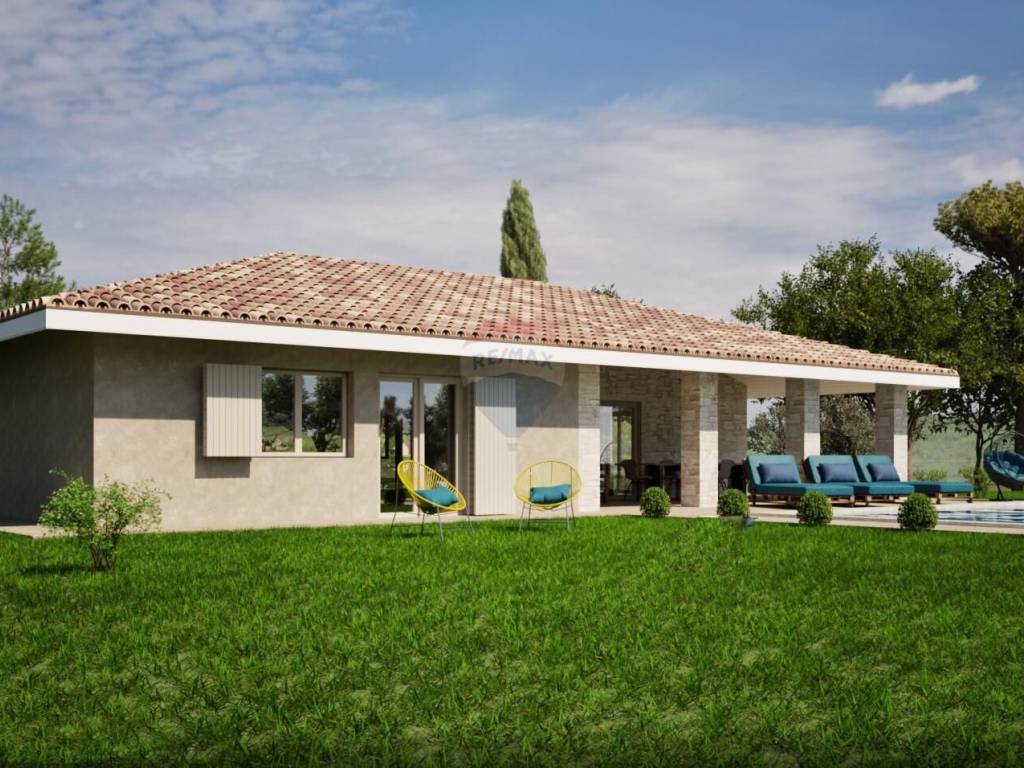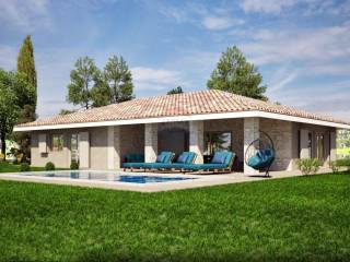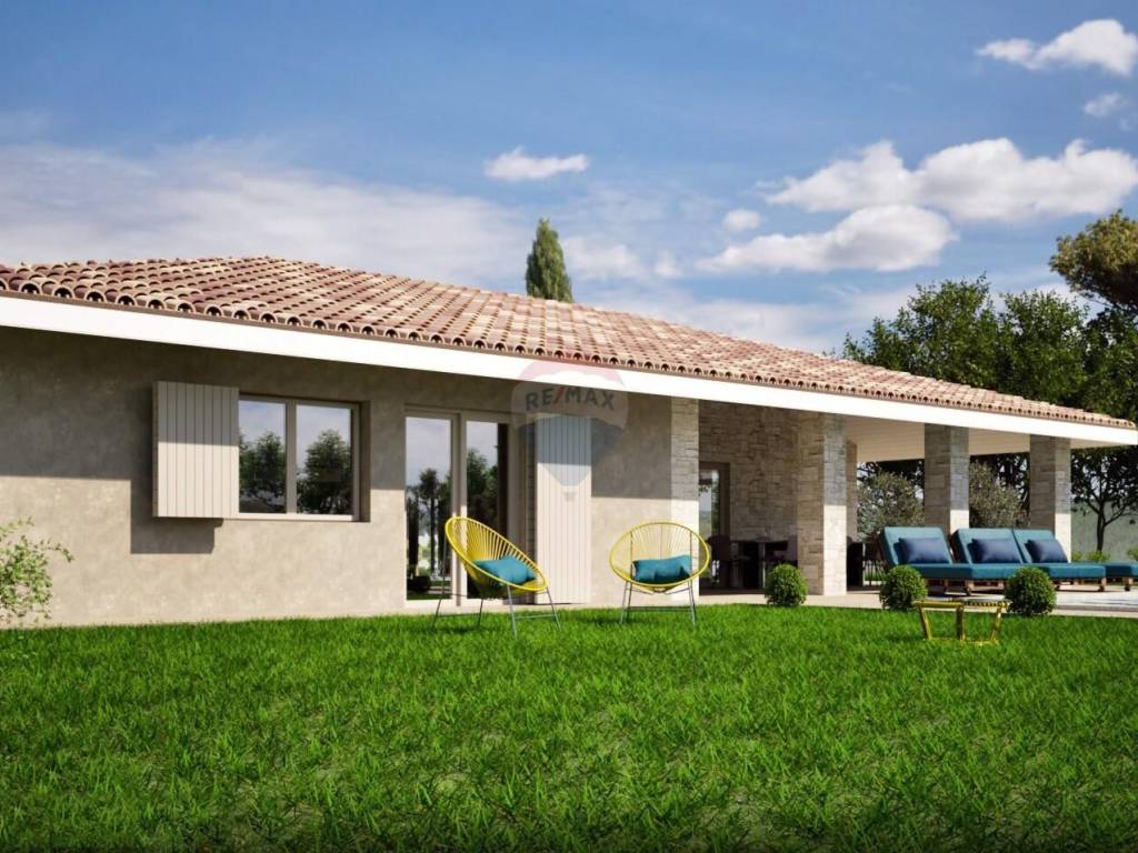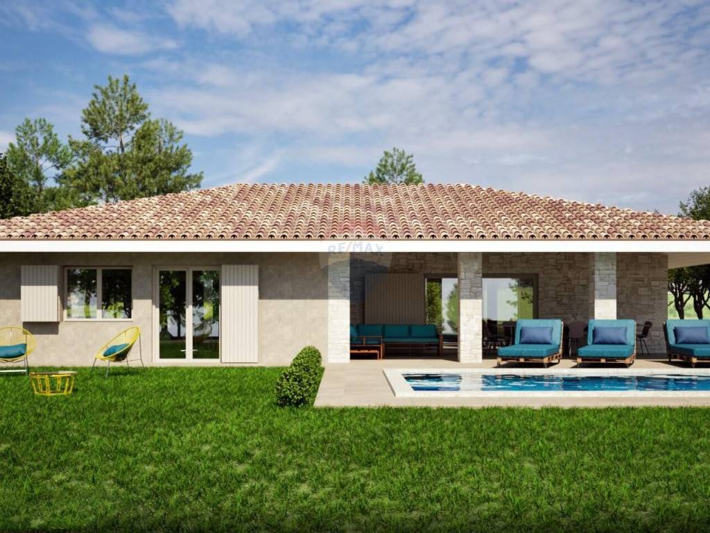 A one-story house with a beautiful view of the olive groves and the sea is for sale. The house is located in a quiet part of town at a distance of 500 m to shops, cafes, restaurants and other amenities necessary for a comfortable life. It has an area of 198 m2 and will consist of an entrance hall, four bedrooms, each of which will have its own bathroom, storage room, toilet, and a spacious open space living room with kitchen and dining room. From the living area, through the large glass walls, the view of the sunbathing area, the swimming pool, over the olive groves and all the way to the sea will extend.