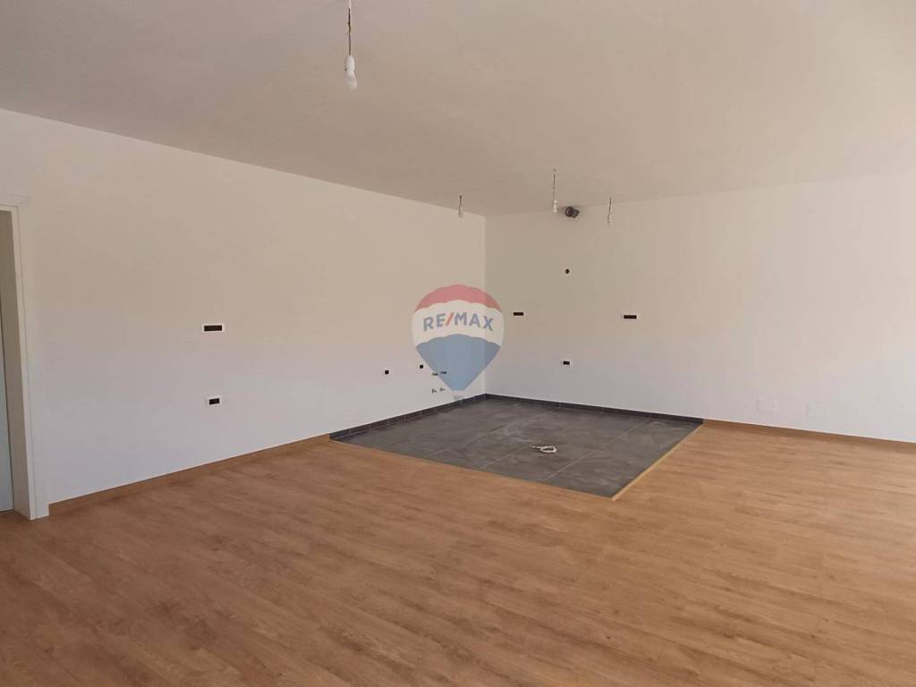 The ground floor part of the house, which is partially built into the terrain, consists of a large living room where there will be an L-shaped kitchen and a living room, as well as a staircase to go to the first floor, a storage room and a bathroom.