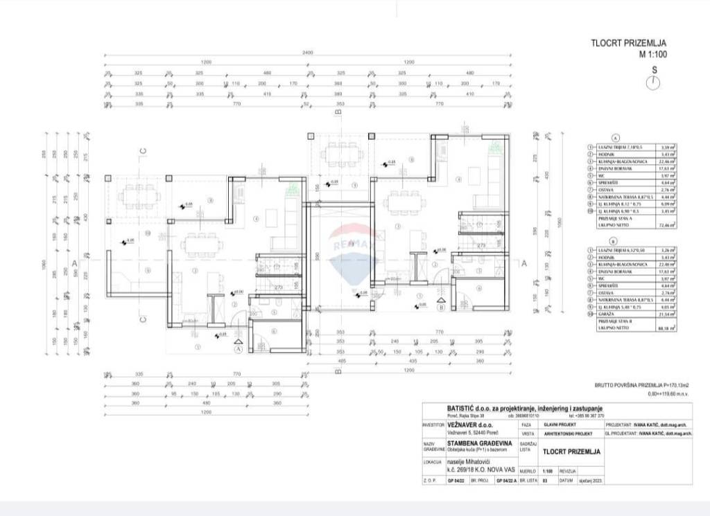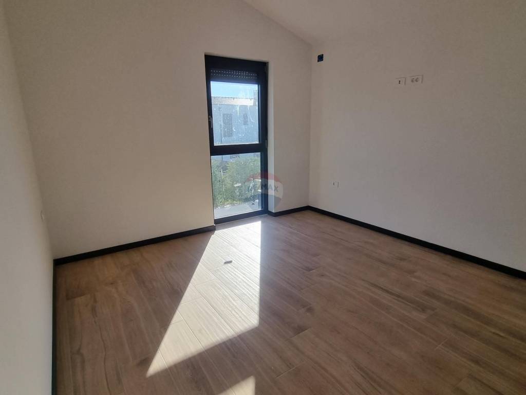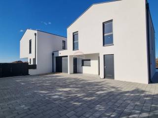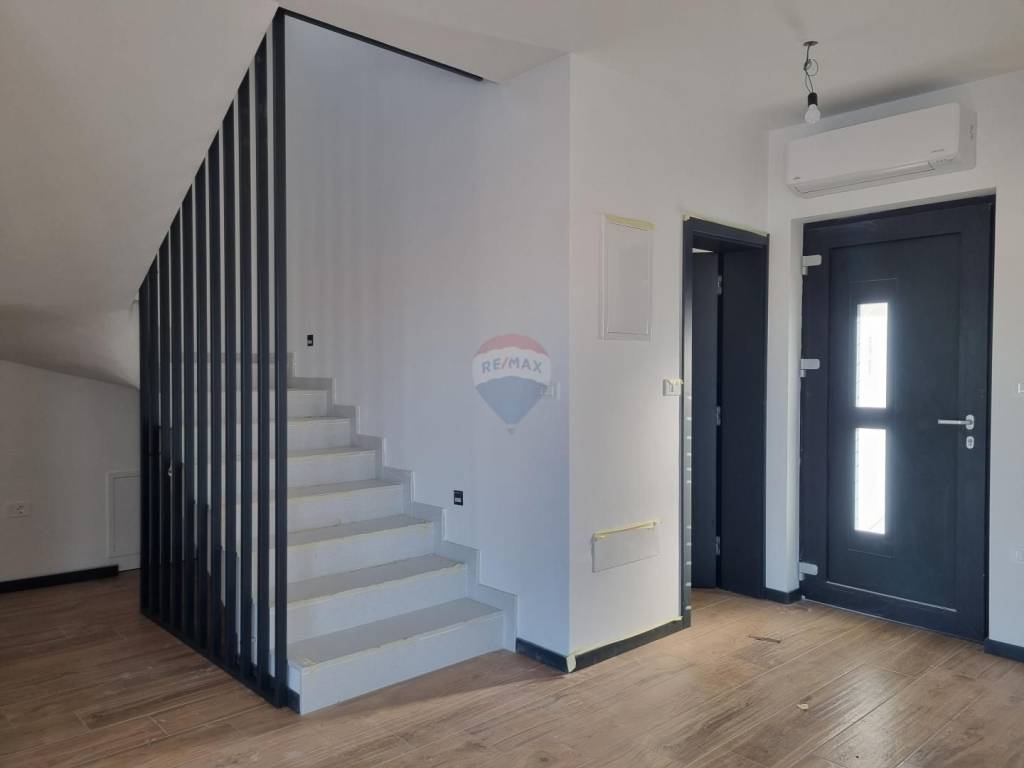 It is located on the outskirts of the village and is surrounded by new houses on one side and a forest on the other. The nearest beach is only 4 km away. A quiet and intimate environment with a beautiful view of the sea and the Alps. The house is semi-detached but on the other side it is only connected to the garage. Both houses are located on a plot of 1250 m2. The house has an area of 156 m2 and is designed with a ground floor and an upper floor.