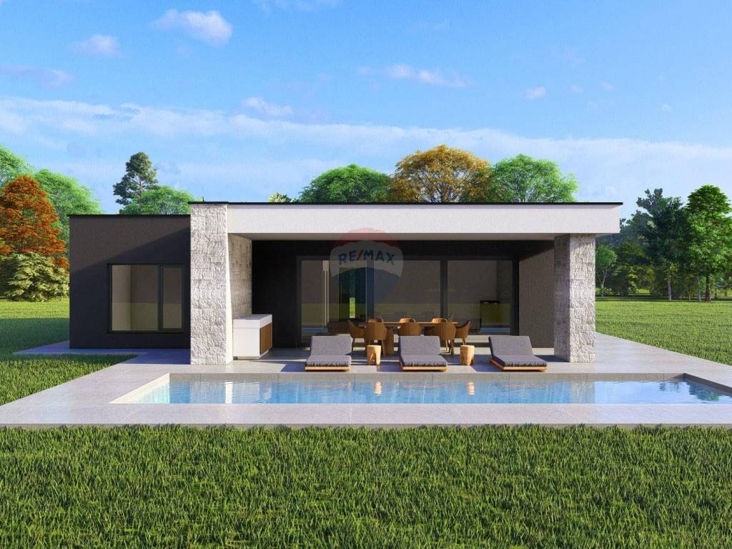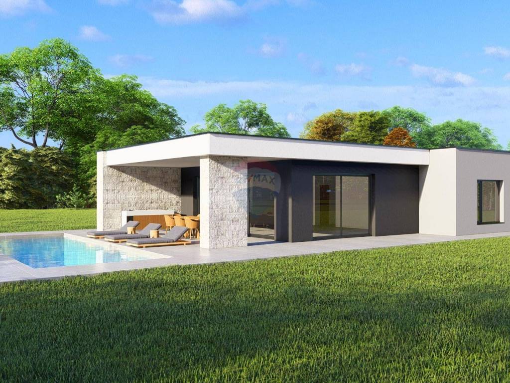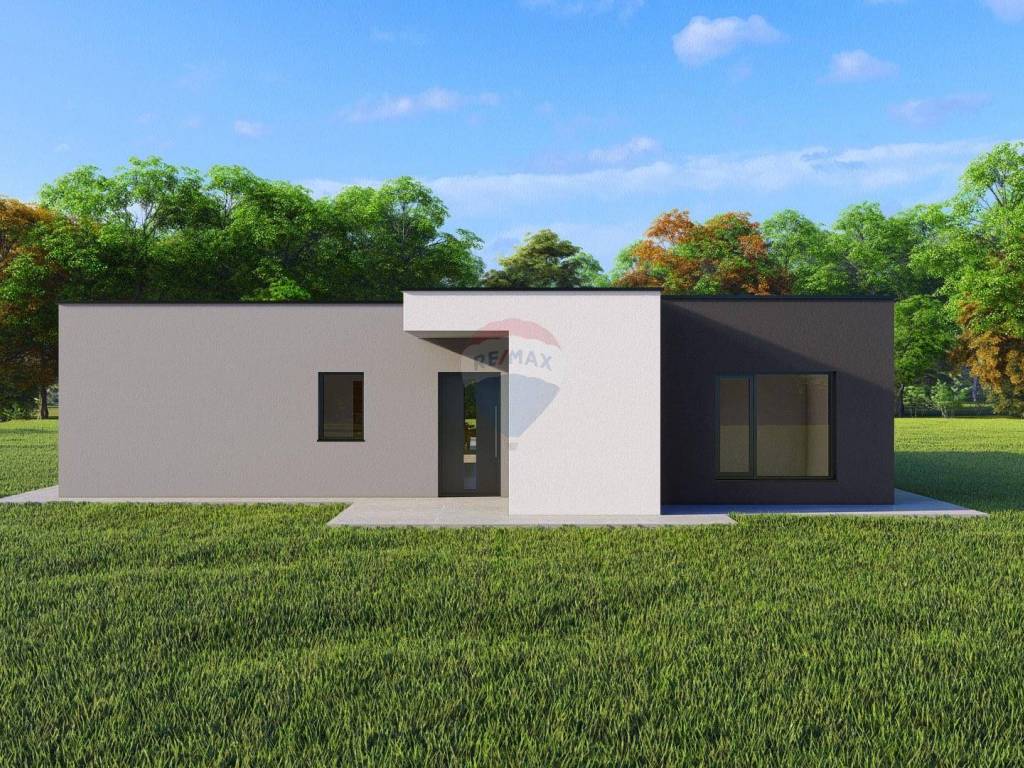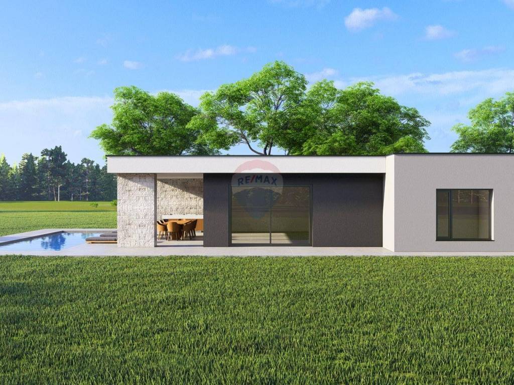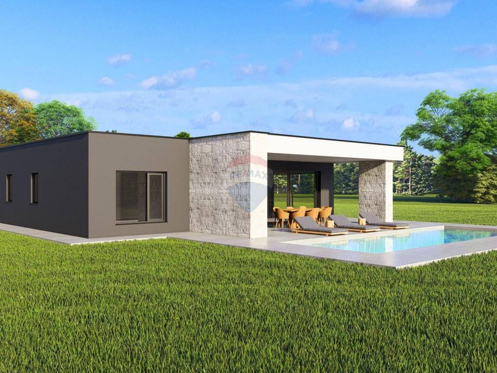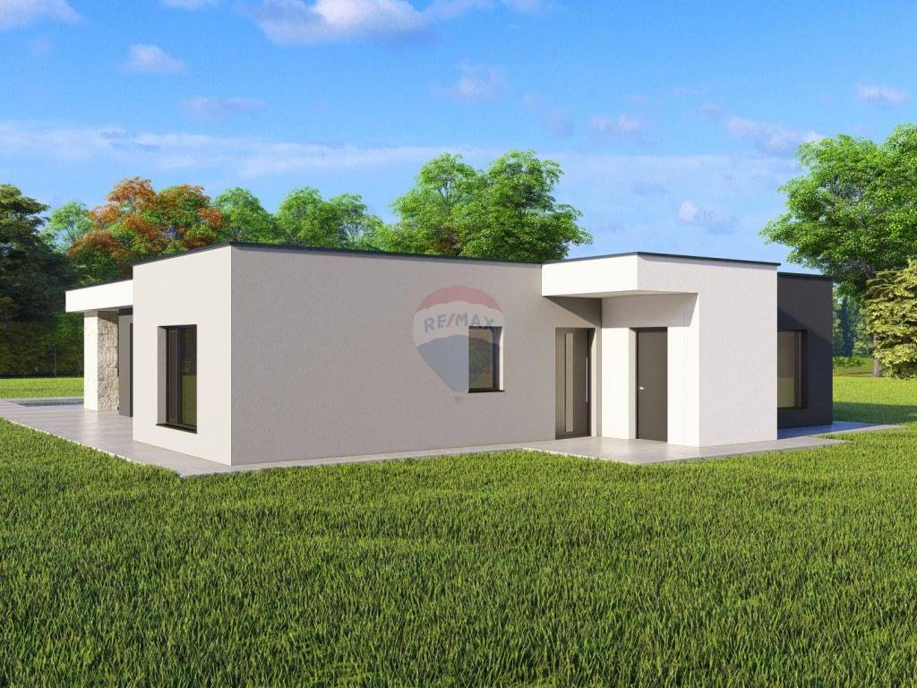 A modern single-storey house with a flat roof with a total net area of 154 m² is for sale, located on a plot of 700 m². The house is located in Žminj in a quiet environment and is ideal for family life or as an investment.