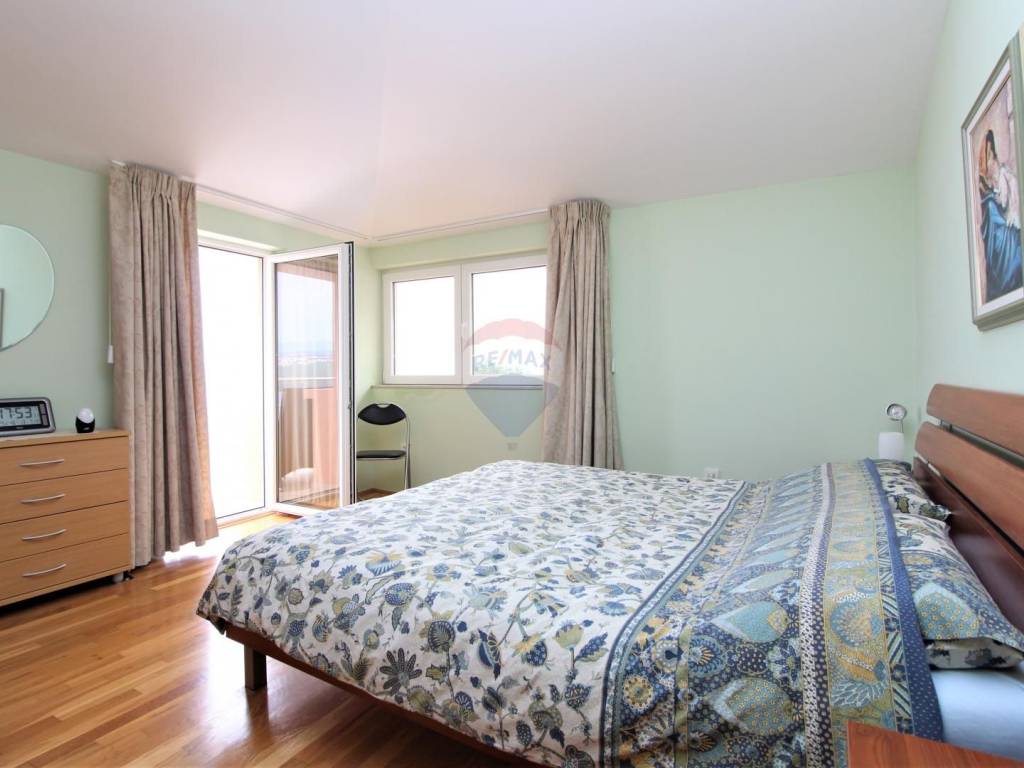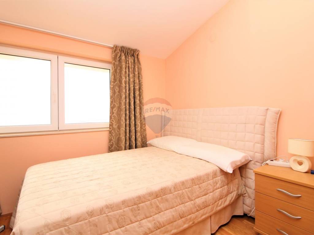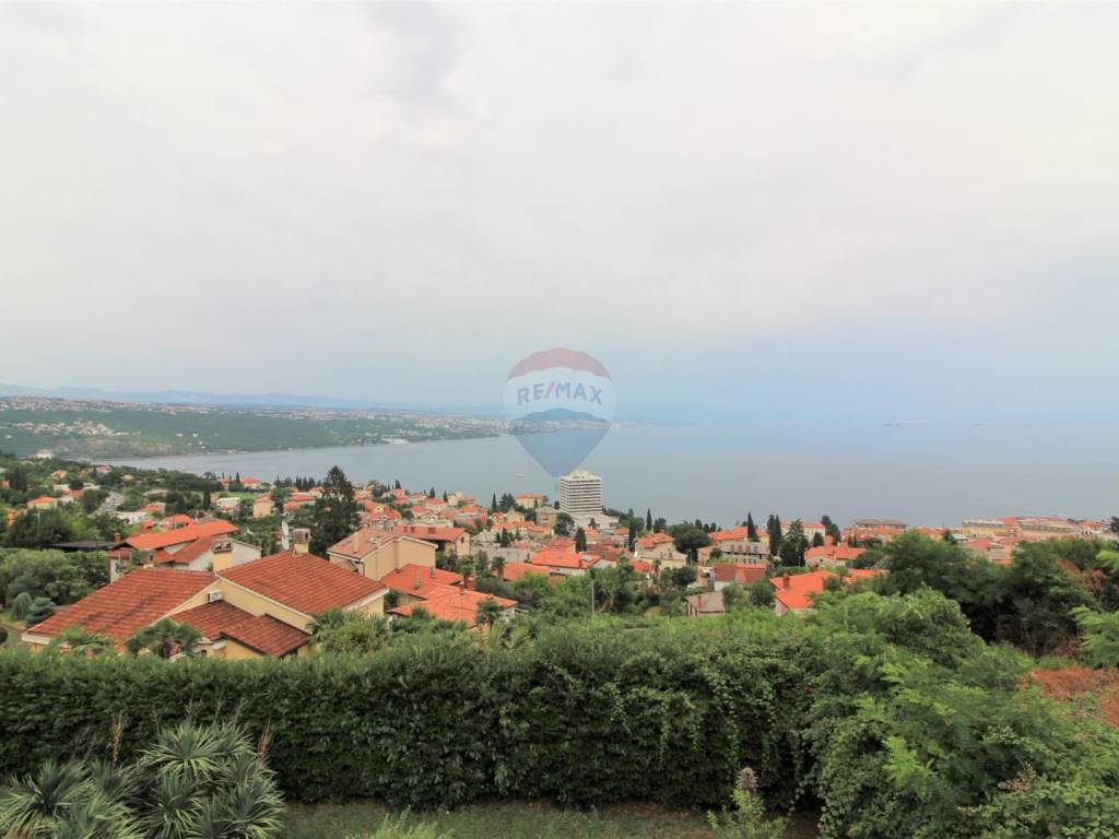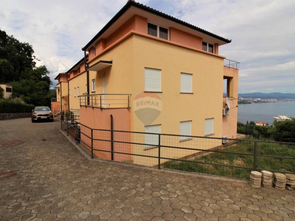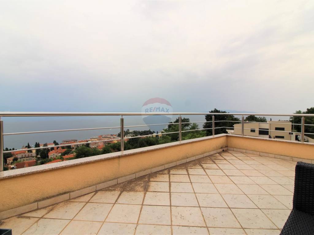 OPATIJA - 2 bedroom apartment, garage, terrace, sea view. The apartment is located in a house built in 2007 with two separate apartments; each with a separate entrance and its own garage. The apartment in question is a two-story, net area of 108.02 m2, extends through the 1st floor and a high attic, and consists of: 3 bedrooms, living room with kitchen and dining room, 2 bathrooms, hallway and 3 terraces (two facing south, one facing north); both south-facing terraces have an open view of the sea and the islands. The total square footage in the title deed of 126.58 m2 is rounded off by a garage in the basement (for one car). Heating: electric floor + pellet stove, and there is also an inverter air conditioner that heats and cool. Excellent and quiet location at the end of a dead end street, just 3 minutes by car from the sea, the beach and the center of Opatija!