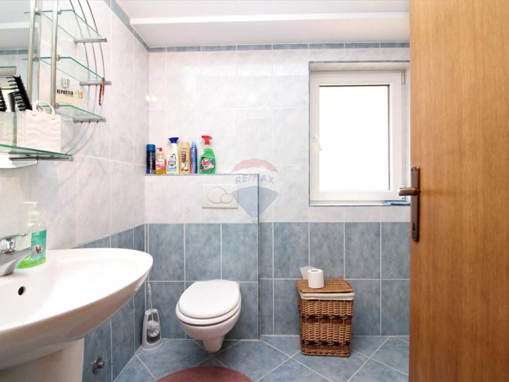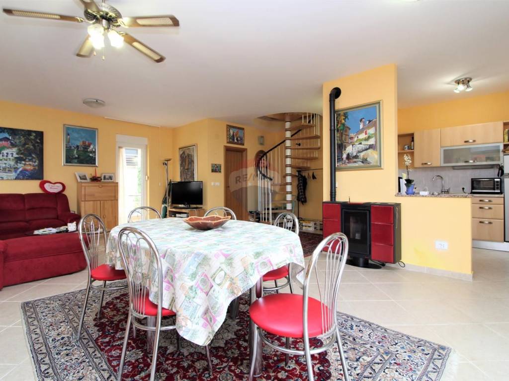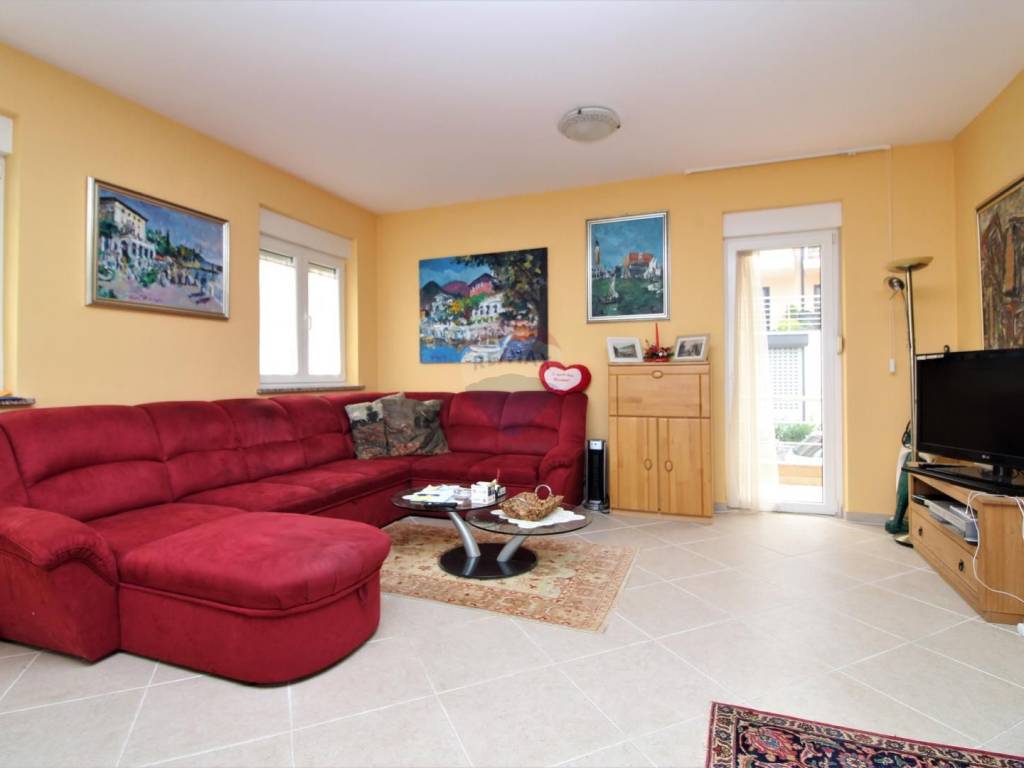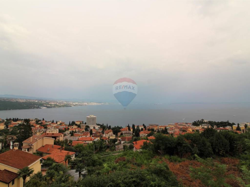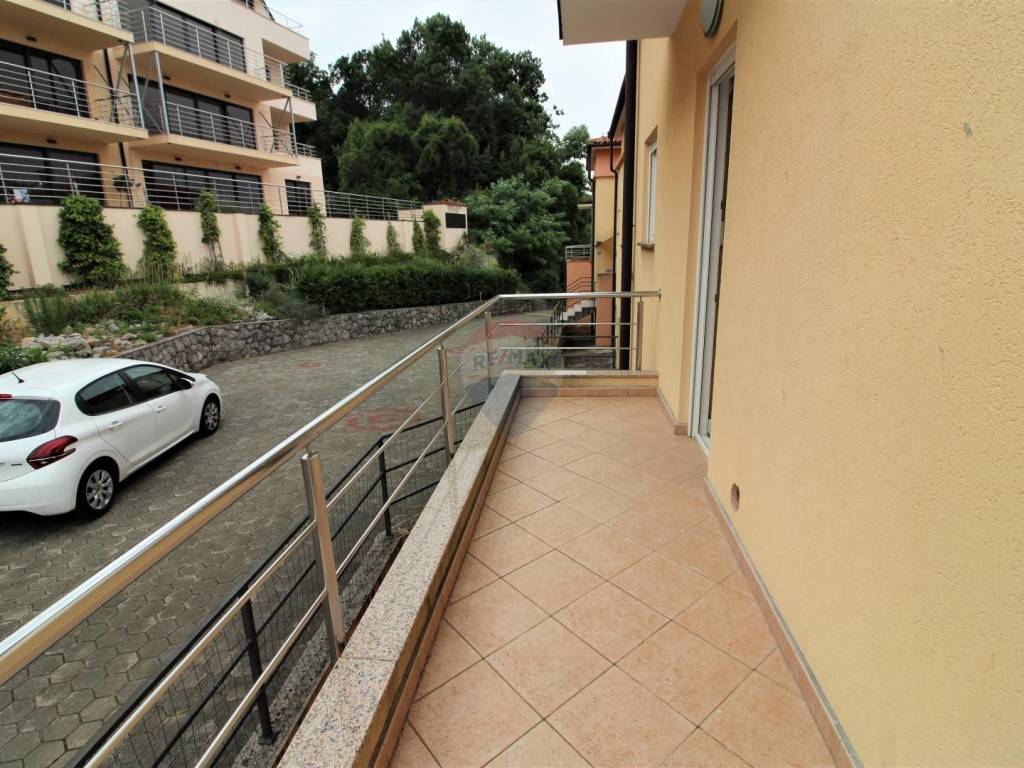 OPATIJA - 2 bedroom apartment, garage, terrace, sea view. The apartment is located in a house built in 2007 with two separate apartments; each with a separate entrance and its own garage. The apartment in question is a two-story, net area of 108.02 m2, extends through the 1st floor and a high attic, and consists of: 3 bedrooms, living room with kitchen and dining room, 2 bathrooms, hallway and 3 terraces (two facing south, one facing north); both south-facing terraces have an open view of the sea and the islands. The total square footage in the title deed of 126.58 m2 is rounded off by a garage in the basement (for one car). Heating: electric floor + pellet stove, and there is also an inverter air conditioner that heats and cool. Excellent and quiet location at the end of a dead end street, just 3 minutes by car from the sea, the beach and the center of Opatija!