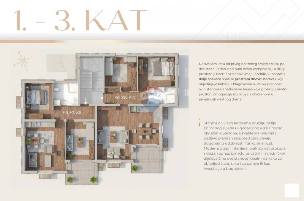 RE/MAX centar nekretnine offers a 2-bedroom + living room apartment of 77.75 m2 in a new building (2026) in a quiet location surrounded by greenery in Saršoni.