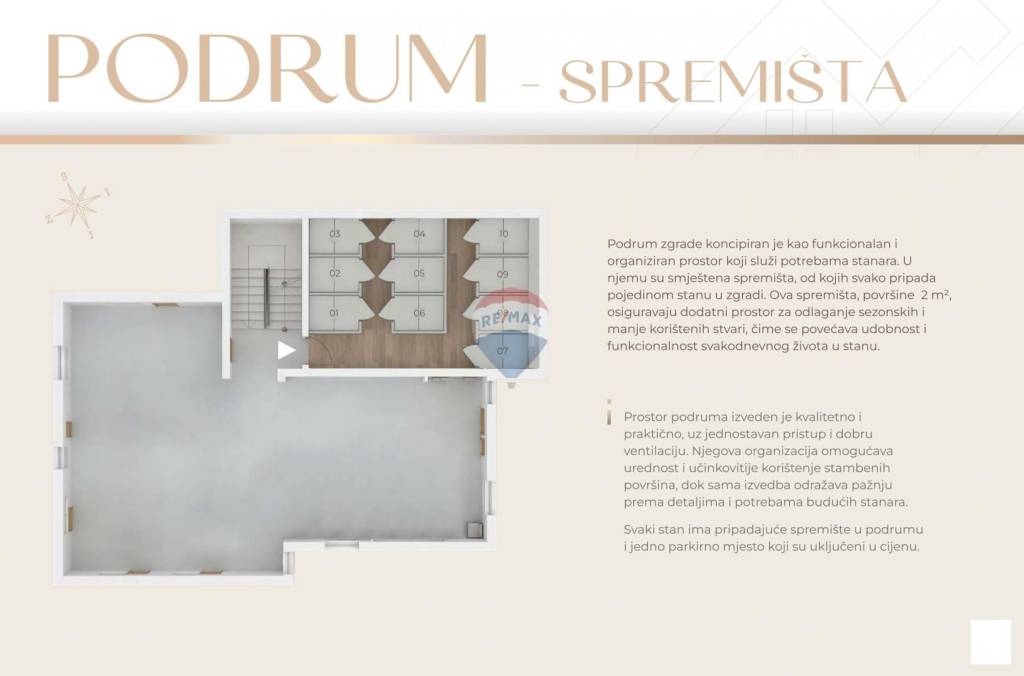 In the basement there are 2 m2 storage rooms (one for each apartment), while on the 4 above-ground floors there are a total of 8 apartments (2 apartments on each floor, all apartments are 2-bedroom + living room).