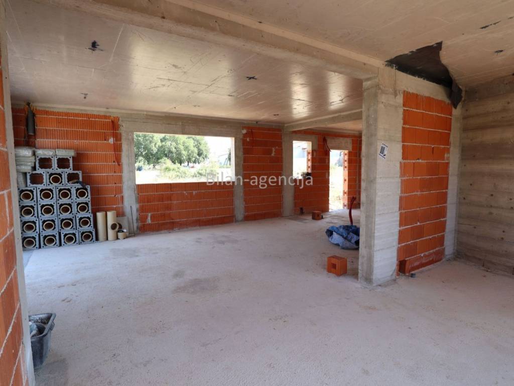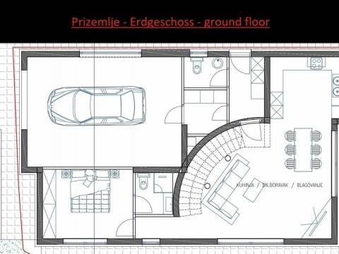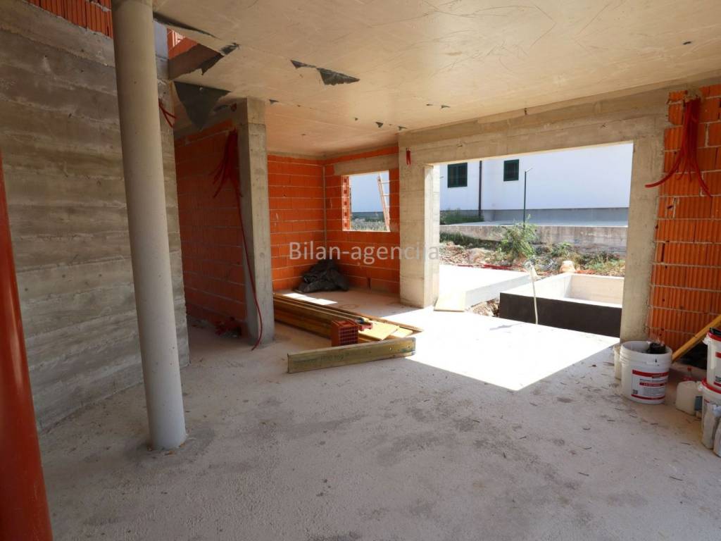 It consists of a ground floor and a first floor. On the ground floor there is a garage, hallway, toilet, bedroom, bathroom, kitchen-dining room-living room with exits to the terrace.