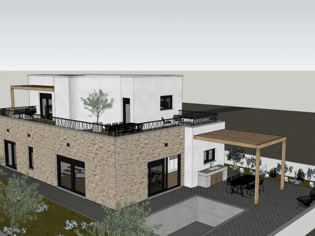 The yard with olive trees, swimming pool, barbecue, terraces oriented east-south-west, is surrounded by a concrete wall.