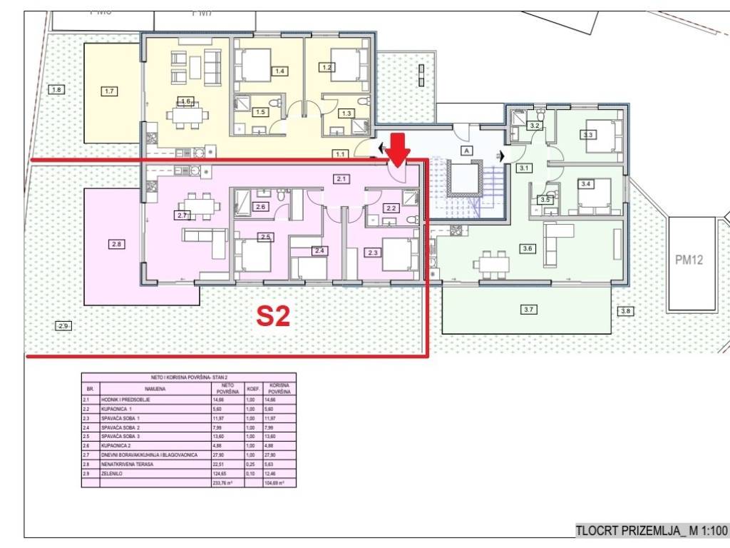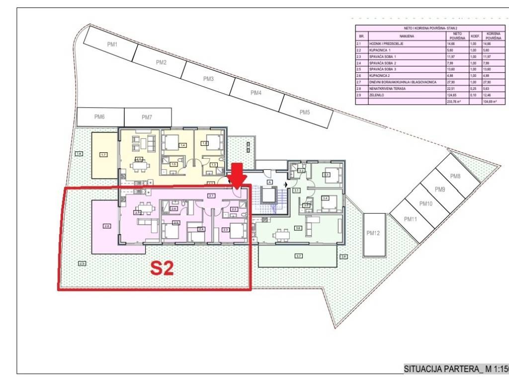 Apartment marked TS-S2 consists of 3 bedrooms, hallway and entrance hall, kitchen-dining room-living room, 2 bathrooms, terrace of 22.51 m2 and its own garden of 124.65 m2.