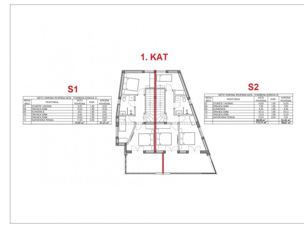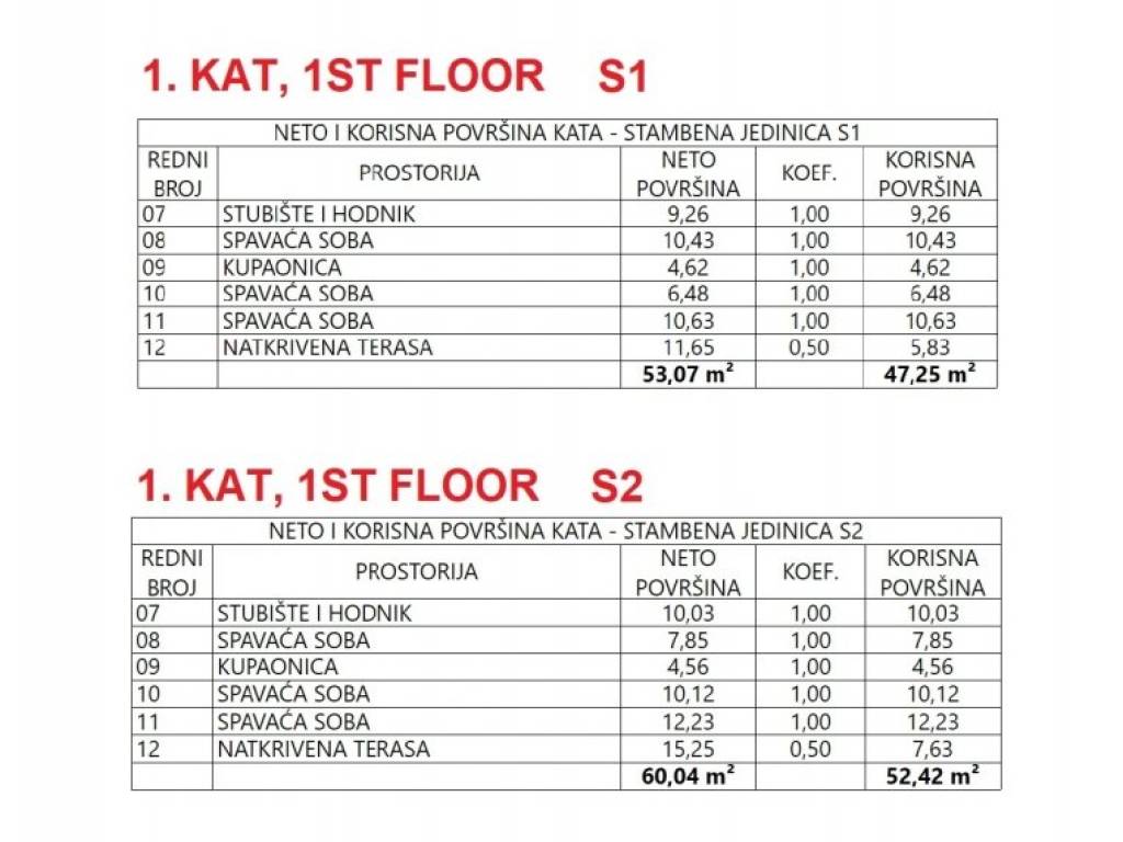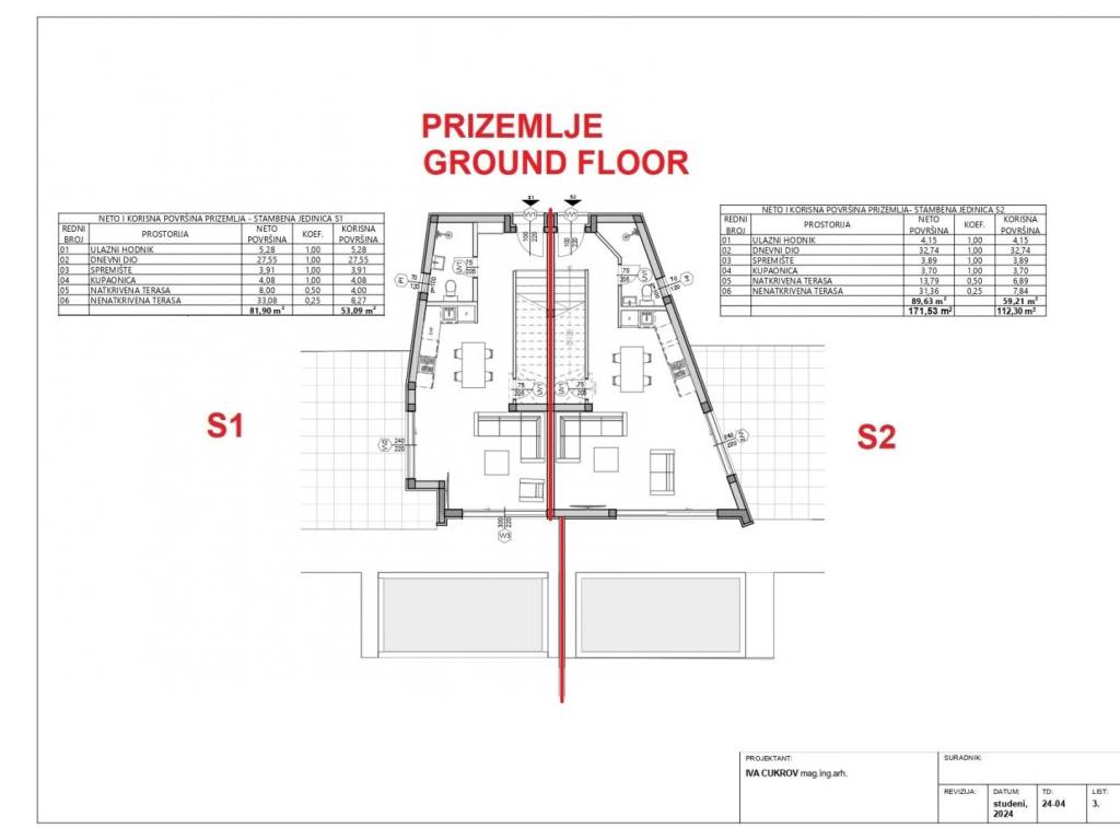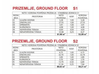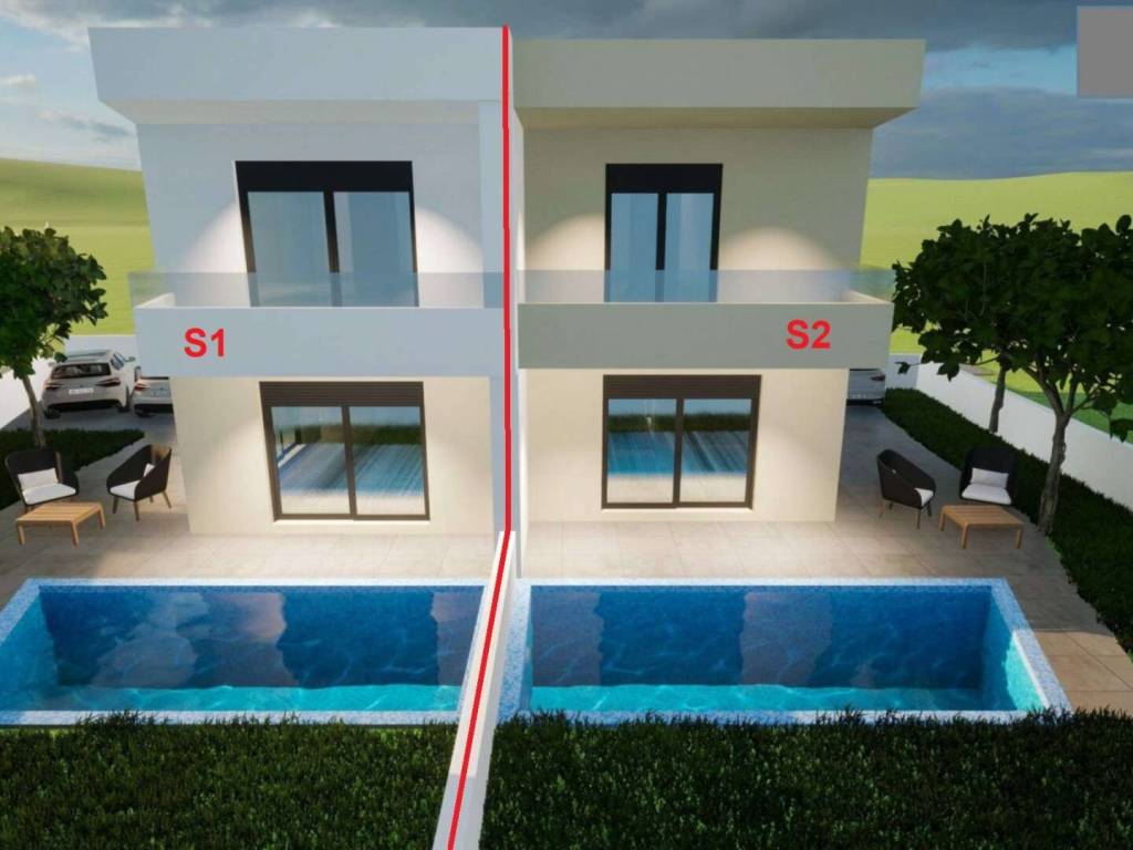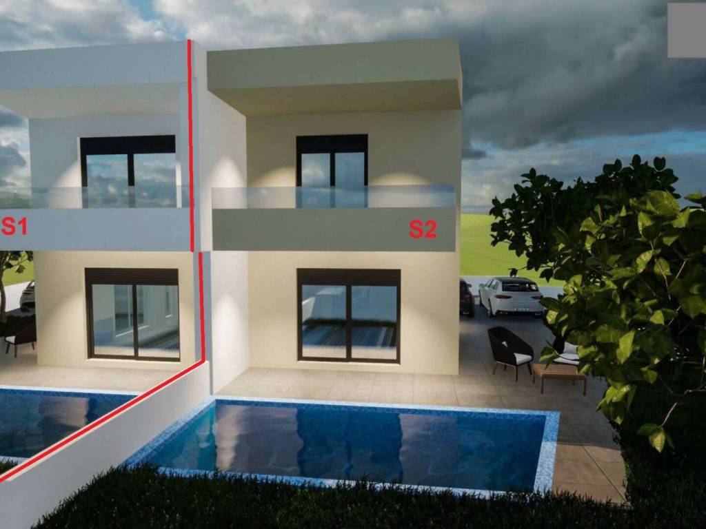 Half of the house, marked S2, consists of a ground floor and an upper floor. The ground floor has an entrance hall, living room and kitchen with dining area, storage room, bathroom, covered and uncovered terrace with access to the pool.