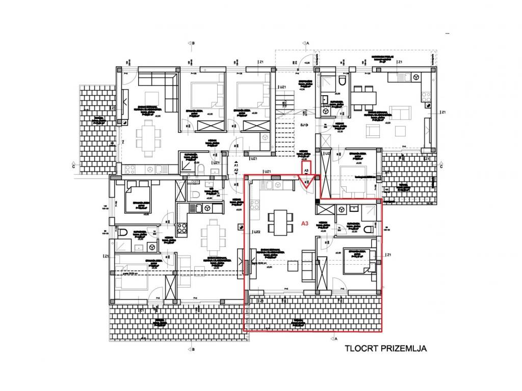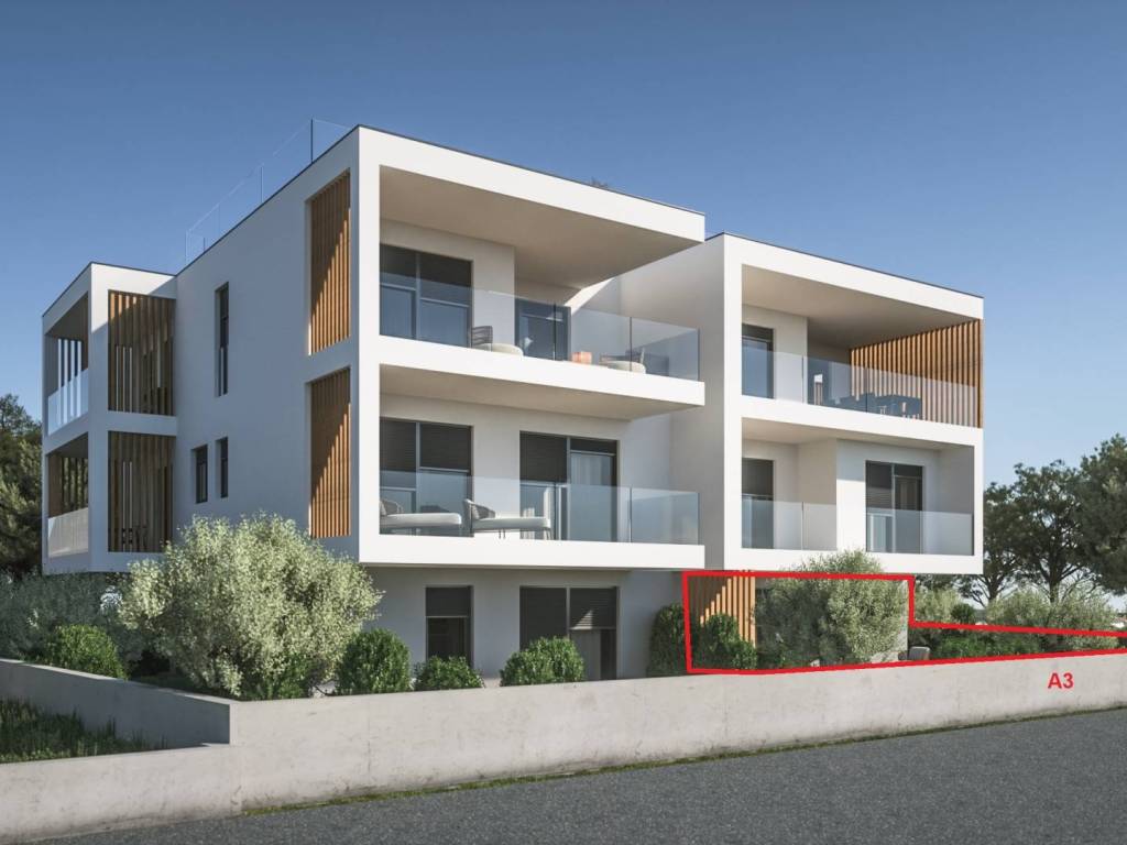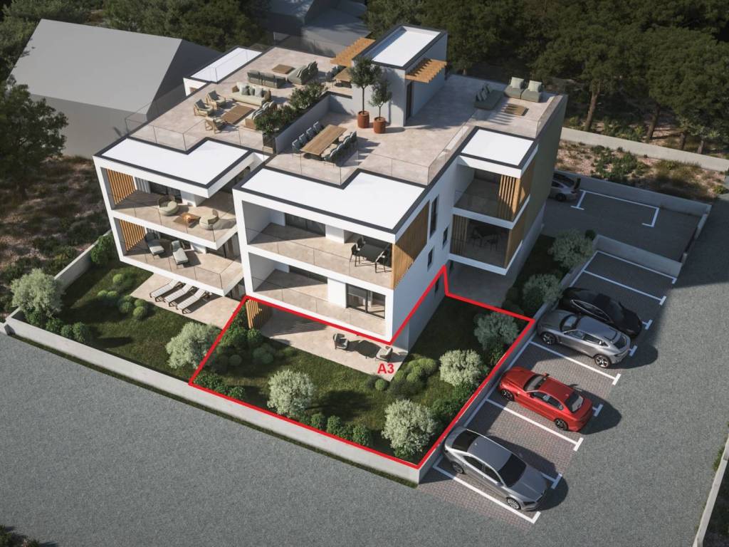 Apartment A3 consists of a kitchen-dining room-living room, bathroom, bedroom, covered terrace, garden/yard and parking space. The total and actual area of all of the above is 134.46 m2 + parking space with an actual area of 15 m2.