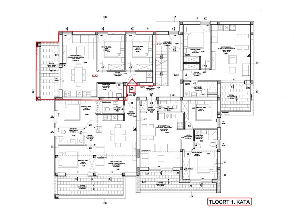 Apartment SJ2 consists of an entrance hall, kitchen-dining-living room, bathroom, bedroom, covered terrace. The apartment has 1 parking space.