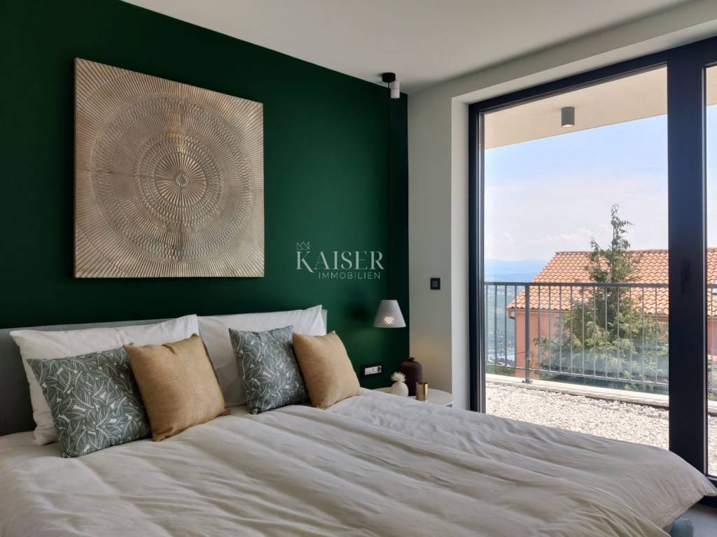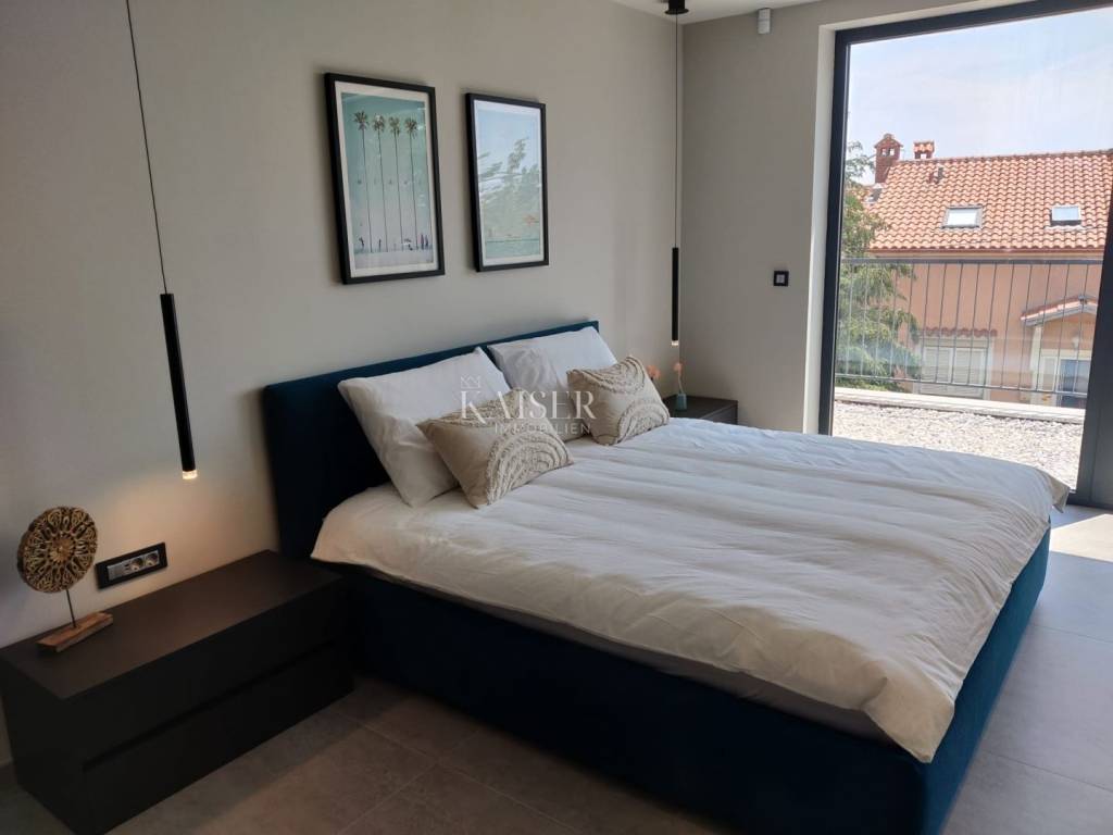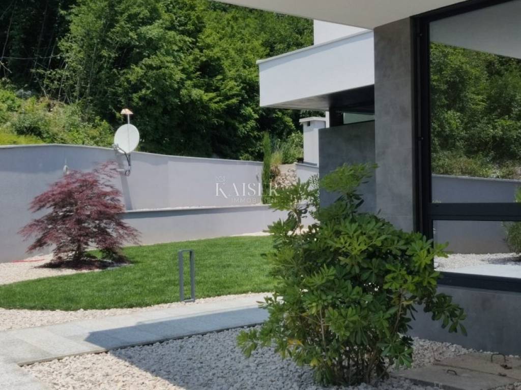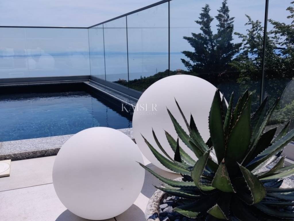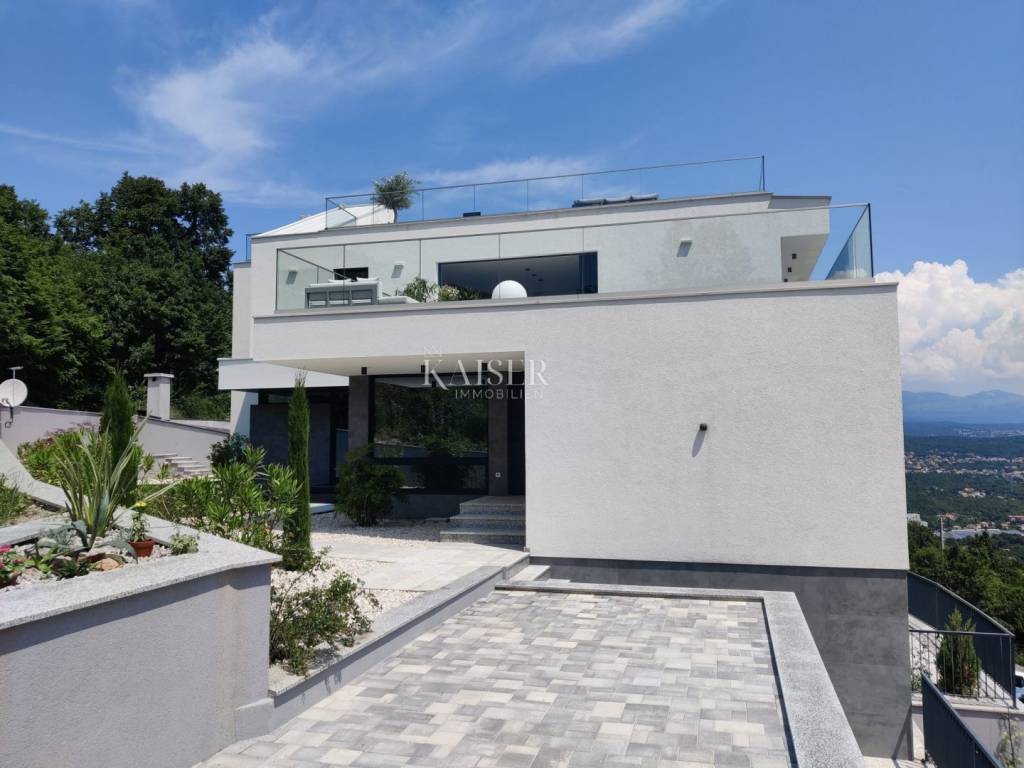 Kaiser Immobilien presents you a unique modern villa on the Opatija Riviera, just a few minutes by car from Opatija, an elegant and historically significant tourist destination with the longest tradition in Croatian tourism. Villa characteristics: Area: 290 m2, spread over three floors. Construction: Top quality materials and high standards. Heating: Central floor heating. Security: Alarm system. Swimming pool: A system for cleaning the pool using salt electrolysis. Rooms: Bedrooms: 4 rooms, each with its own bathroom. Upper floor: Open space with kitchen, dining room and large living room with access to the terrace with pool and beautiful view of Kvarner. Lower floors: Private part with bedrooms with bathrooms, sauna, fitness room and laundry room. Special features: Roof terrace: Unobstructed view of the Kvarner Bay and the city skyline of Rijeka. Yard: Decorated with enough space to enjoy the greenery of Mediterranean plants. Parking: Several parking spaces in front of the villa. Additional Information: Large glass walls provide spaciousness and light in all rooms, while stylish custom-made furniture adds to the comfort and luxury of this villa. Do not miss the opportunity to become the owner of this unique property in one of the most desirable locations on the Adriatic. For more information and to arrange a viewing, feel free to contact the agent at +385 995677888 or at email: info@kaiser-immobilien.hr Kaiser Immobilien - Your partner for luxury real estate. Distance of the property from EU cities: Munich: 533 km Vienna/Vienna: 514 km Prague: 840 km Budapest, Hungary: 595 km