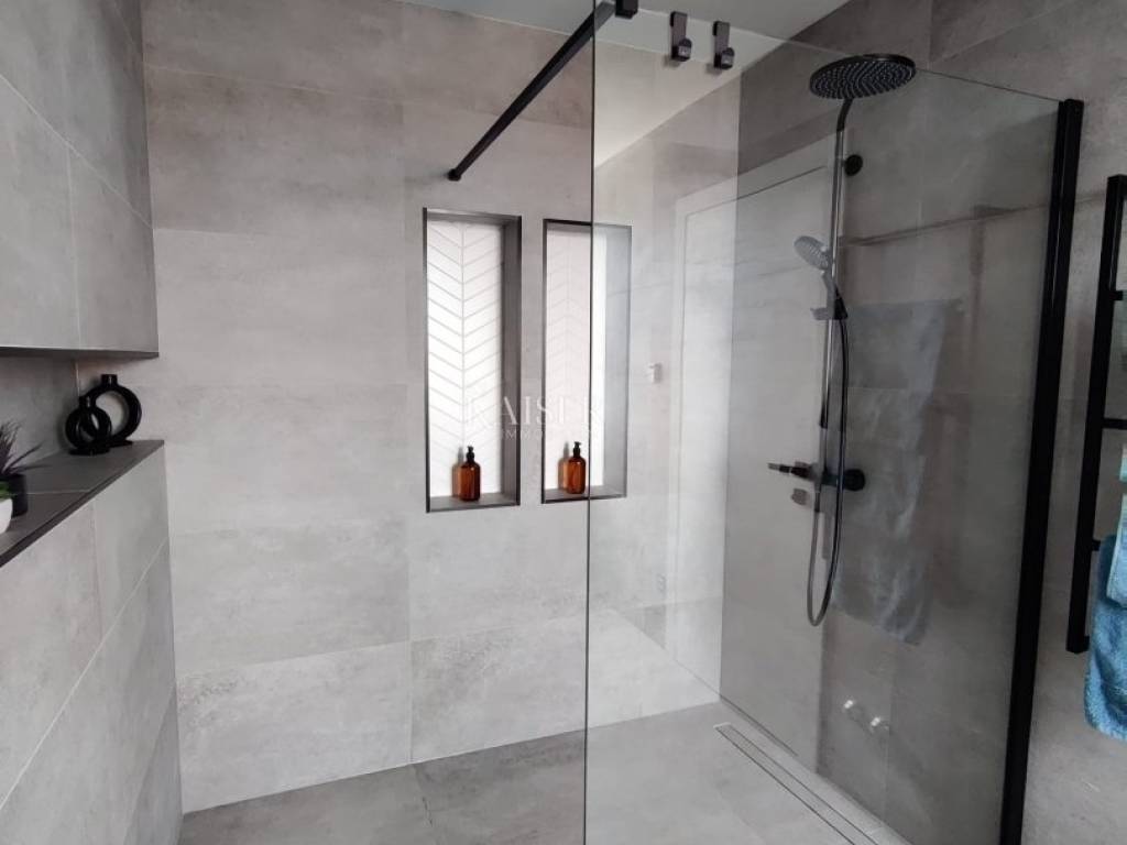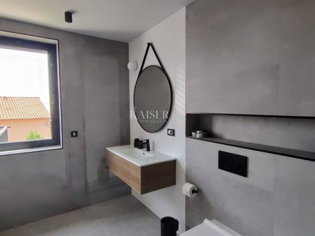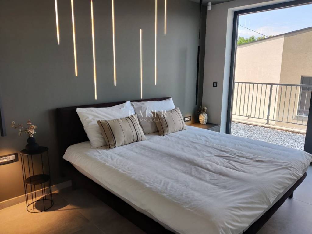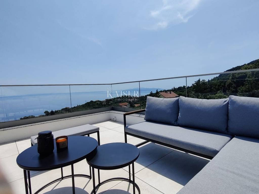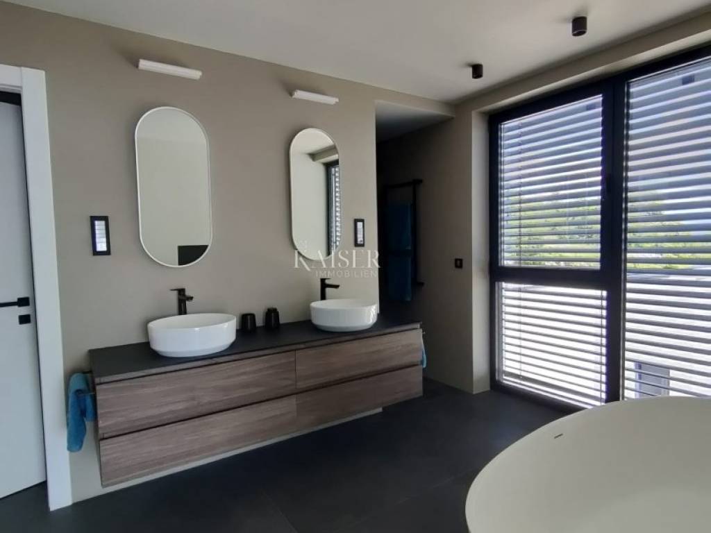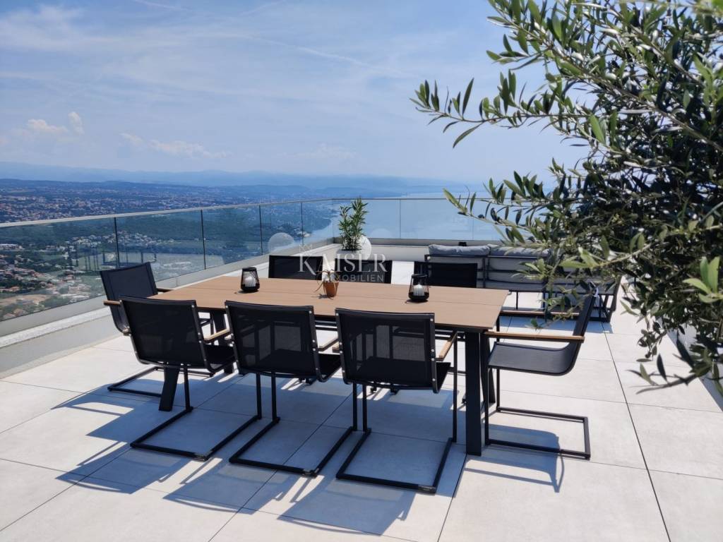 Kaiser Immobilien presents you a unique modern villa on the Opatija Riviera, just a few minutes by car from Opatija, an elegant and historically significant tourist destination with the longest tradition in Croatian tourism. Villa characteristics: Area: 290 m2, spread over three floors. Construction: Top quality materials and high standards. Heating: Central floor heating. Security: Alarm system. Swimming pool: A system for cleaning the pool using salt electrolysis. Rooms: Bedrooms: 4 rooms, each with its own bathroom. Upper floor: Open space with kitchen, dining room and large living room with access to the terrace with pool and beautiful view of Kvarner. Lower floors: Private part with bedrooms with bathrooms, sauna, fitness room and laundry room. Special features: Roof terrace: Unobstructed view of the Kvarner Bay and the city skyline of Rijeka. Yard: Decorated with enough space to enjoy the greenery of Mediterranean plants. Parking: Several parking spaces in front of the villa. Additional Information: Large glass walls provide spaciousness and light in all rooms, while stylish custom-made furniture adds to the comfort and luxury of this villa. Do not miss the opportunity to become the owner of this unique property in one of the most desirable locations on the Adriatic. For more information and to arrange a viewing, feel free to contact the agent at +385 995677888 or at email: info@kaiser-immobilien.hr Kaiser Immobilien - Your partner for luxury real estate. Distance of the property from EU cities: Munich: 533 km Vienna/Vienna: 514 km Prague: 840 km Budapest, Hungary: 595 km