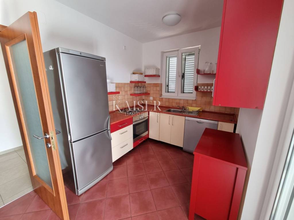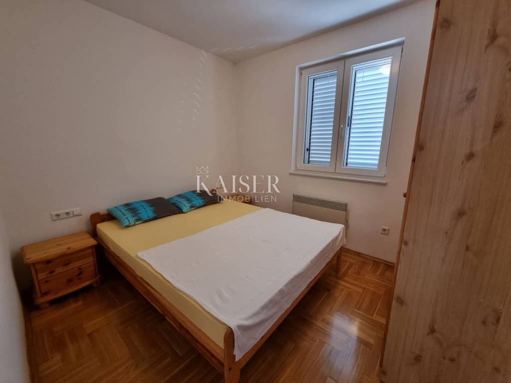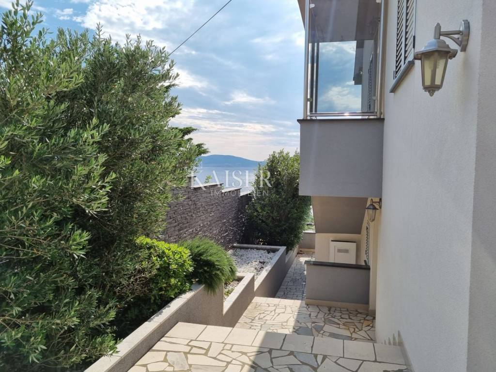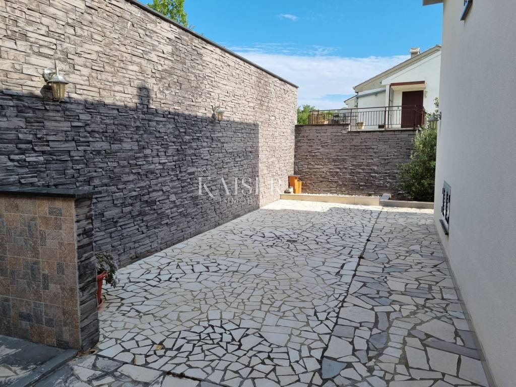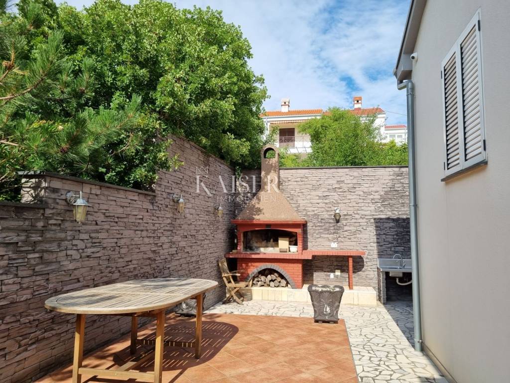 Kaiser Immobilien mediates the sale of a beautiful house near Novi Vinodolski, in the quiet settlement of Klenovica. The house consists of two apartments, arranged as apartments with a total area of 210m2. On the ground floor is the first apartment, which consists of one bedroom, living room, kitchen and bathroom. The second apartment is located on the first floor and consists of a spacious living room, kitchen, two bedrooms, bathroom, and a spacious terrace of 30 m2 with a wonderful view of the sea and the island of Krk. The yard and yard is beautifully landscaped with Mediterranean plants and greenery, providing a peaceful environment and a sense of privacy. There are two parking spaces in the garden, a large garage for one to two cars, and an outdoor parking opposite the house. Behind the house there is a space for socializing and barbecuing. The location of this property is extremely favorable, considering the proximity to beaches, restaurants and all other facilities that Klenovica offers. The distance from the sea is 500m.