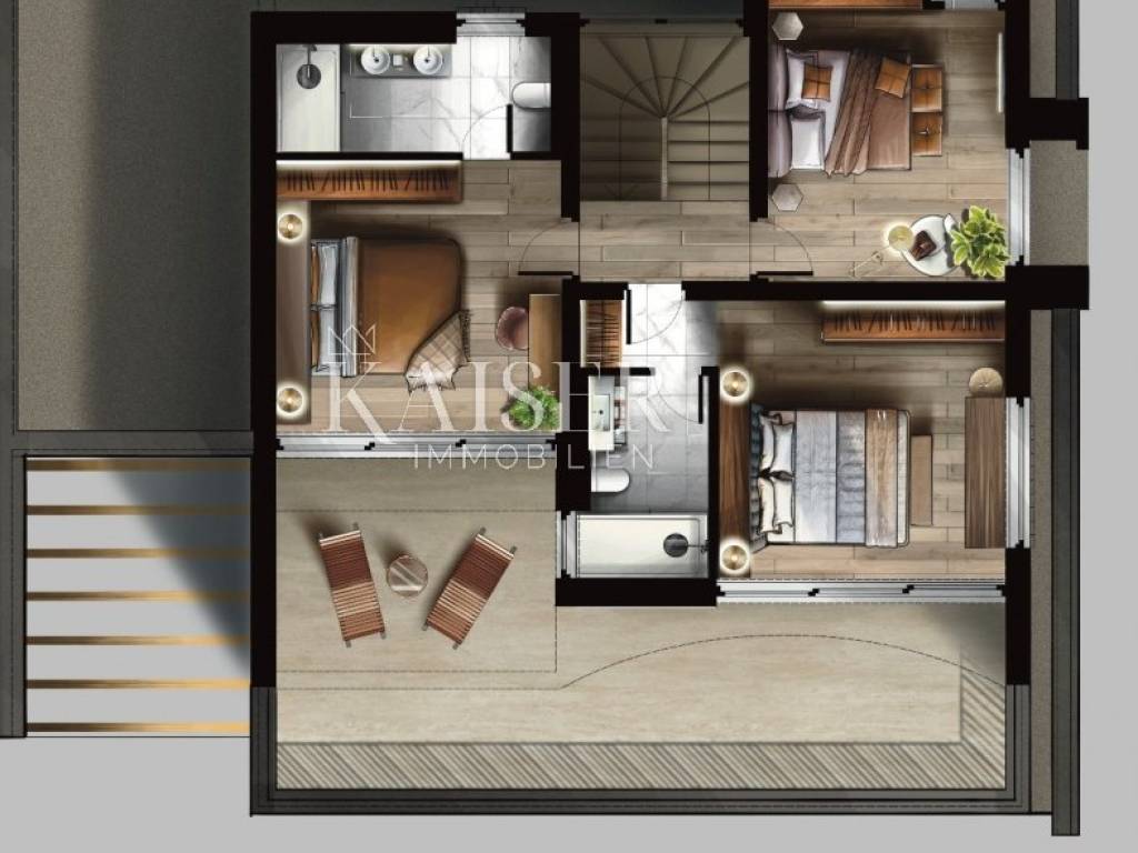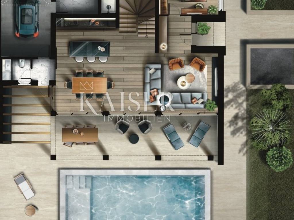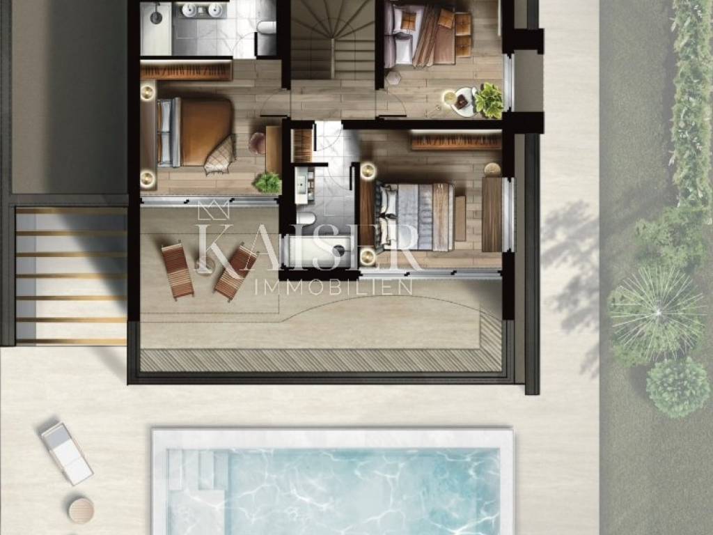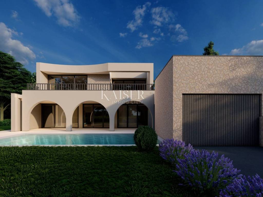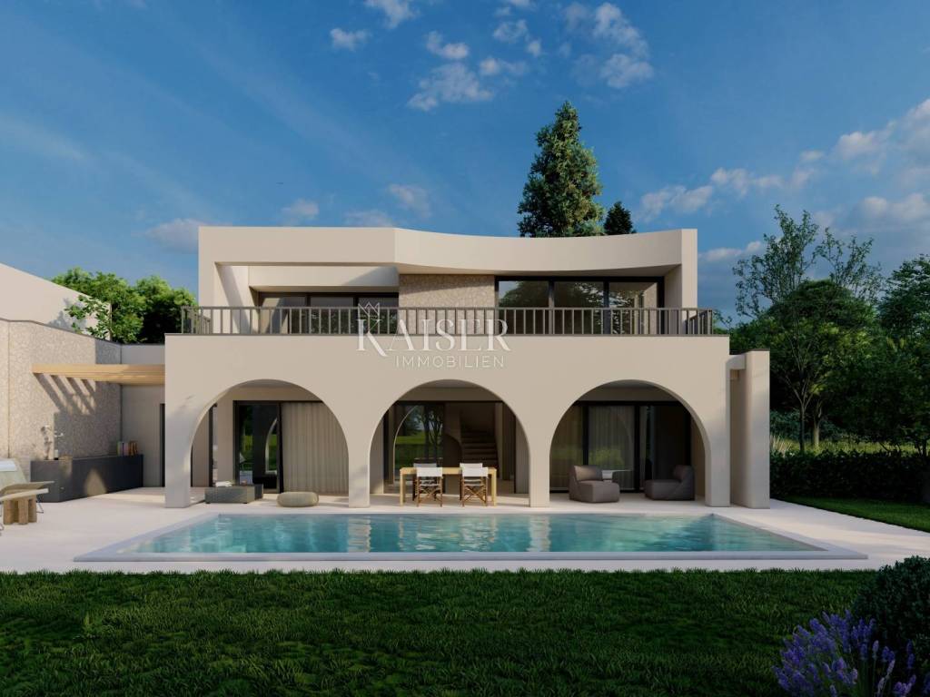 Kaiser Immobilien offers for sale a very attractive modern villa with a sea view. The villa was designed as one half of a semi-detached building, on its own fenced plot of 630m2. The storeys of the villa are ground floor and 1st floor, and the view of the sea is already possible from the ground floor. The villa is located in a wonderful location 10 km from Poreč in a quiet place with all the amenities of famous restaurants and wineries. During the planning of the project, special attention was paid to the design of the villas and their arrangement of rooms according to the highest standards of modern living. The total area of the house with terraces is 290 m2. The ground floor consists of a garage, a storage room, an entrance, a toilet, a bathroom, a bedroom with its own bathroom, a large living room with a kitchen and a dining room with a total area of 130 m2. There are three bedrooms on the first floor, each with its own bathroom, with a total area of 79 m2. The pool in front of the villa is 42 m2. Living rooms, as well as terraces, are optimally oriented to the south or west. The heat pump takes care of underfloor central heating as well as hot water supply. The bedrooms and the living-dining room are air-conditioned. A smart home system will be installed. The smart house system includes lighting management, management of building services (individual room control, floor heating) and shading control. If desired, it is possible to install more smart services for a surcharge. The completion of the villa is planned for the end of 2024. The possibility of agreement on the final decoration of the interior according to the wishes of the customer.