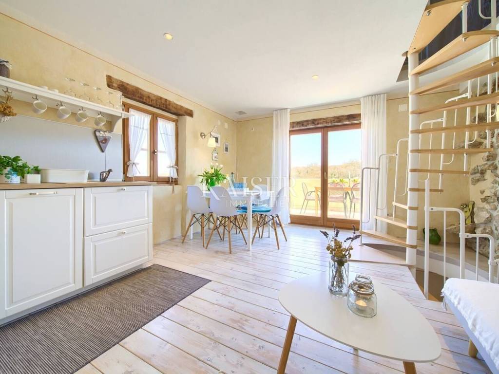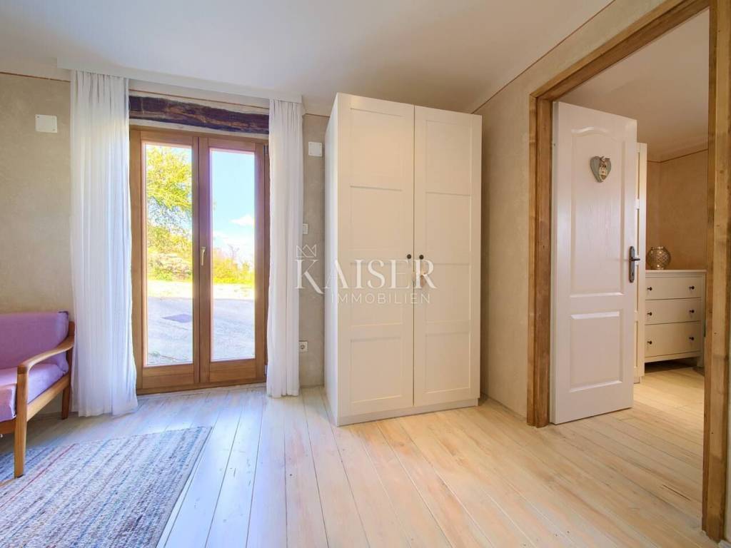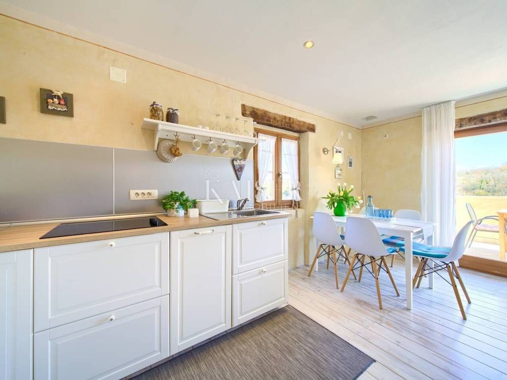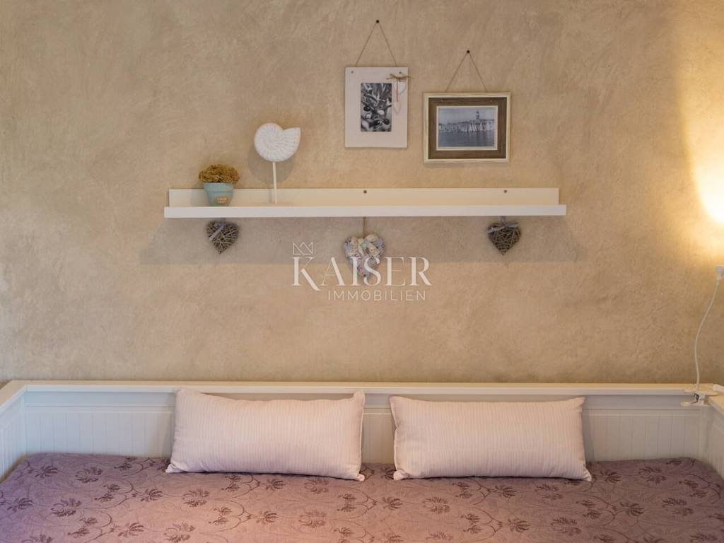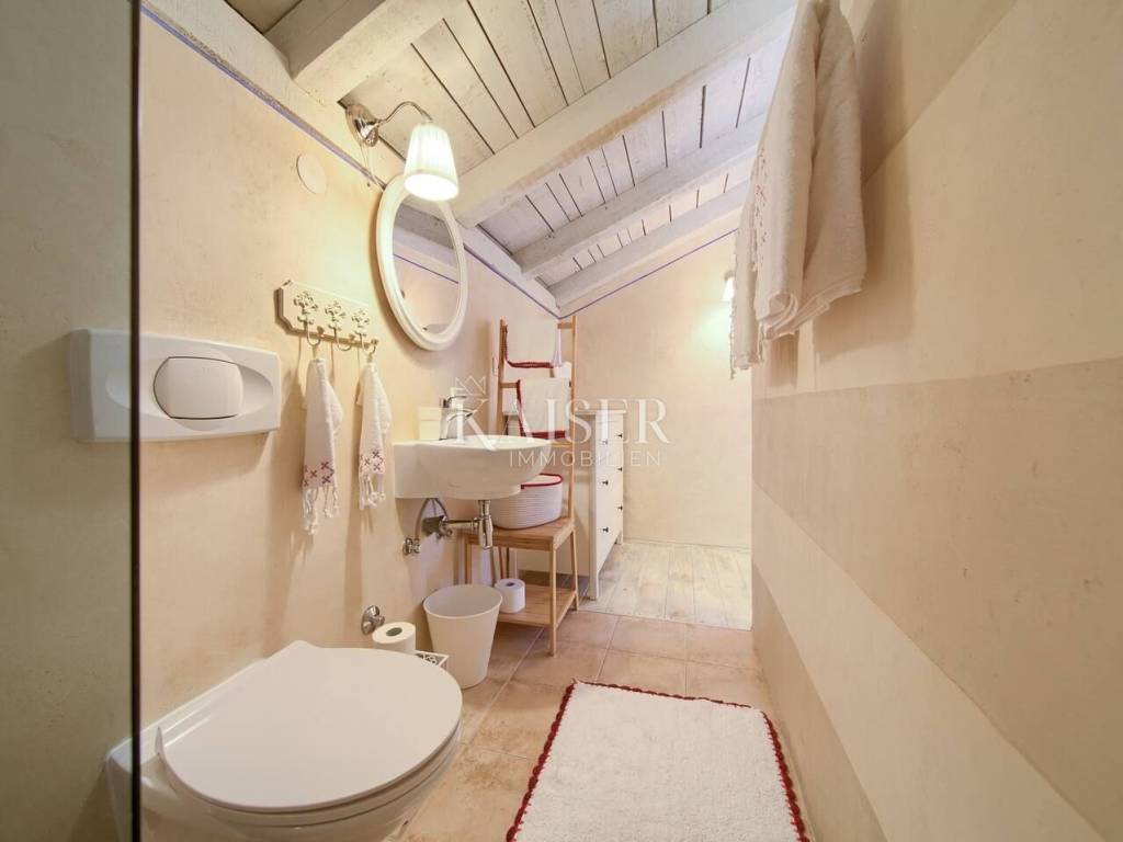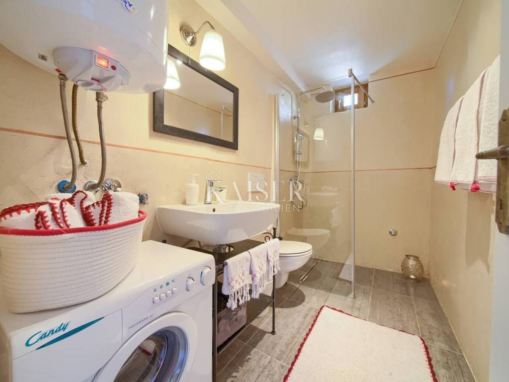 Dobrinj is a picturesque historical village located in the northeastern part of the island of Krk, on top of a hill that offers a beautiful view of the surrounding green valleys and the sea. Its history goes back far into the past, and the place is known for its rich cultural heritage, authentic architecture and preserved traditional island ambience. Kaiser Immobilien presents this charming house of 71.47 m², located in a peaceful setting with a beautiful view of nature and the sea in the distance. Only 3.5 km from the nearest sandy beach, this property offers the perfect combination of privacy, natural surroundings and the comfort of modern life. The villa can be reached via narrow city streets or a 300-meter-long macadam road. The house has two separate entrances - one on the ground floor and the other on the first floor, which allows for a functional distribution of space. On the first floor (22.43 m²) there is a bright living room connected to a new full-house style kitchen equipped with a dishwasher and a combined refrigerator. The living area opens onto a spacious 10.45 m² terrace, which offers spectacular views of the sea, green hills and Kvarner Bay. The ground floor (29.42 m²) includes a comfortable living room equipped with satellite TV and a sofa bed (160x200 cm), a bathroom with shower (3.93 m²) and a separate bedroom (11.70 m²) with a double bed (160x200 cm). In the attic (16.32 m²) there is another spacious bedroom with a double bed (160x200 cm) and a private bathroom (3.30 m²). Air conditioning is provided by a Korel device. The floors are connected by a spiral staircase. The villa's 450m2 garden is perfectly designed for enjoying the outdoors. A hot tub, an outdoor kitchen with a barbecue, a dining table, deck chairs and an outdoor shower create an ideal place to relax on warm days. For the colder months, there is an additional garden shed with toilet and IR sauna. The property has a private parking space, and all key amenities are in close proximity – a post office, supermarket and two restaurants serving local food are just 150 meters from the house, on the main square. Heating is provided by air conditioning and a wood stove located on the ground floor, which allows for a comfortable stay all year round. This house is the perfect place to relax in peace and nature, whether as an ideal family retreat, a weekend home or an investment for tourist rental. Proximity to amenities: Shop: 100 m Restaurant: 100 m Beach: 3.5 km Playground: 100 m Viewpoint: 150 m Post office: 100 m Malinska: 9 km Krk: 14km Vrbnik: 13 km Airport: 17 km Dobrinj- Ljubljana: 150 km Dobrinj- Budapest: 500 km Dobrinj- Munich: 550 km Dobrinj- Vienna: 520 km Dobrinj- Prague: 850 km The agency commission for the buyer is 3% + VAT and is paid in the case of purchasing a property, upon conclusion of the first legal act. ID-CODE: 127-054 If you would like to visit the property in person, please contact: Jennifer Hofmann E-mail: jennifer@kaiser-immobilien.hr Tel: +385-91-515-0887 http://kaiser-immobilien.hr/