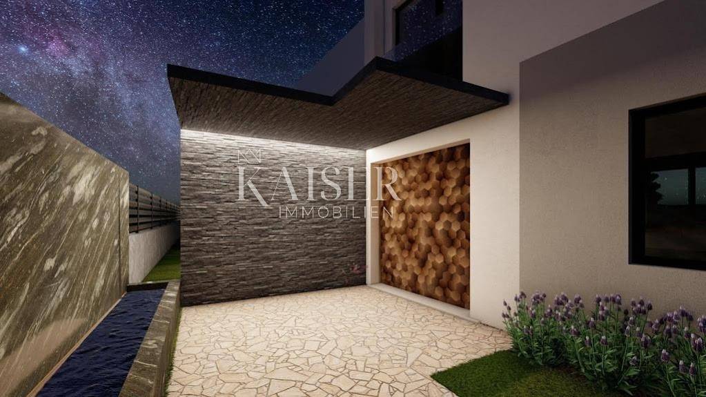 Kaiser Immobilien presents an apartment on the first floor of a luxury villa under construction in Nova Vasa near Poreč. The modern building with luxury apartments and sea view will have four residential units. The apartment is located on the first floor of a building with a total area of 96.56m2 and consists of an entrance hall, three spacious bedrooms, two bathrooms and an additional toilet for guests. The living room, dining room and kitchen are designed according to the open space concept and provide spaciousness complemented by the exit to the terrace, the size of which is 15.95 m2. The entire living area has access to a covered terrace with a jacuzzi and a panoramic view of the sea. The apartment is built of very high quality materials. The floors are covered with stone, ceramic or wood depending on the purpose. The external carpentry is aluminum, three-layer glazed with Thermopan glass, while the internal carpentry is wooden. Heating and cooling is provided by multi-splt inverter air conditioners. There is a covered parking lot in front of the building, and each apartment has two parking spaces. The expected completion of construction is the twelfth month of 2023. For more information and a viewing, please contact your agent.