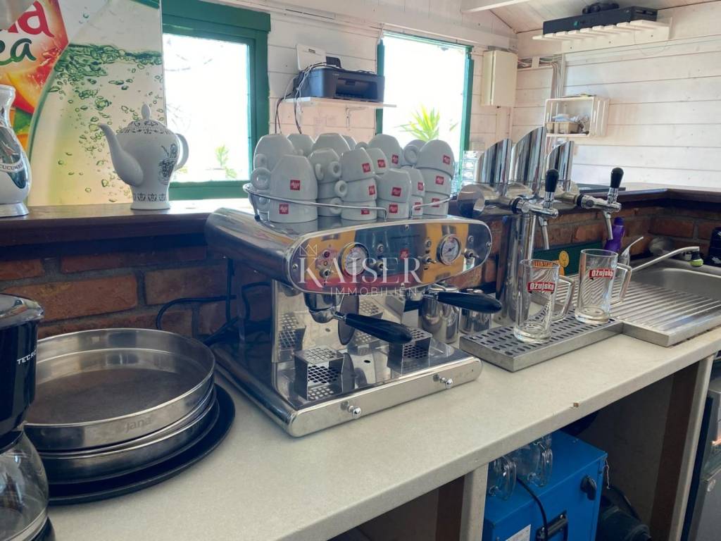 Objekt je smješten u kućici koja sadrži sve potrebno za uspješno vođenje ugostiteljskog posla. U sklopu kućice nalaze se šank, perilica suđa, ledomat, kuhinjska oprema (termoblok, friteza, roštilj, kuhala), dupli hladnjak te kompletan inventar za posluživanje i kuhanje. Uz to, objekt je opremljen razglasom, pojačalom za terasu te videonadzorom.