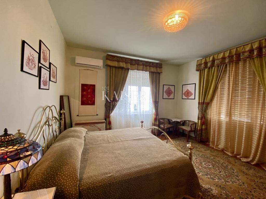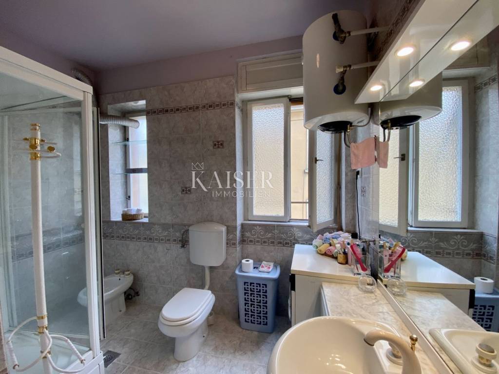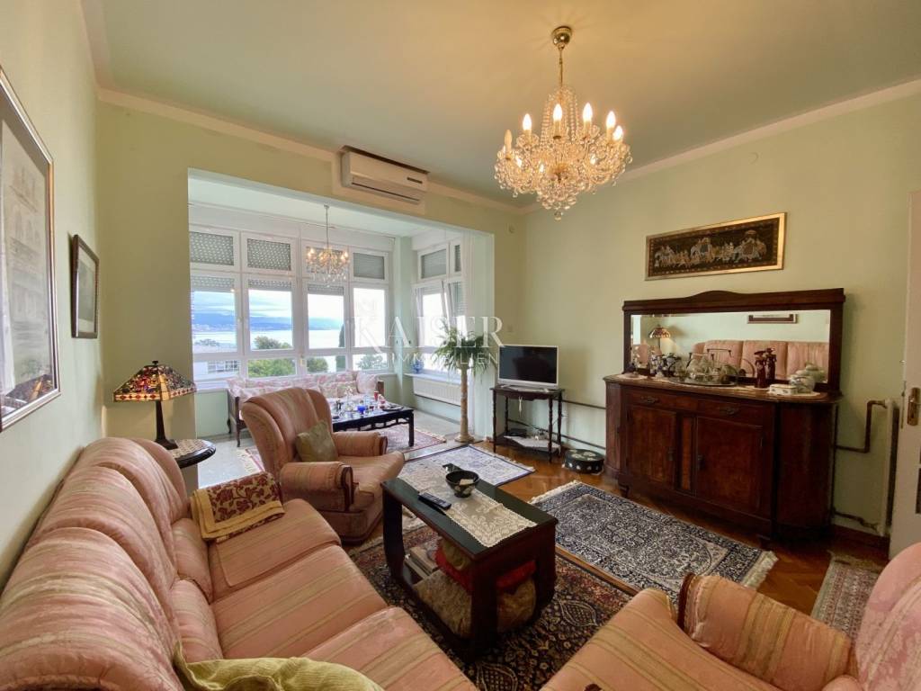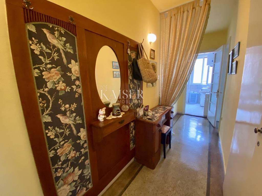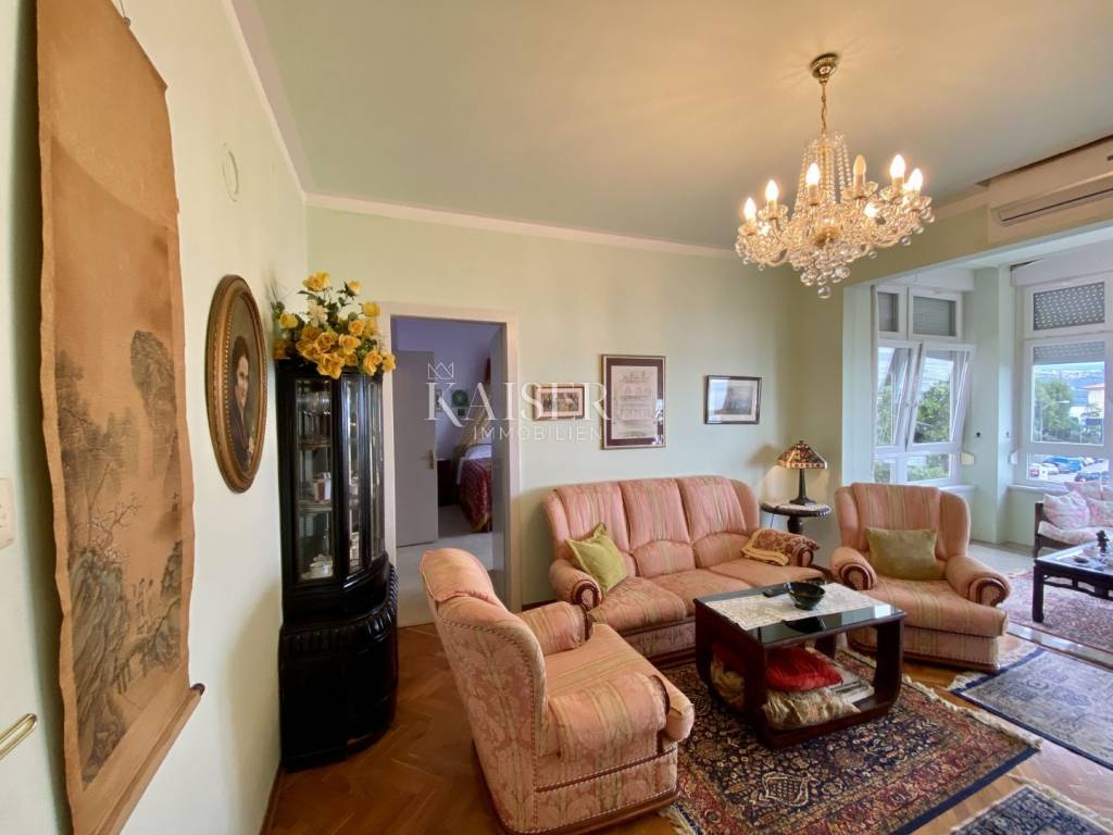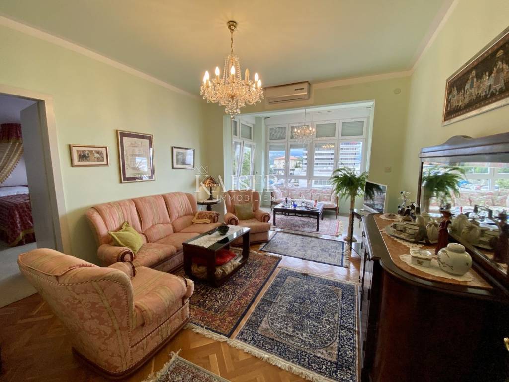 Kaiser Immobilien presents a wonderful apartment that occupies one entire floor of a historic villa in the very center of Opatija, 100 meters from the beach, accessible directly from the garden belonging to the villa. The apartment consists of a hallway, a large living room, a kitchen with a dining room, 3 bedrooms, a bathroom and a balcony and has a total area of 107 m2. In the basement of the building belongs to the apartment and a furnished tavern of 9 m2. The apartment is sunny and has a beautiful view of the entire Kvarner Bay with Rijeka and the islands. The apartment has been carefully maintained and stylishly decorated for many years and is being sold as such. The main characteristic of the apartment is its location in the very center of Opatija, in the immediate vicinity of the beach and the coastal promenade, and its arrangement with a unique atmosphere.