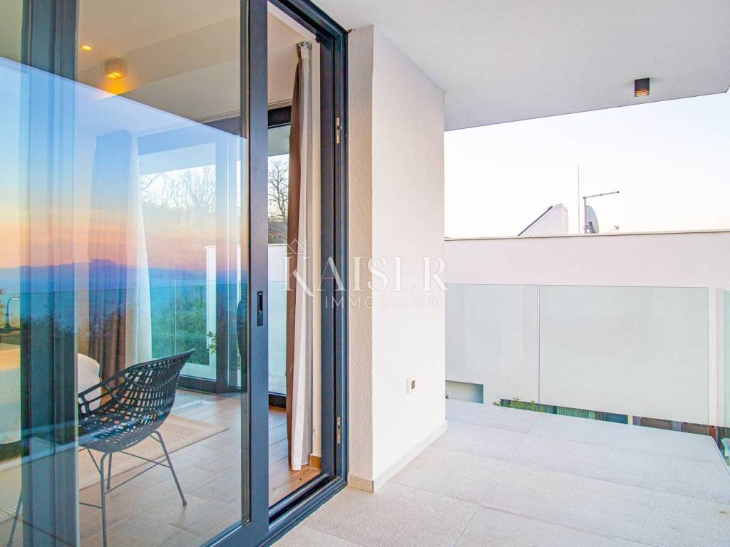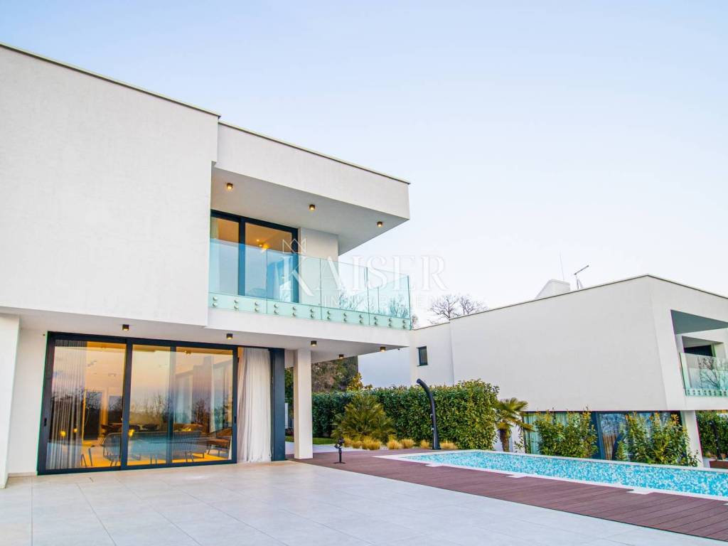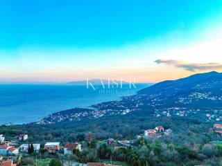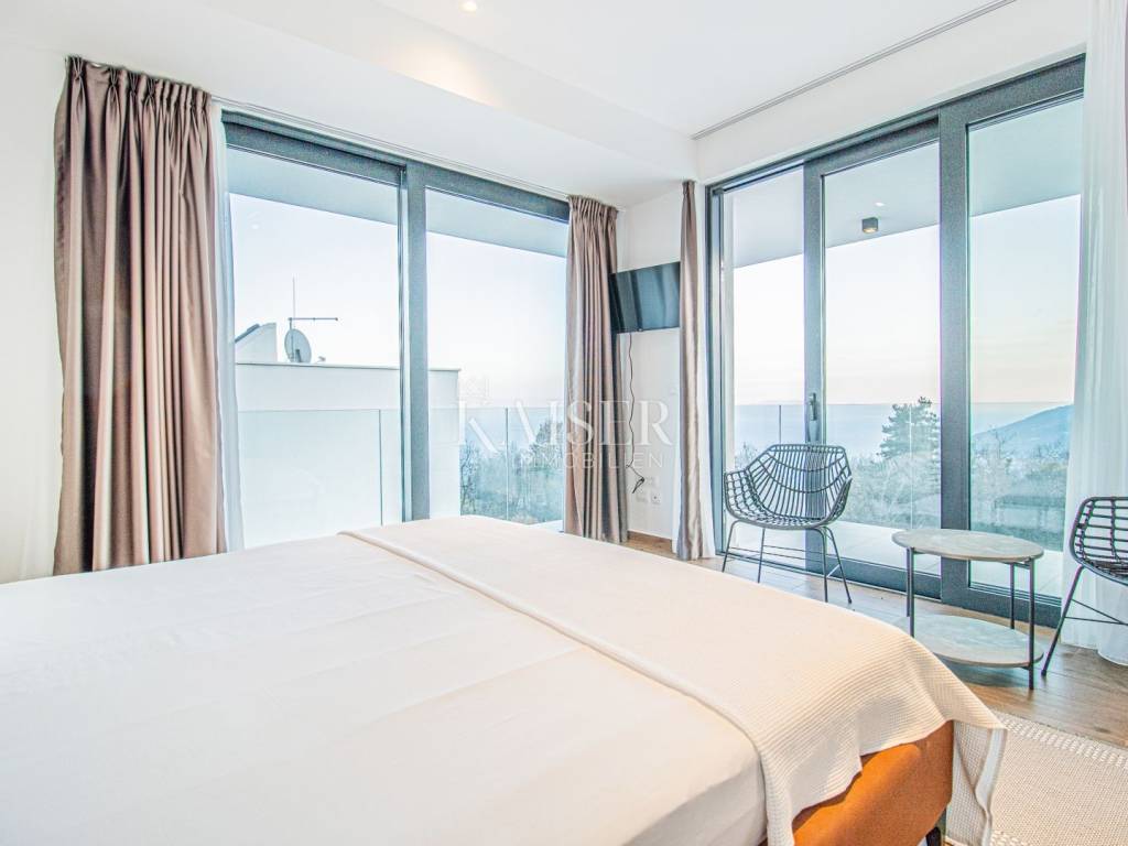 The Kaiser-real estate agency Opatija offers this newly built villa with a breathtaking view in the vicinity of magical Opatija. With one of the most beautiful views of the Kvarner Bay, located on a hill, protected from the bora wind, well-built and equipped in an excellent location, this house offers you a pleasant stay. You can experience all the comfort of this villa in its 296 m2 of living space, which extends through the basement, ground floor and first floor. Thus, the ground floor is an open space designed according to the "open space" system. Here you have the opportunity to spend your time in a beautiful living room, flooded with daylight with the help of glass walls. You can prepare your best delicacies in the luxurious and fully equipped kitchen. Natural light is provided through large glass walls that make your stay more pleasant and the room more spacious. The aforementioned glass wall provides excellent communication between the ground floor and the exterior of the villa. Additionally, on the ground floor there is a guest toilet and a bedroom with a smaller bathroom with a walk-in shower. In the basement of this beautiful villa there is a boiler room and a pool engine room. An internal staircase leads to the upper floor of the villa, where there are 4 spacious bedrooms, each of which has its own bathroom and every room has access to a terrace except one. The whole story of this designer villa is rounded off by a landscaped garden of 531 m2 with a unique 43 m2 swimming pool with a sunbathing area. There are outdoor parking spaces next to the villa. The house is equipped with air conditioning, a heating and cooling system and underfloor heating - heat pumps. Only high-quality materials were used in the decoration, which gives the villa the status of a luxury property. Distance from major cities: Zagreb 1h 30 min, Trieste 1h, Ljubljana 2h, Vienna 4h, Berlin 10h drive. For information and viewing, call 0916133776 agent Eli Lovko