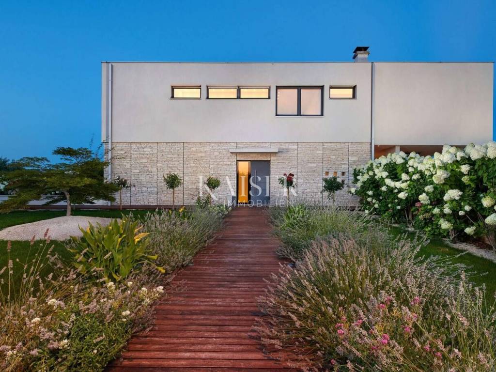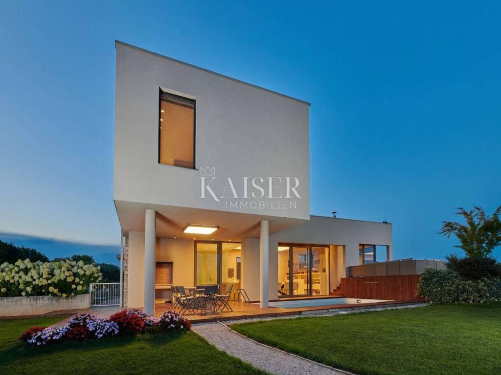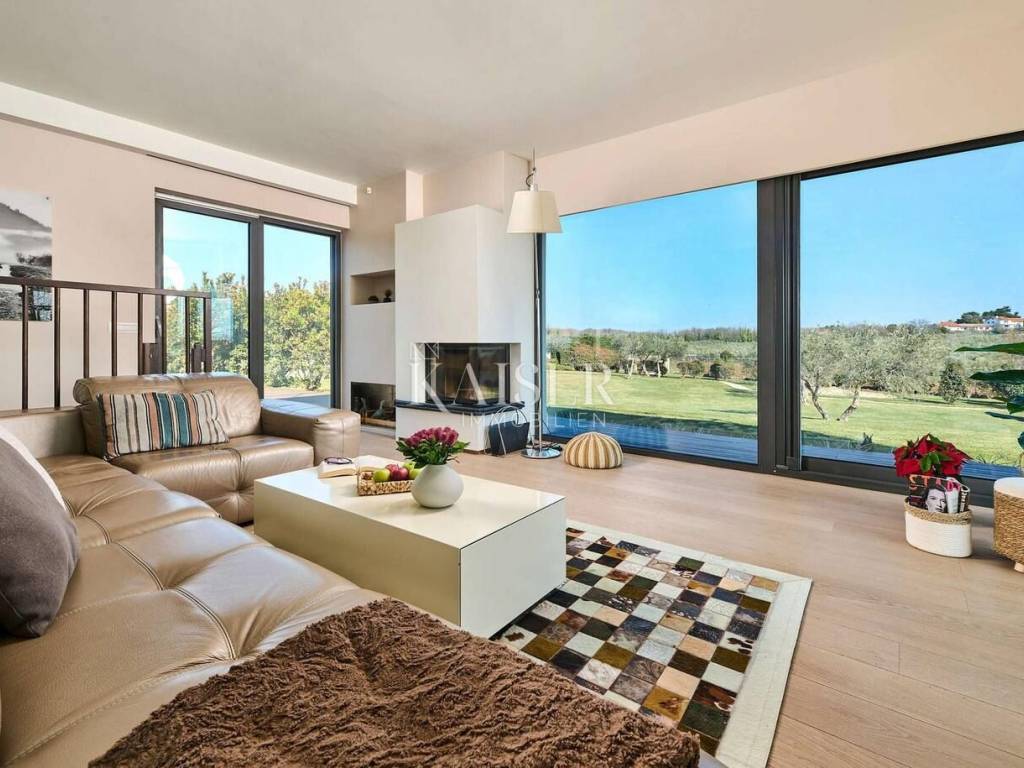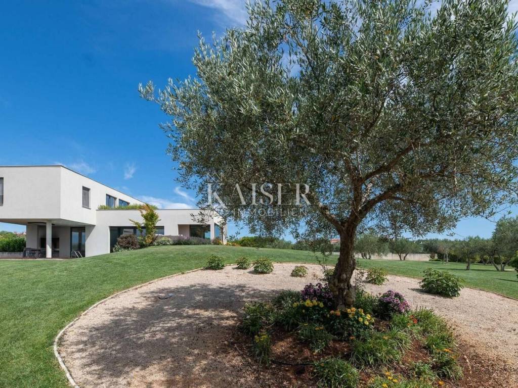 Kaiser Immobilien is proud to present a modern villa with a heated pool in the northwestern part of Istria, in an exclusive location with panoramic views of the sea and olive groves. A special advantage of this property is its location, which provides total privacy and panoramic views, as well as a modern and superbly decorated space. This modernly designed property was built with an emphasis on top-quality materials and details, offering a combination of contemporary style, luxury and comfort. The offer includes a modern villa of 420 m2 on a plot of 5000 m2. On the ground floor there is a large living room, open-plan kitchen and dining room with access to a terrace and sundeck by the 45 m2 pool, a hallway and a bedroom with a bathroom, on the first floor there are 3 spacious bedrooms, each with its own bathroom and a terrace designed as a roof garden, in the basement there is a garage for 4 vehicles, a cinema, a toilet and a storage room. The design is inspired by the "Path of the Sun", the villa is designed so that the interior and exterior spaces follow the sun, large glass walls provide a pleasant stay throughout the year. The villa is equipped with a modern underfloor heating system that can also be activated via a mobile application, and air conditioning systems in all rooms ensure a comfortable temperature throughout the year. A wood-burning fireplace is located in the living room for a warm and cozy atmosphere. The interior is decorated with high-quality materials - luxurious custom-made furniture and carefully selected details. A high-quality kitchen from Gaggenau, equipped with elements with a touch function. Luxurious bathrooms resemble wellness oases, equipped with high-flow rain showers, LED lighting and designer heated towel rails. The garden has been carefully designed to provide maximum comfort, privacy and a visual experience that remains etched in the memory. Every corner of the space has been thoughtfully designed, with an emphasis on a modern atmosphere, functionality and spectacular views. The villa has several parking spaces. The villa is sold fully equipped and furnished. Thanks to its prime position and luxurious amenities, it also represents an excellent investment for tourist rental. Thanks to its excellent location, quick and easy access to key amenities and excellent transport connections are ensured. Distance: Pula Airport - 70 km Koper - 35 km Ljubljana - 140 km Munich - 540 km Vienna - 520 km Prague - 850 km The agency commission for the buyer is 3% + VAT and is paid in the case of purchasing a property, upon conclusion of the first legal act. Do not miss the opportunity to become the owner of this beautiful home that offers the perfect combination of luxury and an excellent location. Contact us with confidence for more information and to arrange a viewing. phone: 0038598538347 email address: dean.cerovac@kaiser-immobilien.hr Seller: Dean Cerovac