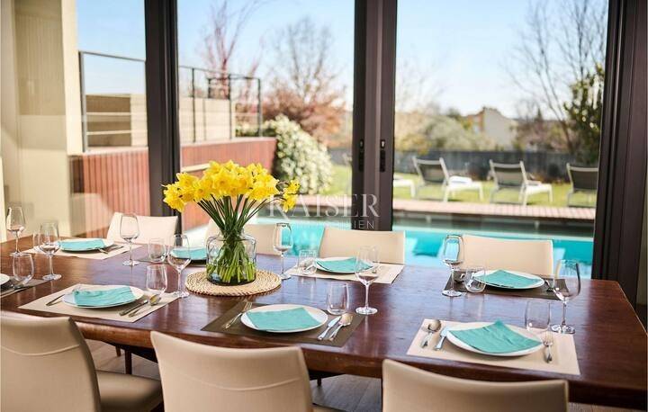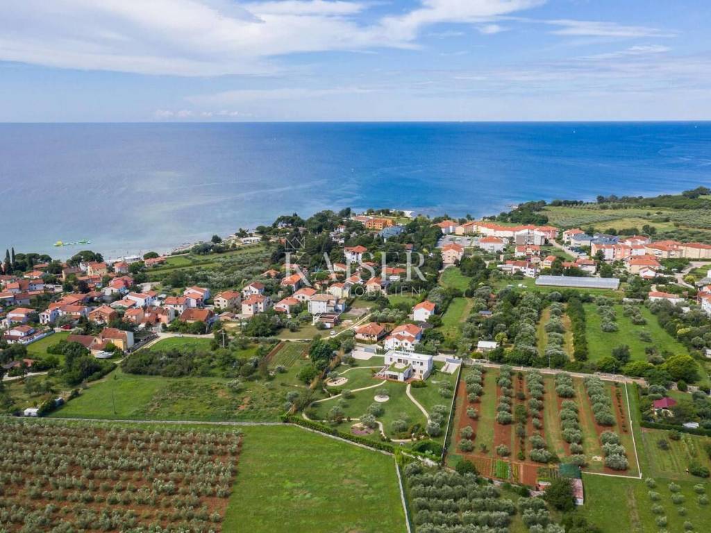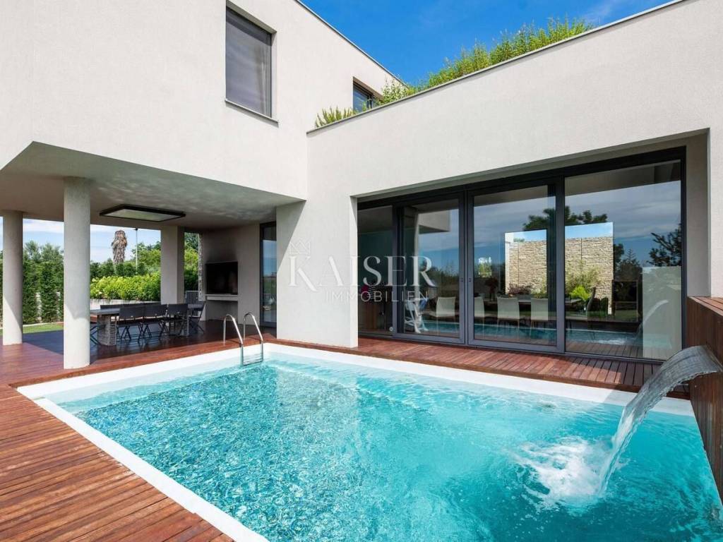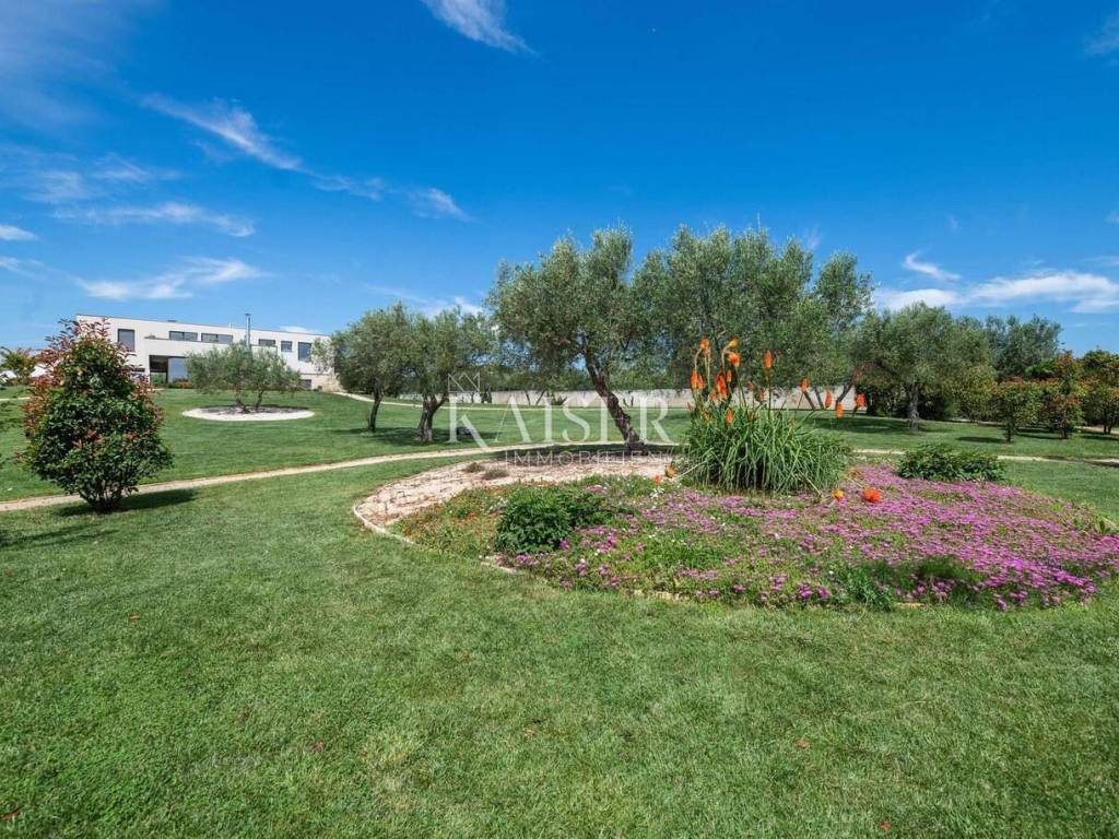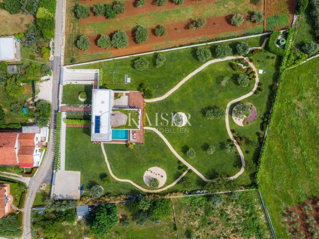 Kaiser Immobilien is proud to present a modern villa with a heated pool in the northwestern part of Istria, in an exclusive location with panoramic views of the sea and olive groves. A special advantage of this property is its location, which provides total privacy and panoramic views, as well as a modern and superbly decorated space. This modernly designed property was built with an emphasis on top-quality materials and details, offering a combination of contemporary style, luxury and comfort. The offer includes a modern villa of 420 m2 on a plot of 5000 m2. On the ground floor there is a large living room, open-plan kitchen and dining room with access to a terrace and sundeck by the 45 m2 pool, a hallway and a bedroom with a bathroom, on the first floor there are 3 spacious bedrooms, each with its own bathroom and a terrace designed as a roof garden, in the basement there is a garage for 4 vehicles, a cinema, a toilet and a storage room. The design is inspired by the "Path of the Sun", the villa is designed so that the interior and exterior spaces follow the sun, large glass walls provide a pleasant stay throughout the year. The villa is equipped with a modern underfloor heating system that can also be activated via a mobile application, and air conditioning systems in all rooms ensure a comfortable temperature throughout the year. A wood-burning fireplace is located in the living room for a warm and cozy atmosphere. The interior is decorated with high-quality materials - luxurious custom-made furniture and carefully selected details. A high-quality kitchen from Gaggenau, equipped with elements with a touch function. Luxurious bathrooms resemble wellness oases, equipped with high-flow rain showers, LED lighting and designer heated towel rails. The garden has been carefully designed to provide maximum comfort, privacy and a visual experience that remains etched in the memory. Every corner of the space has been thoughtfully designed, with an emphasis on a modern atmosphere, functionality and spectacular views. The villa has several parking spaces. The villa is sold fully equipped and furnished. Thanks to its prime position and luxurious amenities, it also represents an excellent investment for tourist rental. Thanks to its excellent location, quick and easy access to key amenities and excellent transport connections are ensured. Distance: Pula Airport - 70 km Koper - 35 km Ljubljana - 140 km Munich - 540 km Vienna - 520 km Prague - 850 km The agency commission for the buyer is 3% + VAT and is paid in the case of purchasing a property, upon conclusion of the first legal act. Do not miss the opportunity to become the owner of this beautiful home that offers the perfect combination of luxury and an excellent location. Contact us with confidence for more information and to arrange a viewing. phone: 0038598538347 email address: dean.cerovac@kaiser-immobilien.hr Seller: Dean Cerovac