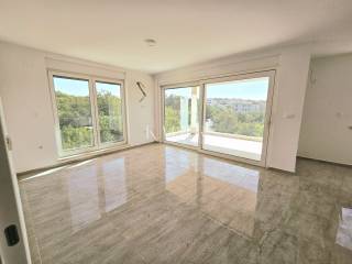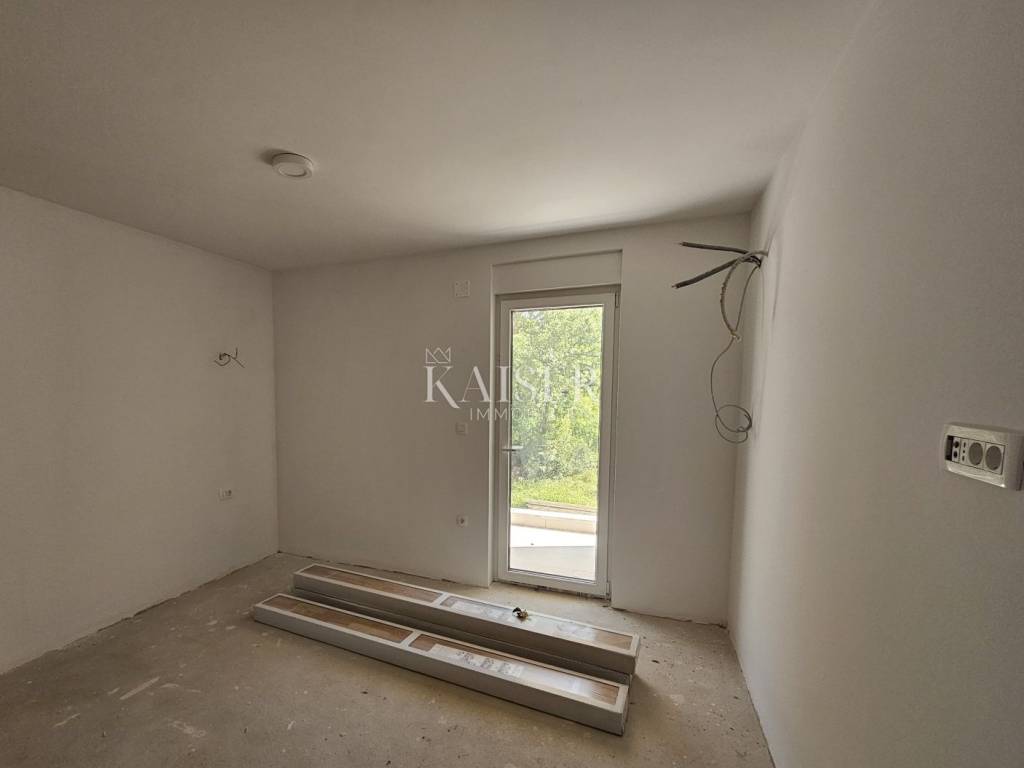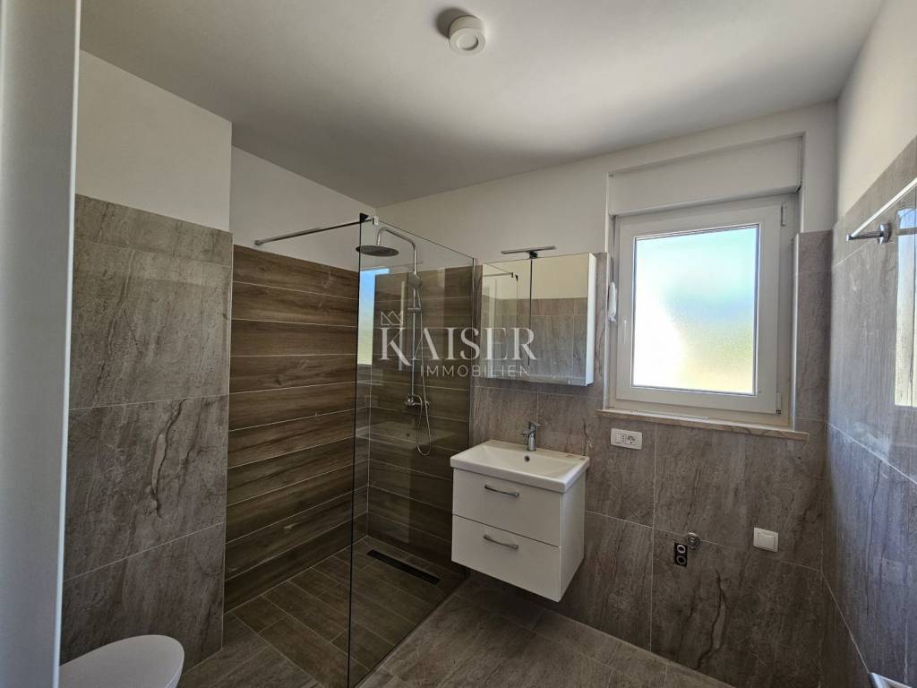 Kaiser immobilien mediates the sale of apartments in a new building, Njivice, island of Krk. The apartment is located on the first floor of a two-story building, located on the edge of the green belt. The 80m2 apartment consists of two bedrooms, a bathroom and a guest toilet, and an open concept that includes a kitchen, dining room and living room with direct access to a covered terrace with a beautiful view of the sea. One bedroom has its own exit to the balcony with a view of the greenery that surrounds the building. High-quality carpentry, with stop-sole glass, high-quality ceramics, underfloor heating, all rooms air-conditioned. The apartment also has one parking space. The planned completion date is by the end of 2025. ID CODE 105-302 The commission of the agency for the buyer is 3% + VAT and is paid in the case of real estate purchase, at the conclusion of the first legal act.