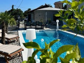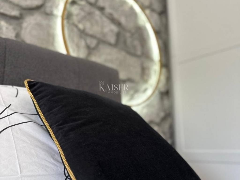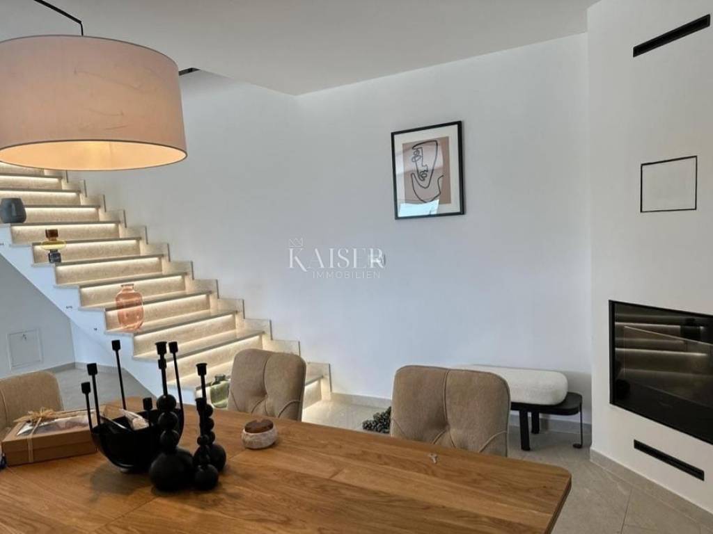 Kaiser immobilien mediates the sale of an elegant, rustic-Mediterranean style villa located in a beautiful location. The building with a total area of 328m2, with a beautifully landscaped garden of 870m2, is located in a quiet location near all amenities and only 2.5 km from the sea and the first beaches as the crow flies. On the ground floor there is an open-concept living area that includes a living and dining room, a kitchen, one bedroom with a bathroom, and a guest toilet. From the kitchen and living room there is access to a spacious covered terrace of 42 m2. Below is a meticulously landscaped garden with a wood-burning fireplace. Upstairs there are three spacious bedrooms with private bathrooms and private balconies, from which there is a beautiful open view of the sea and the surrounding nature. Heating/cooling is regulated via air conditioning (smart control via Wi-Fi), underfloor heating is installed throughout the house (smart control via Wi-Fi), and there is a pellet fireplace in the dining room, which gives a special atmosphere in cold days (smart control via Wi-Fi). The villa also has 3 solar panels with a 400L boiler for heating sanitary water, and is equipped with a smart video surveillance and alarm system. A children's park with entertainment for the youngest, a barbecue, a heated swimming pool measuring 8 x 4m, a water heating system with a heat pump (wi-fi smart) is located on a beautifully landscaped and fenced garden. Mediterranean plants and grass in the garden are maintained by a smart irrigation system. An additional feature of this property is the garage with remote opening and the laundry room, total area of 54 m2. The yard is bordered by a fence, and access is via a remote-controlled sliding door. ID CODE 105-220 The commission of the agency for the buyer is 3% + VAT and is paid in the case of real estate purchase, at the conclusion of the first legal act.