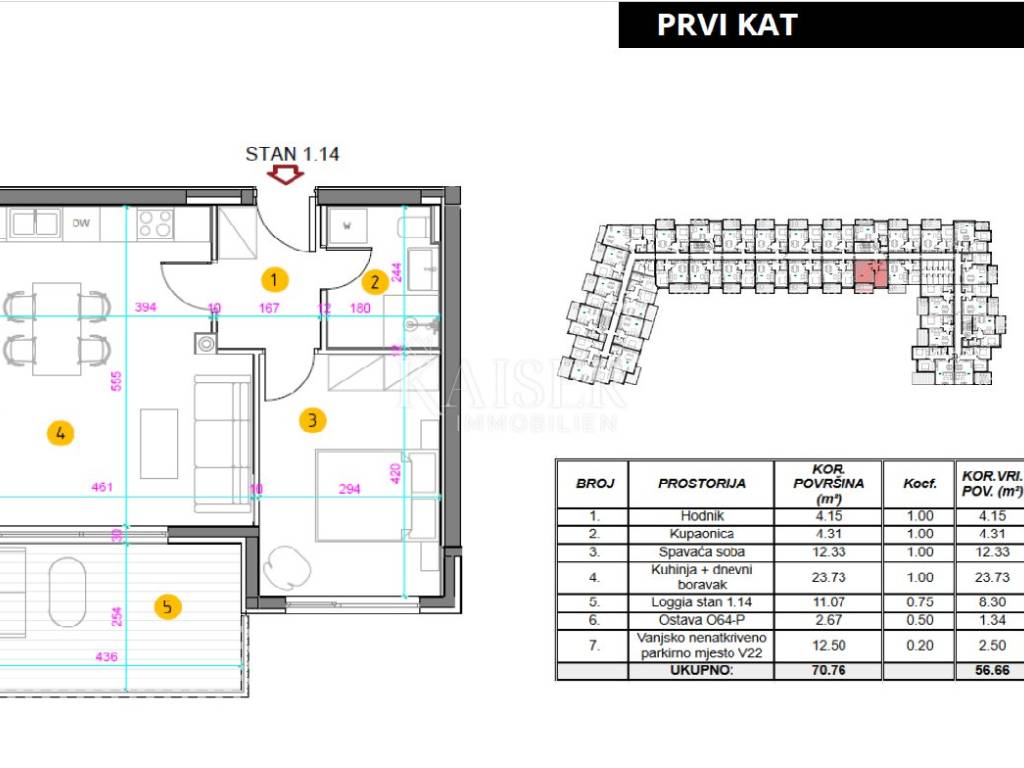Umag in the northwest of the Istrian peninsula exudes the special charm of a Mediterranean town, in an area where the sea and land offer a wealth of opportunities for adventure, sporting experience and a wealth of tradition. The fertile Istrian soil and delicacies, crystal clear sea, mild Mediterranean climate and proximity to the hilly interior of Istria with cycling and trekking trails - make Umag an ideal destination throughout the year - for active holidays, excursionists and residents. Kaiser Immobilen offers a modern and functional apartment in a new building. The apartment is located in Umag, in the immediate vicinity of all important facilities; shops, kindergarten, school, health center, sports fields, cafes and restaurants. It is also within walking distance of the first city beaches (700 m), the city center and promenades, which makes it an ideal choice for living both for young working families and for those looking for rest and peace. This functional one-bedroom apartment in a new building equipped with elevators is located on the first floor and consists of a living room with kitchen, bedroom, bathroom and hallway, all with a total area of 45 m2. The apartment also has a spacious loggia of 11 m2, a functional storage room of 3 m2 and a parking space in the garage of 12.5 m2. The load-bearing system of the building is entirely designed from reinforced concrete monolithic construction, interfloor slabs. The partition walls inside the apartments are made of double-thick plasterboard linings (W112) with additional thermal and sound insulation. The facade lining is provided in the ETICS system with 10 cm thick thermal insulation. The external facade openings are closed with a high-quality multi-chamber PVC profile system. All apartments have high-quality multi-split heating and cooling systems whose operating characteristics ensure maximum comfort and economy. Each apartment has its own water and electricity meter. Sanitary water is prepared via an electric boiler. All apartments have telephone, antenna, TV and internet connections and a built-in intercom installation with video intercom. The highest quality materials and built-in equipment make the apartment extremely comfortable to live in, but also a quality solution for maintaining the value of the investment. In addition to the aforementioned apartment, we offer, within the same property, a number of one-bedroom and two-bedroom apartments with different room layouts and square footage, all of which provide high quality living in a modern new building in a unique location close to all amenities. The apartments, located from the ground floor to the third floor, are vertically connected with elevators and staircases from the parking level to the entrance to the apartments. Modern and comfortable apartments on the upper floors have spacious balconies or loggias, while the apartments on the ground floor have spacious terraces with a garden. All apartments also have functional storage rooms. Each apartment has a secured parking space, with some apartments having a parking space in the garage, and some apartments having a covered parking space. Some apartments also have 2 parking spaces available. Distance: Pula Airport - 80 km Ljubljana - 140 km Munich - 540 km Vienna - 520 km Prague - 850 km The apartment is under construction, and the planned completion of the works is scheduled for summer 2025. The purchase price includes VAT, so buyers are not required to pay real estate tax. The agency's commission for the buyer is 3% + VAT. The commission covers all services related to the purchase and is paid upon conclusion of the first legal act. We are at your disposal for any additional information about this and other apartments on offer. Damir Mlacović damir@kaiser-immobilien.hr http://kaiser-immobilien.hr/ +385-98-339-933