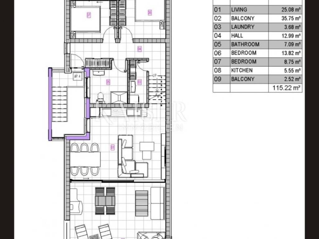 Kaiser Immobilien is proud to present a rare gem in the world of real estate - a luxury penthouse under construction located in beautiful Dramlje. This exceptional apartment offers not only supreme comfort, but also a spectacular view of the sea, creating an unrepeatable living experience. Layout of the apartment: The spacious entrance hall welcomes you with elegance. Two comfortable bedrooms provide plenty of space and privacy. The two modernly equipped bathrooms are designed with an emphasis on luxury. The bright living room with kitchen opens onto a spacious 35m2 balcony with a stunning sea view. Specifications: Underfloor heating provides warmth and comfort throughout the year. Aluminum carpentry with three-layer insulating glass ensures superior insulation. All openings are equipped with mosquito nets and electric blinds, providing full control over light and privacy. Installations are performed exclusively with renowned German manufacturers, guaranteeing top quality. Sanitary ware of the top brand Hansgrohe contributes to a luxurious impression. Special amenities: Each parking space has preparation for electric vehicle chargers, highlighting the commitment to a sustainable lifestyle. The building is located in a dead-end street, and behind it is a green belt (no construction), which ensures privacy and peace. All bedrooms are oriented towards the green belt, providing silence and a relaxing atmosphere. Distance from the apartment: Rijeka Airport - 16 km Pula Airport - 137 km Zagreb Airport - 171 km Ljubljana - 141 km Munich - 542 km Vienna/Vienna - 517 km Prague - 840 km This is an opportunity for those looking for a top-quality home with modern facilities and at the same time want to enjoy a peaceful environment. For additional information or to book a viewing, contact our agent. The commission of the agency is 3% + VAT for the customer. The commission covers all services related to the purchase and is paid only in the case of real estate purchase, at the conclusion of the first legal act.