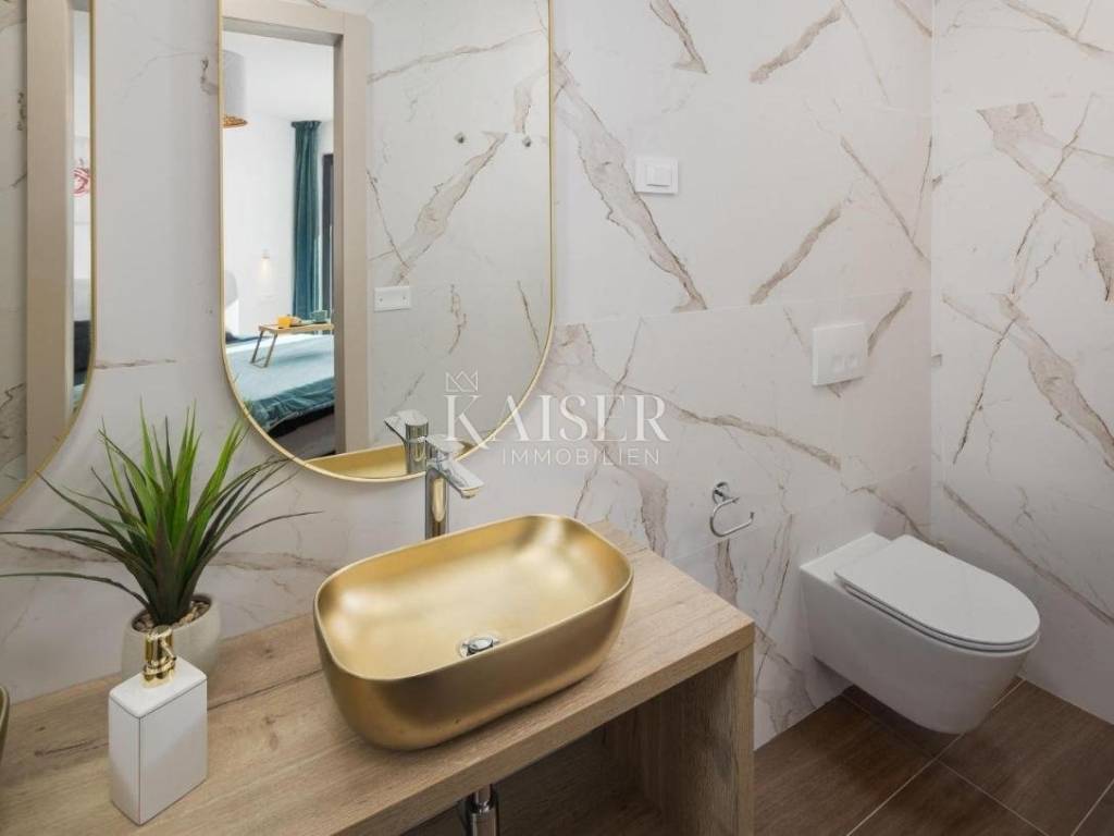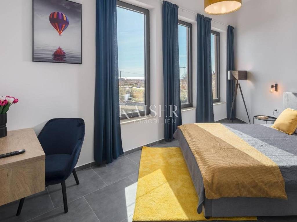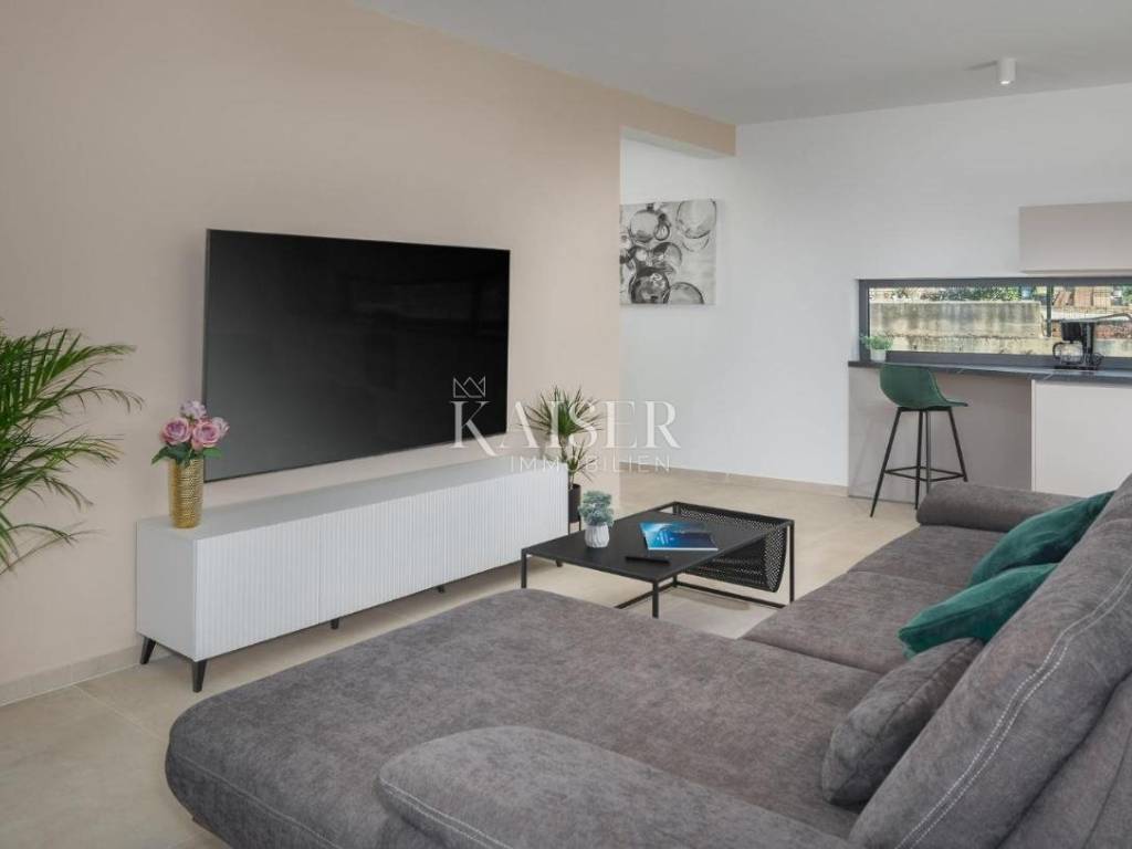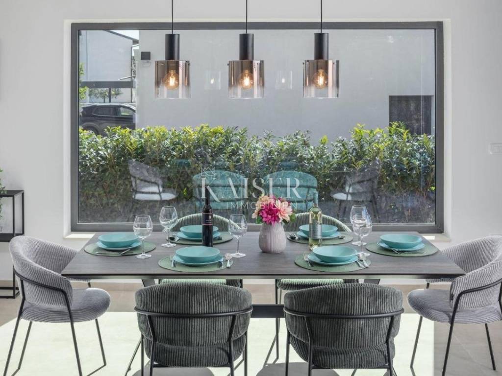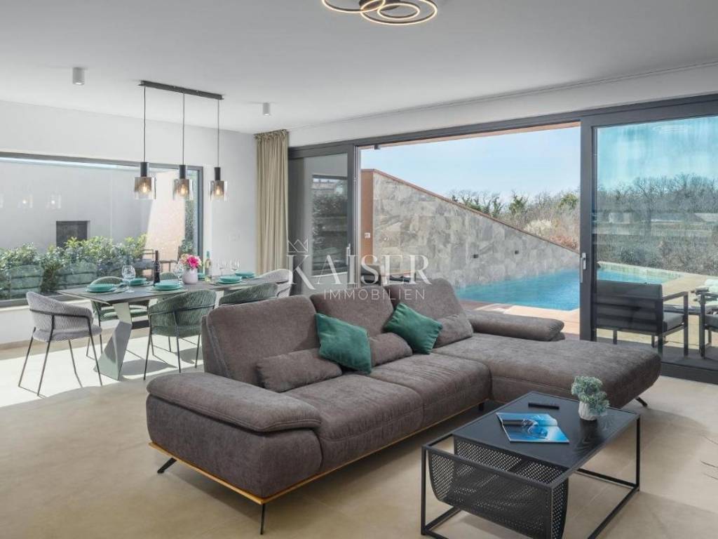 Kaiser Immobilien presents a beautiful modern villa with a swimming pool and a large garden for long-term rental in the vicinity of Novigrad. The villa consists of 3 floors with a total of 155 m2, and in addition has a 30m3 swimming pool, parking and a garden with olive trees that give a real Mediterranean atmosphere. On the ground floor there is a kitchen, dining room and a large living room that is connected to a glass wall with a covered terrace, sundeck and swimming pool. Stairs lead down to the basement where there is a technical room (laundry room/boiler room) and a bedroom with a bathroom that is connected by stairs to the terrace with a swimming pool and sundeck. On the first floor, the villa has 2 bedrooms with bathrooms with lots of windows oriented to the south that provide plenty of daylight. All bedrooms have a double bed. The villa is modernly decorated and fully equipped with all necessary household appliances. Cooling is via air conditioning, and there is underfloor heating via a heat pump. The spacious parking lot allows parking for 4 vehicles. This beautiful house is located in a quiet village just 2.5 km from the sea and the city center. The villa and the spacious 710m2 garden are an ideal place for everyday life and vacation for families with children. Pets are welcome. It is rented for a minimum period of one year. It is available for long-term rental in 2027, i.e. from October 2026. Utilities are not included in the listed rental price. Nearby: Bike rental: 2500 m Marked hiking trail, 0-5km: 500 m Mountain bike trail, 0-5km: 500 m Cycling trail 0-5km: 500 m Running trail- Trim trail: 2,000 m Fitness center: 2,000 m Pet food store: 2,000 m Beach where pets are welcome: 2,000 m Veterinarian: 12,000 m Distance to airport: PUY: 70,000 m Distance to next door neighbor: 100 m Distance to shop: 2,000 m Distance to restaurant: 500 m Distance to city: 2,000 m (Novigrad) Distance to coast/beach: 2500 m (Pebble beach) The agency's commission for the buyer is equal to the amount of one month's rent + VAT. The commission covers all services related to the rental and is paid only in the case of real estate rental, at the conclusion of the first legal act. If you want this modern villa with a pool and a beautiful garden to become your new home, contact us. Damir Mlacović e-mail: damir@kaiser-immobilien.hr phone: +385-98-339-933