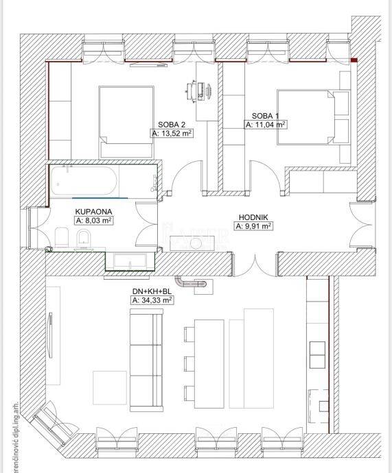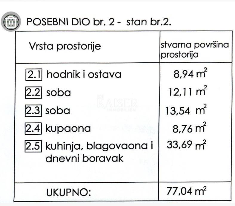 Kaiser Immobilien agency offers an elegant and completely renovated apartment of 77.04 m², located on the ground floor of a quality older building that exudes the charm of former city villas. The apartment also comes with an accompanying storage room of 3.82 m², which further increases the functionality and practicality of the space. The entire apartment has been thoroughly and professionally renovated: new electricity and water installations have been installed, a concrete slab has been made, and the floors are covered with top-quality oak parquet that gives the space warmth and a refined look. The special elegance is emphasized by the high ceilings, thanks to which the space seems even more airy, elegant and comfortable. The interior combines the antique touch characteristic of quality old buildings with all the advantages of modern decoration. The classic layout of the rooms retains the authentic character of the space, while the contemporary design allows for a high level of comfort. The living room is bright and cozy, connected to a fully equipped kitchen that remains in the price, and two comfortable bedrooms offer flexibility in organizing the home. The modern bathroom is equipped with electric underfloor heating, and in the hallway there is an elegant built-in wardrobe with space for a washing machine, dryer and additional equipment. PVC joinery ensures good insulation and comfort throughout the year. The apartment is being sold partially furnished, the kitchen with appliances and the built-in wardrobe in the hallway are included in the price. The building is located on a quiet street that provides a sense of privacy and quality neighborhood, while at the same time providing quick access to all key city amenities such as shops, kindergartens, schools, public transport and the center itself. Parking is public and free, available in the immediate vicinity. This apartment represents the perfect combination of the elegance of old buildings and the comfort of modern times, ideal for those looking for a warm, aesthetically appealing and fully furnished home without additional investment, located in a quiet, but well-connected city environment. The agency's commission for the buyer is 3% + VAT. The commission covers all services related to the purchase and is paid only in the case of purchasing a property, upon concluding a legal act. For all additional information, please contact: Nelica Arsenijević Phone: +385919254809 E-mail: nelica@kaiser-immobilien.hr Marijana Cuculić Phone: +385981869950 E-mail: marijana.cuculic@kaiser-immobilien.hr