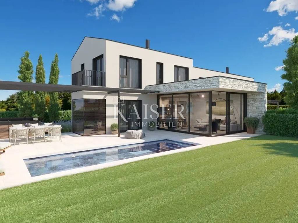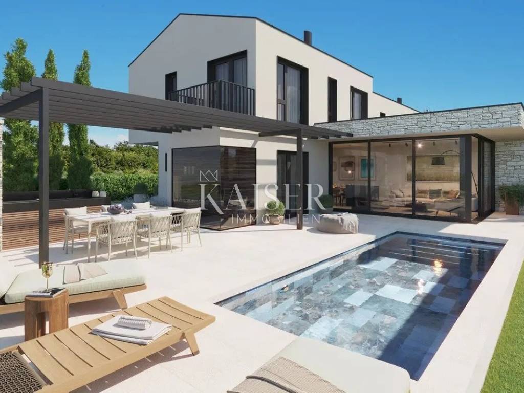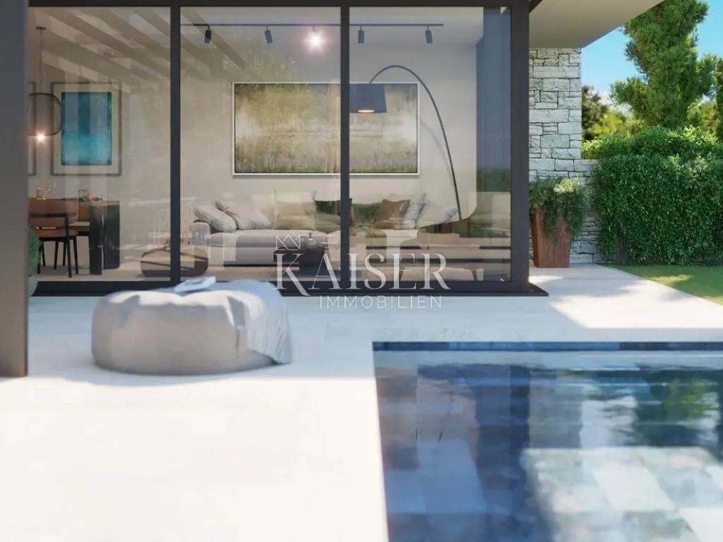 Kaiser Immobilien offers for sale a new elegant villa in the immediate vicinity of the city of Poreč. Due to its geographical location, the villa offers the highest level of living comfort and luxury facilities. It is located in a quiet location of a small local town, yet only a few minutes from the city where all the necessary amenities are provided. The villa has three spacious bedrooms, each with its own bathroom, which ensures optimal privacy for the tenants. Each bathroom has a modern design and is equipped with high-quality elements. The specialty of this villa is the first-class facilities for wellness and relaxation. The private sauna allows users to relax and regenerate after an eventful day. The interior is tastefully designed and offers an ambience that promotes peace and relaxation. The exterior of this villa is equally impressive. A saltwater pool ensures a pleasant bathing experience and reduces the use of chemical additives. There is also a heated pool that allows swimming in the colder months. The spacious terrace invites you to sunbathe and offers a wonderful view of the surrounding landscape. If you want this new beautiful villa to become your new home, contact the Kaiser Immobilien agency.