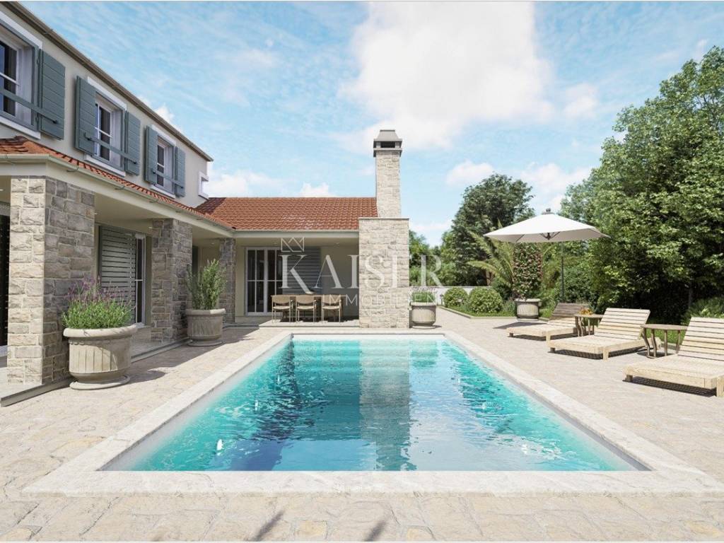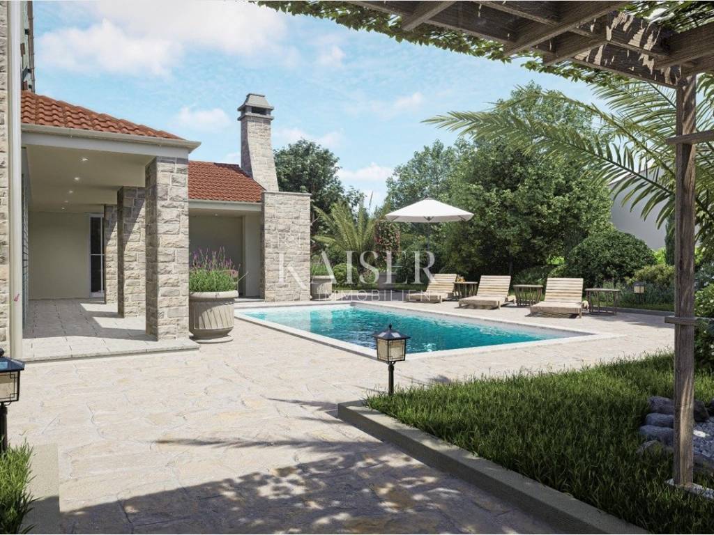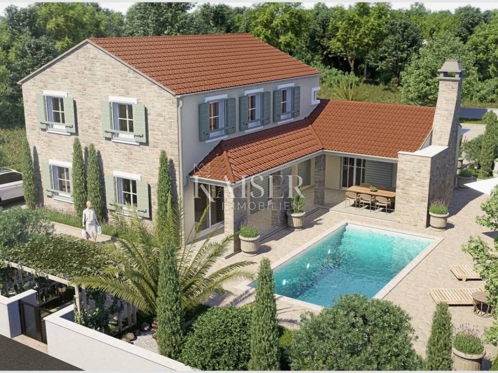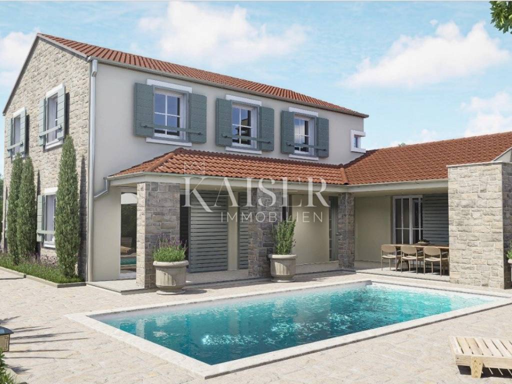 Kaiser Immobilien presents: Luxury family villa with swimming pool under construction Located in the peaceful and natural surroundings of the small Dalmatian town of Poljica Brig, near the historic town of Nin near Zadar, this beautiful family villa with its spacious area of 215.07 m², divided into two floors, and a swimming pool of 29.06 m², offers everything you need for a luxurious life or vacation. The total gross area of the house is 227.49 m². The villa is designed to provide its future owners with a spacious, but at the same time comfortable and functional living space. The spacious and elegant interior of the ground floor of the house, with a total area of 140.90 m², is designed to allow for a smooth flow of space and maximum comfort. Already upon entering, a covered entrance area of 3.85 m² leads to a spacious entrance hall (11.10 m²), which naturally continues into the open concept living room, dining room and kitchen. The 11.70 m² kitchen and 14.90 m² dining room are ideal for family gatherings, while the 19.14 m² living room exudes airiness and light thanks to large glass surfaces. For a complete atmosphere, there are also covered terraces (23.30 m² and 8.43 m²) that offer a pleasant outdoor living space with an integrated outdoor kitchen and barbecue with a beautiful view of the garden and pool. A special feature of the ground floor is the sauna (8.03 m²), which provides additional relaxation. The ground floor also contains a bedroom (16.93 m²) with its own bathroom, ideal for guests or owners who want maximum privacy on the main floor. Privacy and comfort on the first floor, which has a total of 74.17 m², is provided by an elegant staircase (6.76 m²). The floor is designed as a private relaxation area and contains three spacious bedrooms (10.85 m², 16.80 m², 15.40 m²) equipped with high-standard parquet. Each room has enough light and provides a feeling of warmth and privacy. Additional practicality is provided by a dressing room (5.25 m²), and two modern bathrooms (5.27 m² and 5.97 m²) with high-quality ceramic tiles. One of the biggest assets of this villa is the beautiful swimming pool of 29.06 m² (7.75 mx 3.75 m), ideal for refreshment during hot summer days. Around the pool there is a furnished terrace that allows sunbathing and socializing. Additional spaces such as storage rooms (4.51 m² and 1.61 m²), a service room (7.19 m²) and a laundry room (4.69 m²) ensure the practicality and organization of the home. There are also special storage rooms for wood and technical equipment, which allows for a tidy and functional outdoor space. This property was built according to the highest standards of modern construction, with an emphasis on durability, energy efficiency and resistance to weather conditions. The load-bearing walls are made of Porotherm blocks, known for their exceptional thermal and sound insulation properties. Double insulation ensures high energy efficiency and minimal heat loss. The roof structure is made with metal purlins, which guarantees durability and resistance to external influences. The entire house has electrical installations. The first phase of plumbing installations has been completed in the house and garden. The water connection has been made in the yard, while the electricity connection has been paid in full, including a special construction electricity connection. The swimming pool has already been dug out and concreted, with the first phase of installation completed. The septic tank has also been dug out and concreted. Concrete fence walls have been built around the entire plot, ensuring privacy and security. The villa has a valid building permit for the construction of a residential unit with a swimming pool and an auxiliary building (2.B group). Construction began in February 2024, with a properly maintained E-construction log, which further confirms the transparency and quality of the work performed. All utility contributions have been paid to the City of Nin, thus fulfilling all administrative requirements for the continuation of construction and the final legalization of the facility. This luxury villa is a perfect blend of modern architecture, comfort and nature. It is an ideal home for those seeking spaciousness, privacy and a high quality of life. With its position, quality construction and rich equipment, this house provides the perfect retreat for a family or an investment in tourist accommodation. Ground floor area: Covered entrance-terrace: 3.85 m² Entrance area: 11.10 m² Kitchen: 11.70 m² Dining room: 14.90 m² Living room: 19.14 m² Covered terrace: 23.30 m² Covered terrace - fireplace: 8.43 m² Sauna: 8.03 m² Service: 7.19 m² Storage room: 4.51 m² Laundry room: 4.69 m² Bedroom: 16.93 m² Bathroom: 4.58 m² Stairs: 2.04 m² Wood storage: 2.10 m² Storage room: 1.61 m² Total ground floor area: 140.90 m² First floor area: Stairs: 6.76 m² Hallway: 7.87 m² Bathroom: 5.27 m² Bedroom: 10.85 m² Bedroom: 16.80 m² Bedroom: 15.40 m² Wardrobe: 5.25 m² Bathroom: 5.97 m² Total floor area: 74.17m Poljica-Brig is a village near Nin, about 15-20 minutes drive from Zadar. Although Poljica-Brig is not located directly on the coast, the beaches in Nin and the surrounding towns are within a few minutes drive, providing the opportunity to enjoy the clear sea and sunbathing. Thanks to its location, Poljica-Brig offers a peaceful rural ambience, while at the same time providing quick access to urban amenities. Nin – 7 km (10 min) Zadar – 17 km (20 min) Biograd na Moru – 50 km (40 min) Šibenik – 90 km (1h) Split – 150 km (1h 30 min) Zagreb – 280 km (2h 45 min) National parks: Paklenica NP – 55 km (45 min) Kornati NP – access from Zadar (boat trips) Krka NP – 85 km (1h) Plitvice Lakes NP – 130 km (1h 45 min) Poljica-Brig has excellent traffic The buyer pays an agency fee of 3% + VAT and is charged with the first legal act. For more information and a viewing, please contact us with confiden