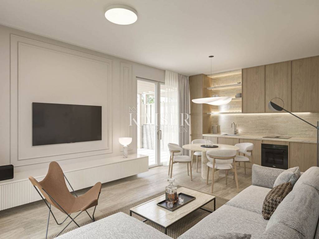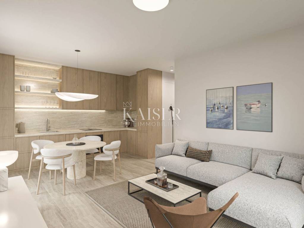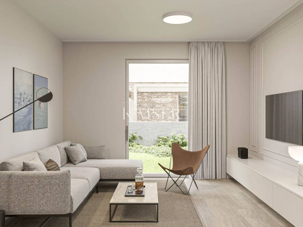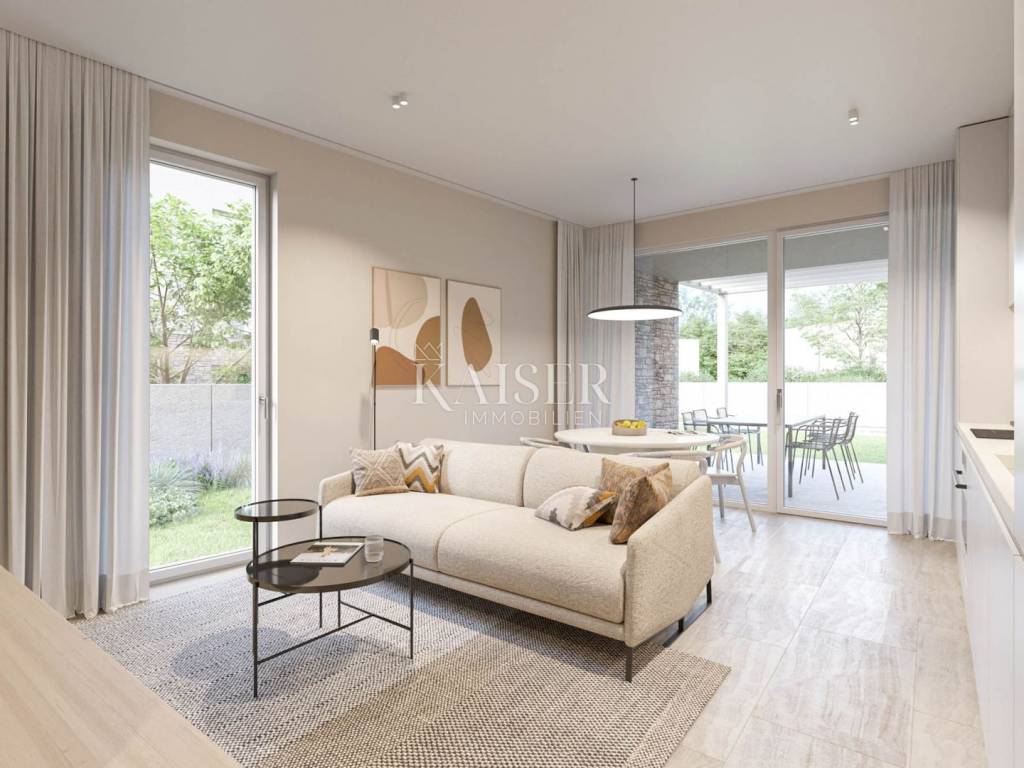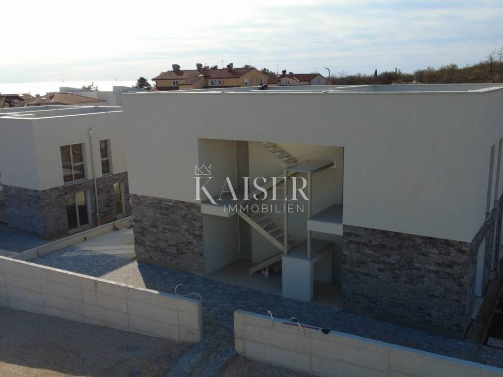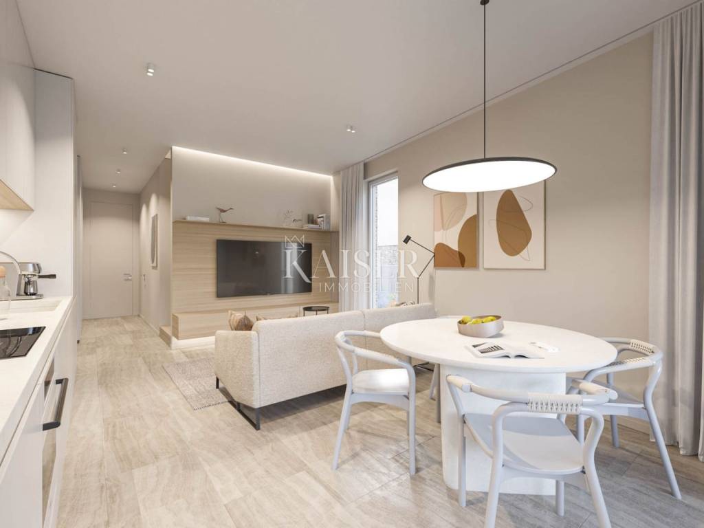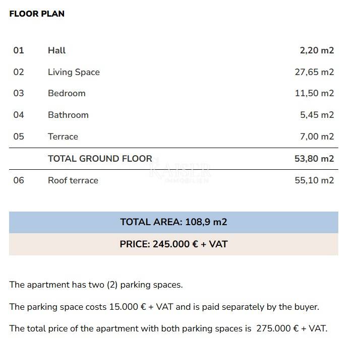 Kaiser Immobilien presents you an apartment in a beautiful and attractive apartment in a quiet location near Novigrad. The apartment is 300 m from the sea, 400 m from a beautifully decorated beach and 5 km from the center of Novigrad. The apartment has 55 m2 and is located on the 1st floor of a building consisting of a total of 3 apartments. The apartment consists of an entrance hall, bathroom, bedroom and an open space area with a kitchen with a dining room and a living room with access to the terrace. The apartment has a beautiful roof terrace of 55 m2 with a beautiful view of the sea. The apartment can be used for residential or tourist purposes. The apartment has 2 parking spaces. TECHNICAL DESCRIPTION OF THE CONSTRUCTION The foundations of the building are constructed at a depth below the freezing level, i.e. at least 60 cm from the terrain. The dimensions of the foundation are 50x60 cm. - load-bearing walls are made of brick and partly reinforced concrete, partly plastered, and partly covered with stone cladding with a thickness of d= 5 cm. Thermal insulation with a thickness of d=8 cm is installed on the external walls. - Columns, beams, collars and lintels made of reinforced concrete according to the static calculation C25/30. Horizontal collars of the width of the wall and a height of d= 20 cm reinforced according to the static calculation should be installed over all load-bearing walls. - The roof and interfloor slabs are made of reinforced concrete. - The roof is flat and walkable. The roof is made of PVC foil; so that "ceramic boxes" can be installed later and used as a roof terrace. WALL TREATMENT - The internal walls are made of brick. - The internal walls are plastered roughly and finely, - All walls and ceilings are finally painted white. - The walls in the bathrooms and toilets are covered with ceramics, partly with plaster and white paint. - The facade of the building is partly covered with stone d=5 cm, QUICK LARGE 21230 dark beige and partly with a final layer. FLOORS - Higher quality ceramics are placed on the floors. In places where there is a possibility of water (bathroom), a waterproofing coating is placed under the ceramics. CARPENTRY - Construction carpentry is made of ALU material with three-layer glass, painted in the selected RAL. -The wooden door to the terrace is made of ALU material (ALU-K profile) painted in the selected RAL -The interior door is white. -The entrance door is made of ALU material, -Alu Jalousie painted in selected RAL with electric drive INSTALLATION The building will be connected to the existing electricity, water and sewage network. ELECTRICAL INSTALLATIONS Electrical installations: -low-voltage connection of the building -main distribution installations and electricity consumption measurement -electrical installations of consumers -electrical installations of lighting and sockets -electrical installations with ventilation, heating and air conditioning installations -potential equalization and supplementary potential equalization installations -protective earthing installations Low-voltage installations: -telephone installations -antenna installations HEATING AND COOLING INSTALLATION Each residential unit has an installation for underfloor heating - ready for the buyer to install the type of underfloor heating they want. Each residential unit has its own independent heating, cooling system. Cooling on a split system air conditioner. Only electricity will be used as an energy source. PREPARATION OF HOT WATER Domestic hot water is prepared in a boiler with an electric heater. ENVIRONMENT AND PARKING The house has a fence on the border. The fence is reinforced concrete. Parking lots are in front of the building, access from the main road. Parking lots are in a green area. The purchase price includes VAT, so buyers are not required to pay real estate tax. The agency's commission for the buyer is 3% + VAT. The commission covers all services related to the purchase and is paid upon conclusion of the first legal act. We are at your disposal for any additional information about this and other apartments on offer. Damir Mlacović damir@kaiser-immobilien.hr http://kaiser-immobilien.hr/ +385-98-339-933