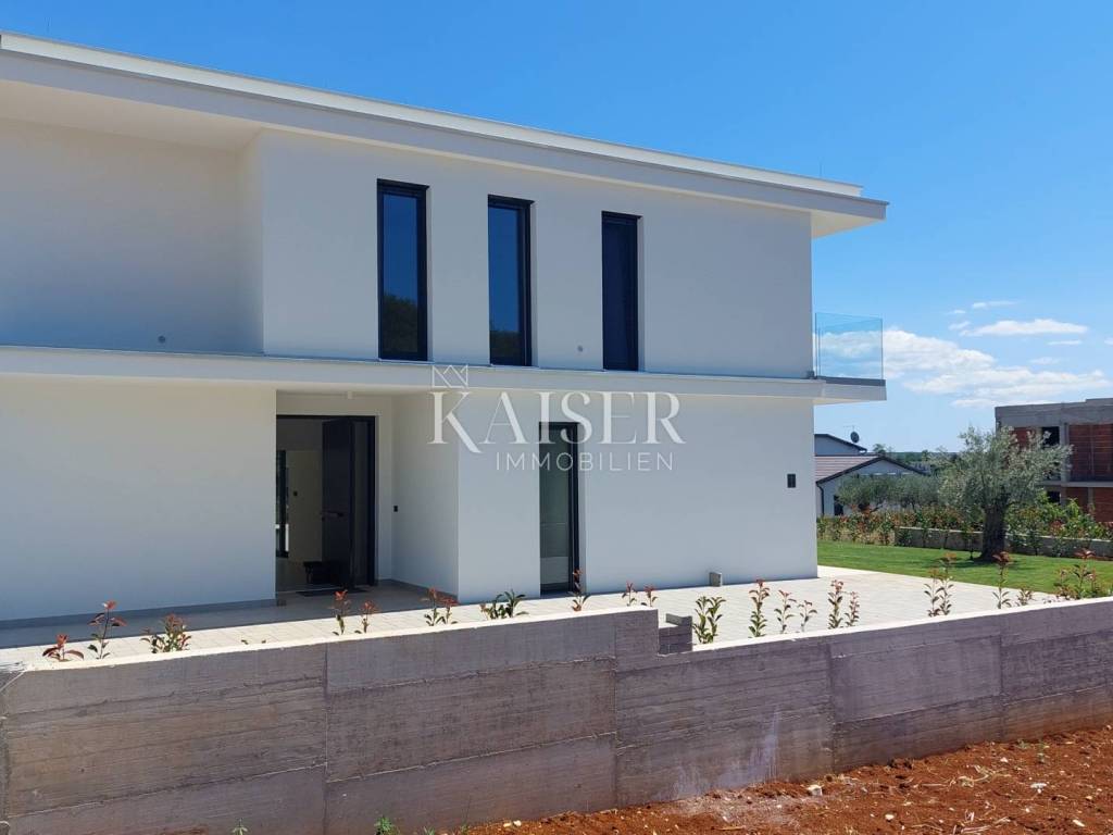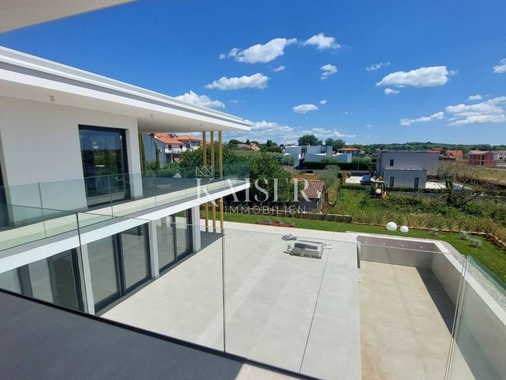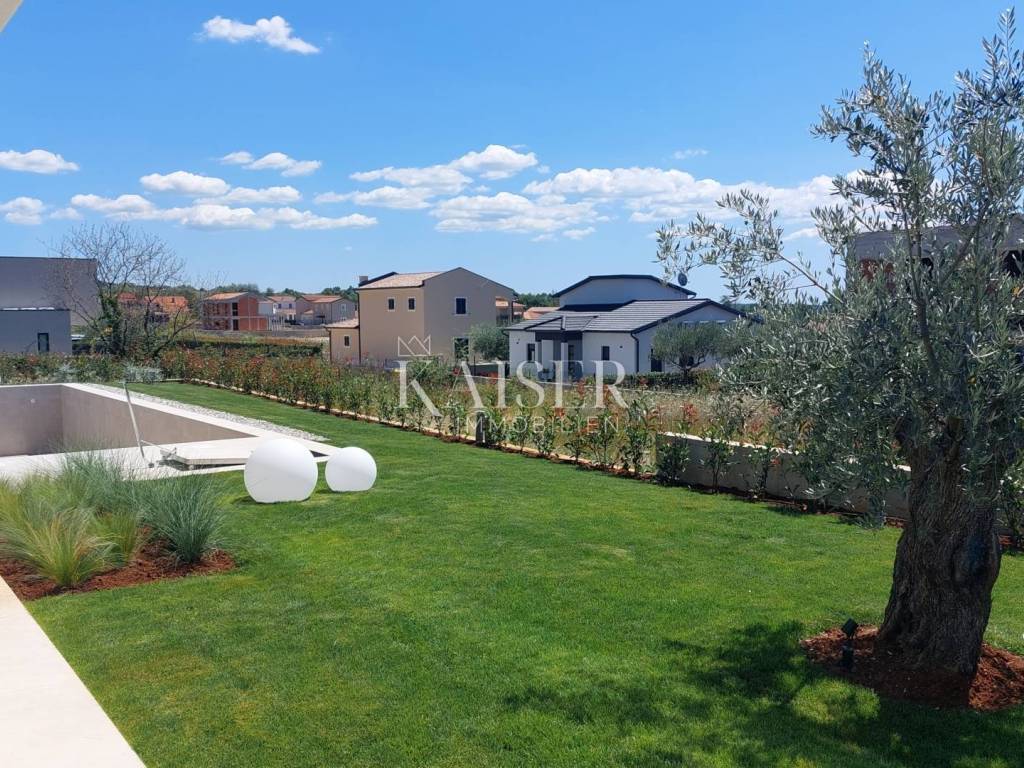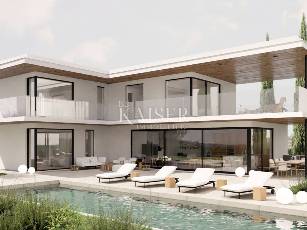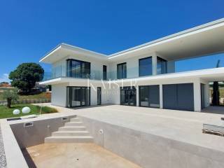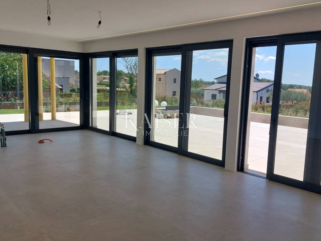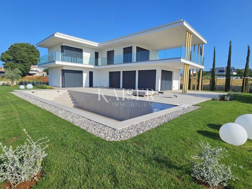 Kaiser Immobilien presents you a villa in Istria, just ten kilometers from the sea and the city of Poreč, in a small charming place on a hilly terrain surrounded by olive groves, stone houses and narrow streets with a typical Istrian atmosphere: wineries, taverns, cycling routes, nature trails... The towns of Motovun, Rovinj, Umag, Novigrad are also nearby, offering additional content. The villa with a net area of 330.5m2 is located on a plot of 971 m2, and is surrounded by a beautiful garden with Mediterranean plants, imposing pine trees 5 m high that beautify the terrace with a sunbathing area around the pool. The total net area of the villa is 330.50 m2, and on the ground floor there is an open space area with a spacious and bright living room, dining room and kitchen with a total area of 50 m2. Large glass walls open the living room to the terrace, pool and outdoor dining area. On the ground floor there is a bedroom with an en-suite bathroom and access to the terrace and pool, a guest toilet and a practical storage room. On the first floor there is a master bedroom with a covered terrace of 80m2 with a view of the surroundings, olive groves and a panoramic view of the sea. On the first floor there are two additional bedrooms with en-suite bathrooms, which means that the villa offers enough accommodation capacity for family and friends. The villa is modern and functionally equipped: the floors are covered with 120x120 cm ceramic tiles from an Italian manufacturer, first-class oak parquet from a renowned Croatian manufacturer, modern and elegant sanitary ware with furniture in the bathrooms, built-in lighting... The villa has underfloor heating via an air-to-water heat pump and cooling via a multisplit Mitsubishi system. The exterior joinery is aluminum with UV protection, the roller shutters with electric lifts contribute to comfort, and the modern facade provides superior energy insulation throughout the year... The interior doors come in the Invisible version, while the large-sized Pivot entrance doors give the villa additional elegance. The villa has a beautiful and spacious 48m2 (4x12m) swimming pool covered with ceramic tiles. The agency's commission for the buyer is 3% + VAT. The commission covers all services related to the purchase and is paid upon conclusion of the first legal act. We are at your disposal for any additional information about this and other properties on offer. Damir Mlacović damir@kaiser-immobilien.hr http://kaiser-immobilien.hr/ +385-98-339-933