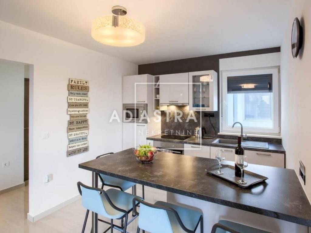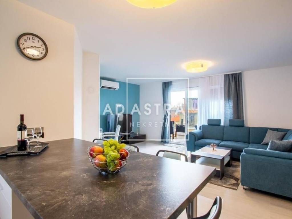 Just 500 m from the city center, a modernly furnished apartment is for sale located on the fourth floor of a quality new building with a garage and an elevator built in 2018. The net living area is 55 m2 and the apartment consists of a hallway, a storage room with a washer and dryer, one bedroom and an open-concept living area that includes a kitchen with a dining area and a living room with access to a spacious terrace that provides additional space for enjoyment.