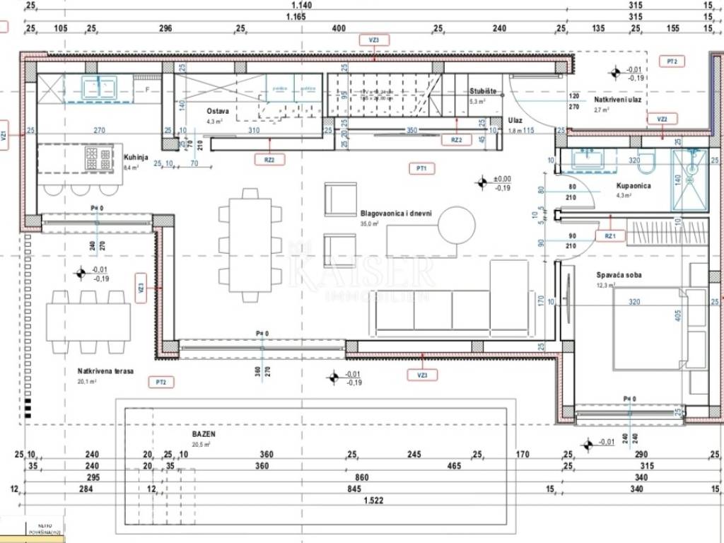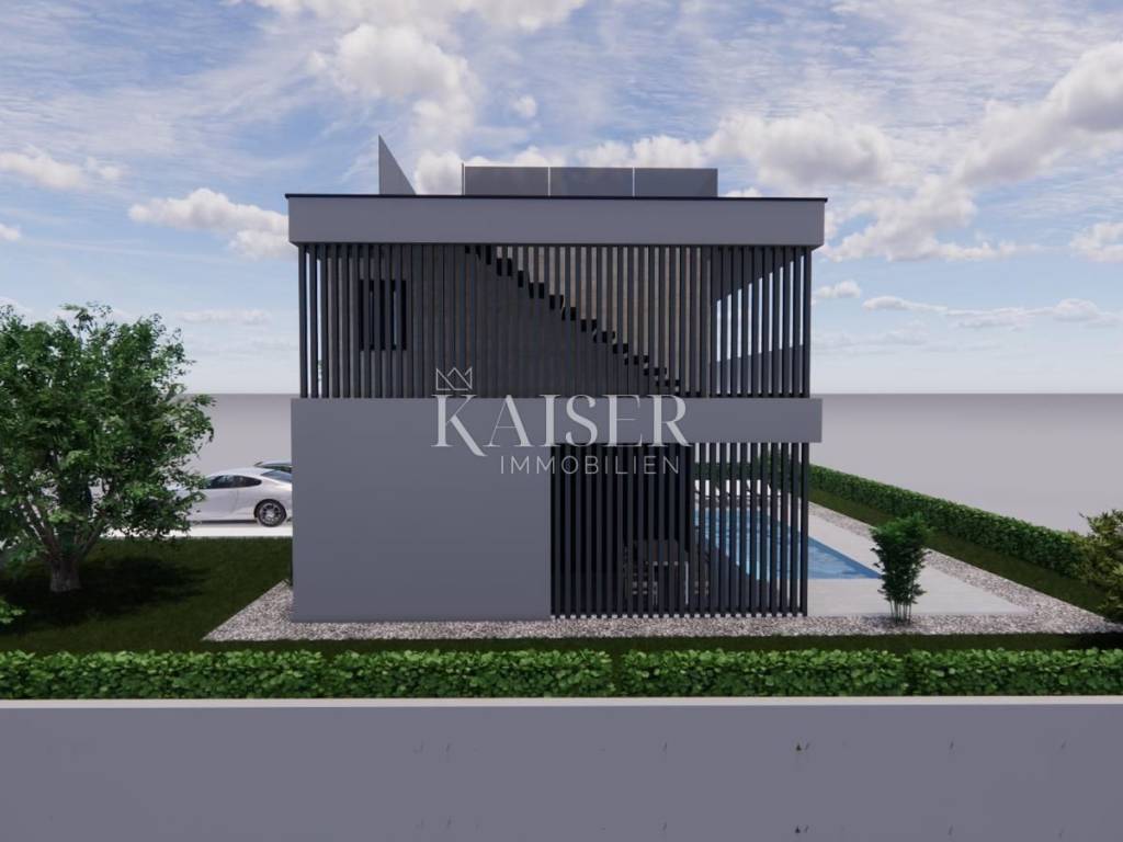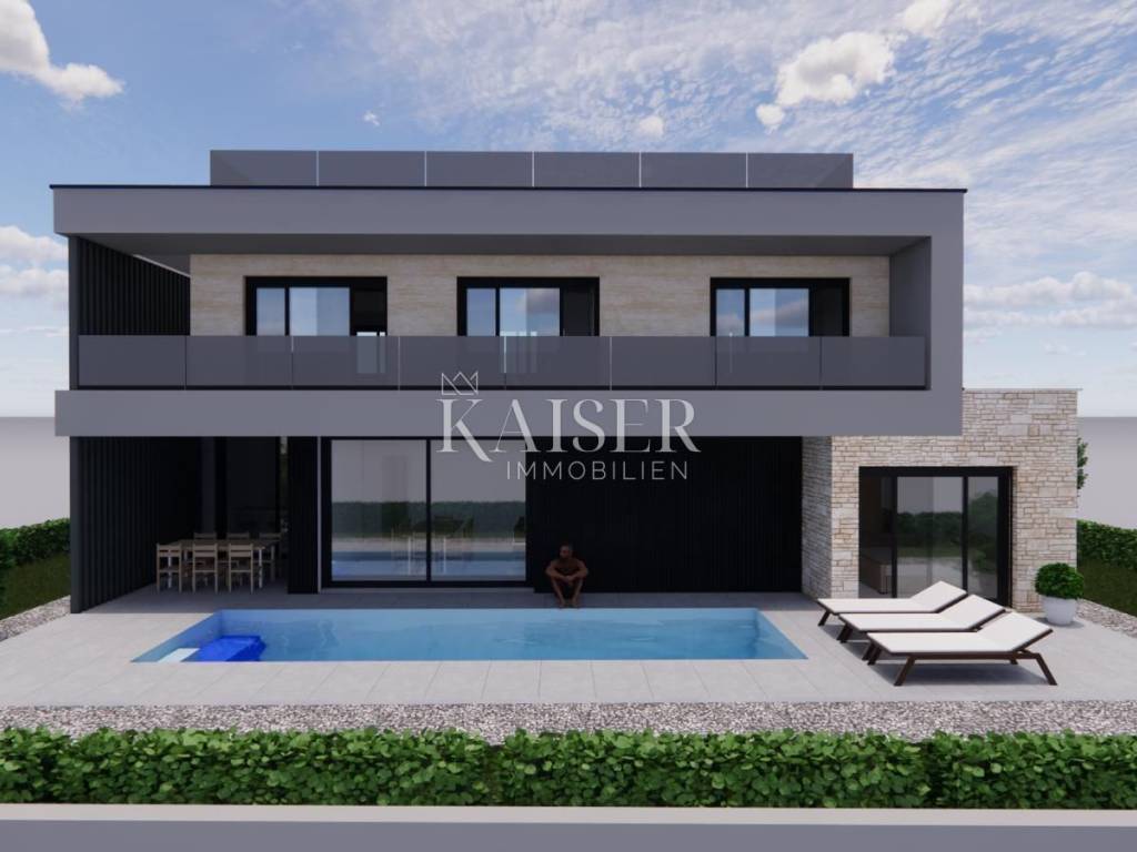 Kaiser Immobilien is offering for sale a beautiful villa with a swimming pool under construction with a sea view. This beautiful villa is located in a small Istrian traditional village with basic amenities such as a shop, school, kindergarten, clinic, pharmacy, sports center, restaurants, pizzerias, coffee bar, church, etc. The villa is spread over a plot of 500m2, and the area of the residential part is 140 m2 net. This beautiful exclusive villa consists of a ground floor and first floor and a swimming pool of 20m2. The house is divided into 2 floors. On the ground floor there is a large living room with a kitchen and dining area of 44 m2. The dining room leads to a terrace that is covered and connected to the pool and sundeck. On this floor we also have a bedroom that is also connected to the pool, a bathroom and a storage room/laundry room. An internal staircase leads to the first floor where there are 3 bedrooms with private bathrooms and a shared terrace with a stunning view of the sea. Underfloor heating is installed in the entire house along with air conditioners in all rooms. Parking for two cars is located in the yard of this beautiful modern house. The planned completion of the works is expected at the end of 2025. The house is located in a sought-after location, 6 km from the city of Poreč and the nearest beaches. Considering that it is a modern house with a swimming pool in a sought-after location, only 6 km from Poreč and the nearest beaches, the house is ideal for vacation, tourist purposes, but also for family life. Distance of the property to the city: Poreč - Pula Airport, 45 km Poreč - Ljubljana, 162 km Poreč - Vienna, 544 km Poreč - Prague, 868 km Poreč - Munich, 565 km If you are looking for this type of house, contact us with confidence on the phone number 00385 915284449, or on the email address: dean.cvitko@kaiser-immobilien.hr. The agency commission is 3% + VAT, and is charged for the first legal act.