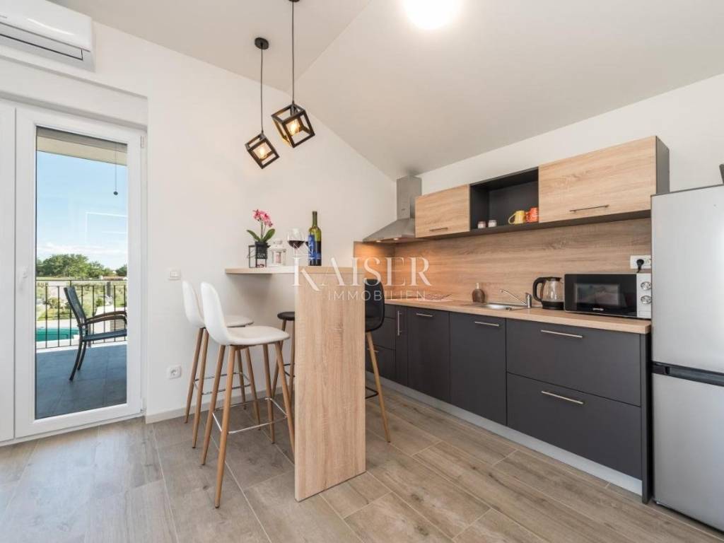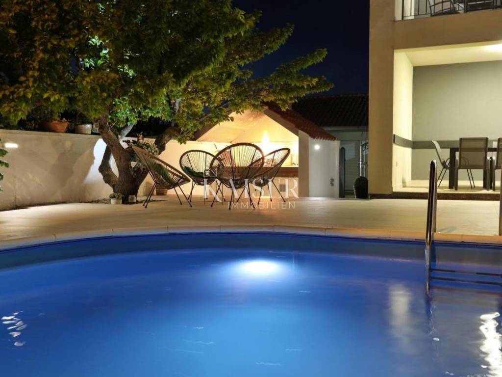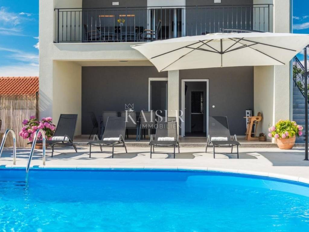 Poljica Brig, villa 150 m2 in a quiet environment, 10 km from Zadar. Kaiser Immobilien presents this modern villa located in the heart of the quiet village of Poljica Brig, just a few kilometers from the historic Zadar, as well as a few minutes from the royal city of Nin and beautiful beaches. The city of Nin was once known as a royal city in history, and in Nin there is also an 8 km long sandy beach, and a locality with medicinal mud. There are many interesting facilities nearby, such as numerous National Parks and Nature Parks, as well as beautiful islands in the Zadar waters. The nearest urban center, the city of Zadar, is 10 km away, and the nearest airport Zemunik near Zadar is 18 km away. Designed with an emphasis on elegance and functionality, this property represents a combination of luxury and practicality, offering an ideal space for living, vacationing or investing in tourist rentals, given that it already has an established tourist business. The total living area is 150 m2. It is built on a plot of 675 m2. The house consists of a ground floor and an upper floor. The ground floor has a living room, kitchen, dining room, two bedrooms and two bathrooms. . The upper floor has a similar layout with a living room, kitchen and two more bedrooms and two bathrooms. These are two residential units, which the buyer can convert into one large spacious unit at his own request. Next to the villa is an auxiliary building of 50m2, which can be a separate apartment, creating a total of 3 residential units. Luxurious Outdoor Space: Large outdoor pool for refreshment and relaxation Spacious terrace with comfortable furniture for outdoor relaxation Children's playground for entertaining the youngest family members Landscaped gardens with Mediterranean plants Amenities and Additional Information: Exclusive location in the peaceful surroundings of Poljica Briga near Nin Close to beautiful beaches and crystal clear sea Ljubač (4km), Vrsi (8km) Nin (10km) Zadar (8km) Ražanac (10km) Private parking space for several vehicles The property was completely renovated in 2019 and has proper ownership documentation (RIS and EC). The house consists of two residential units, each with its own entrance and an auxiliary building in the yard, 6 parking spaces, a swimming pool and a laundry room located under the stairs. Nin – 7 km (10 min) Zadar – 10 km (15 min) Split – 150 km (1h 30 min) Zagreb – 280 km (2h 45 min) National parks: Paklenica National Park – 55 km (45 min) Kornati National Park – access from Zadar (boat trips) Krka National Park – 85 km (1h) Plitvice Lakes National Park – 130 km (1h 45 min) The agency commission for the buyer is 3% + VAT and is paid in the case of purchasing a property, upon conclusion of the first legal act. Do not miss the opportunity to become the owner of this beautiful home that offers the perfect combination of modern design, luxury and comfort. Contact us with confidence for more information and to arrange a viewing. Tel: +385915404646 Email: vedran@kaiser-immobilien.hr