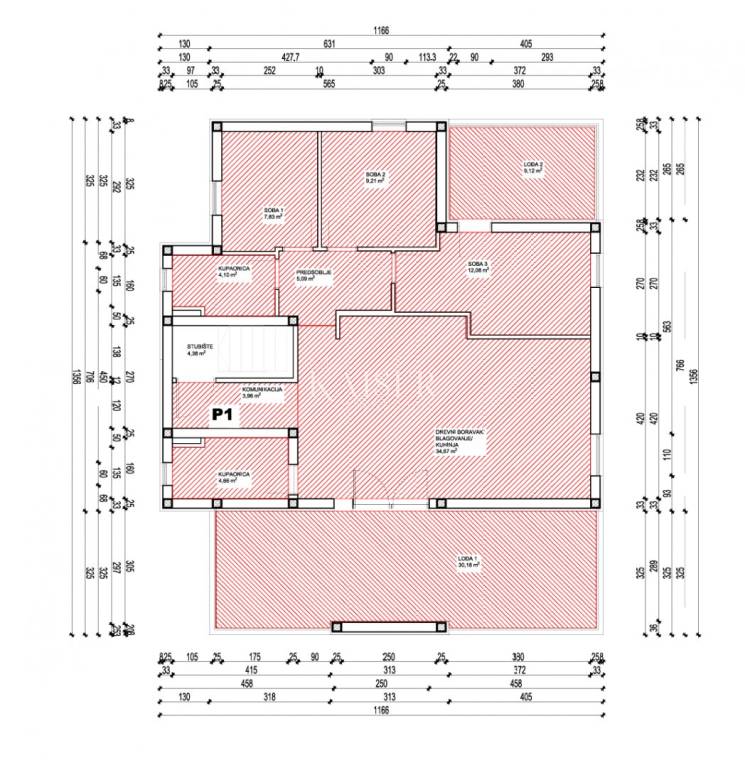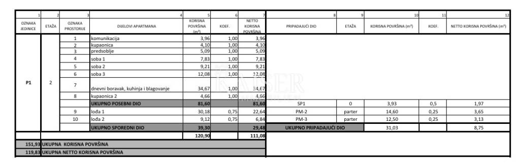 The apartment, marked P1, offers a total net usable area of 119.83 m² (including the living area, loggias and associated parts according to coefficients). The interior living space of 81.60 m² is excellently distributed, with a clearly separated living and sleeping area, and offers plenty of space for the family.
