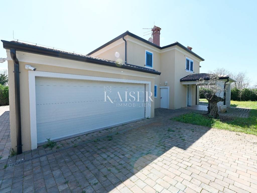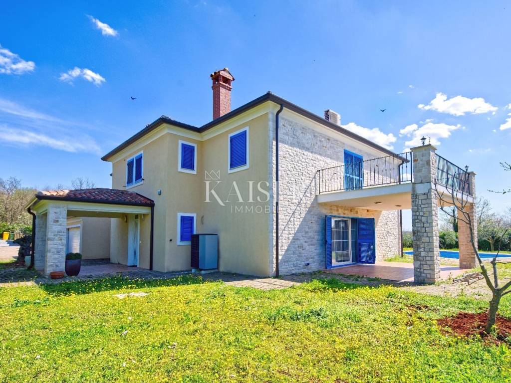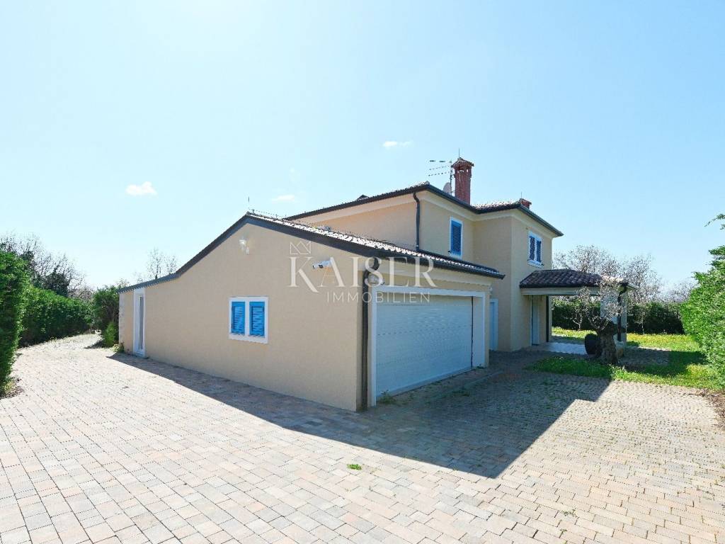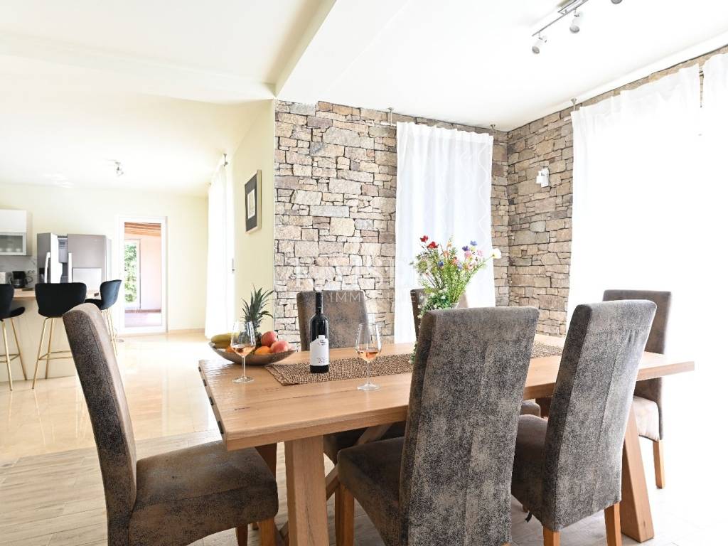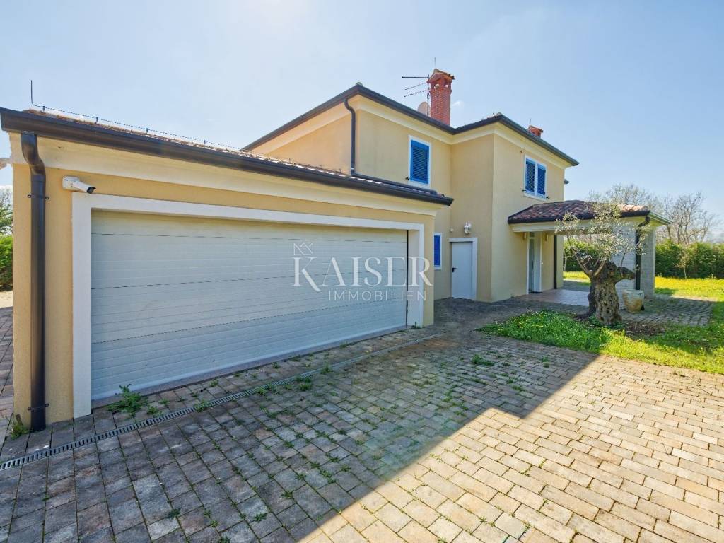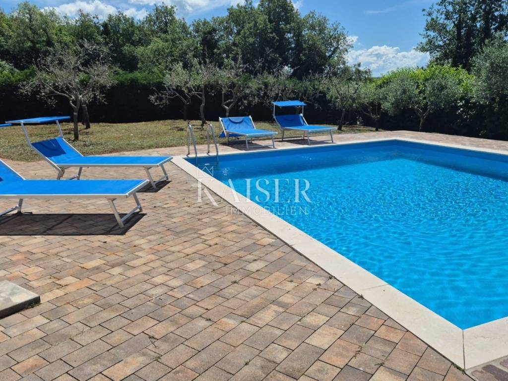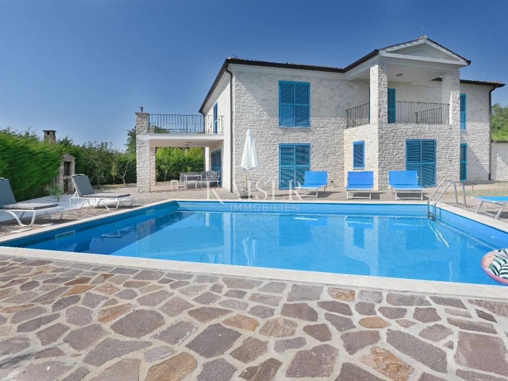 KAISER IMMOBILIEN presents you this time a beautiful villa with a large swimming pool in the town of Umag. Umag is a picturesque town in the northwest of Istria, located on the Adriatic coast, known for its rich history, Mediterranean atmosphere and developed tourism. The old town core with narrow stone streets and walls bears witness to the Roman and Venetian heritage, while modern Umag offers well-maintained beaches, promenades and sports facilities. The town is particularly recognizable for the ATP Croatia Open tennis tournament, which attracts visitors from all over the world every year, and the combination of sea, culture and gastronomy makes Umag an attractive place to relax and live. This beautiful holiday villa is located in a quiet and secluded location, far from the hustle and bustle of the city, in an exceptionally beautiful position that provides complete privacy and relaxation. It is surrounded by a very large garden, enriched with centuries-old olive trees that create a special Mediterranean atmosphere and a sense of connection with nature. The villa is built in an authentic Istrian style, with carefully preserved traditional elements such as stone and warm natural materials, which are harmoniously complemented by details of modern architecture. The combination of indigenous Istrian motifs and contemporary design results in an elegant, comfortable and functional space, ideal for a peaceful and luxurious holiday in the heart of Istria. The villa has been designed with special attention to comfort, functionality and a sense of spaciousness. Entering the hall opens the way to an exceptionally large and bright living room, designed in a modern *open space* style, in which the living area, elegant dining room and fully equipped kitchen are harmoniously connected. This layout creates an ideal environment for socializing, relaxing and sharing moments in a pleasant atmosphere. The villa has five separate bedrooms, each of identical size, which ensures the same level of comfort for all guests. There are also two modern bathrooms, as well as an additional, separate toilet. A special room is intended for sports and recreation and is decorated as a fitness room, allowing for active stay in the privacy of your own space. For a pleasant temperature throughout the year, the villa has a heating and cooling system via air conditioning, as well as a heat pump connected to underfloor heating, which guarantees a superior level of comfort in all seasons. The outdoor area is a true little Mediterranean paradise. The spacious garden is surrounded by an olive grove that provides natural shade and a sense of peace, while the large 6 x 8 meter swimming pool invites you to refresh and enjoy the warm summer days. The large terrace offers enough space for outdoor activities, relaxing in the shade with a glass of cold drink, sunbathing or evening gatherings. There is a special area for barbecues and relaxing in comfortable armchairs, making this villa the perfect place for a carefree and luxurious vacation in the Istrian environment.