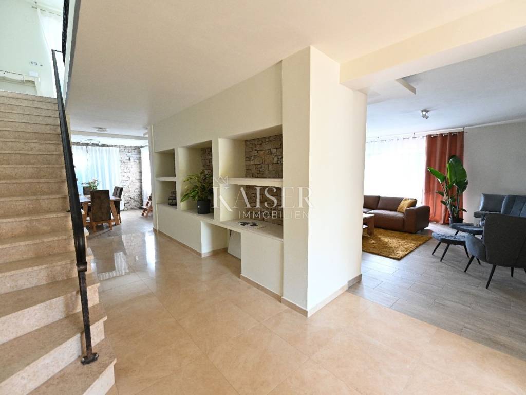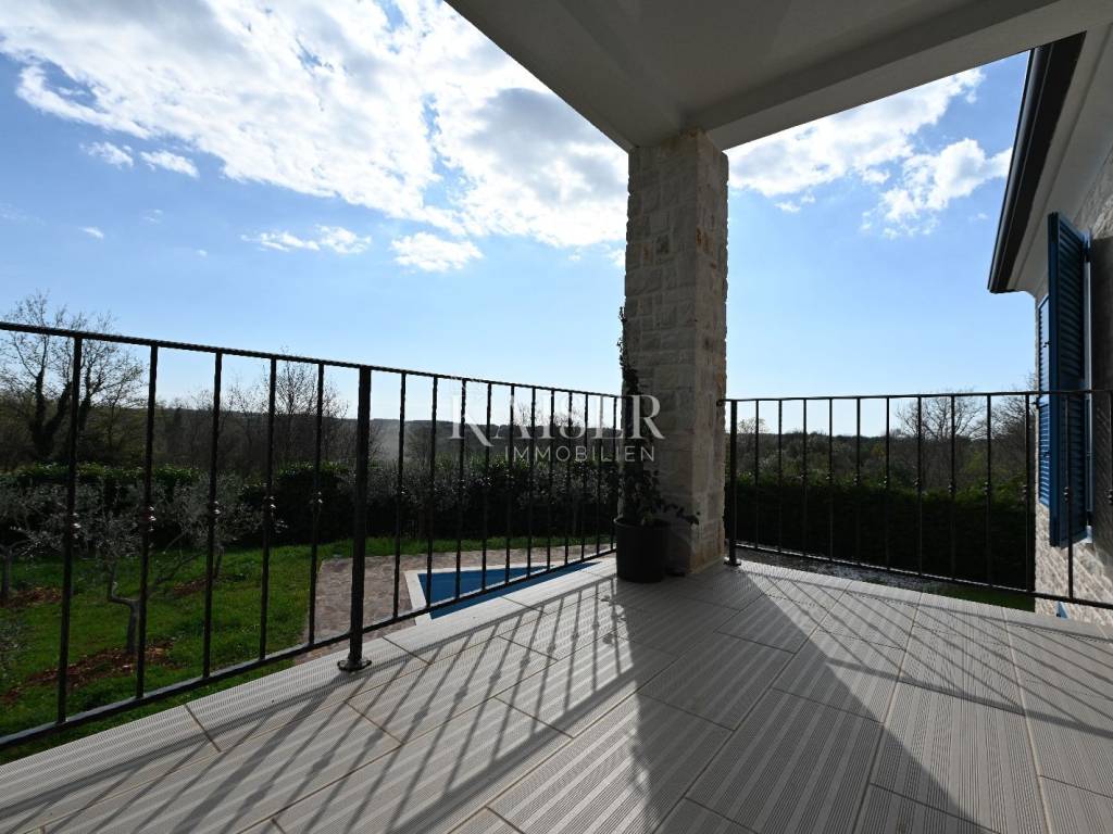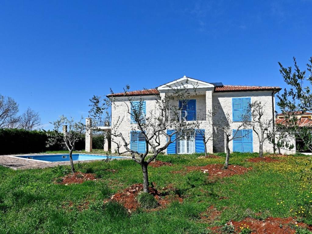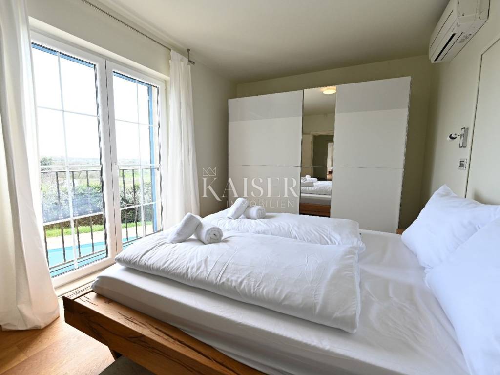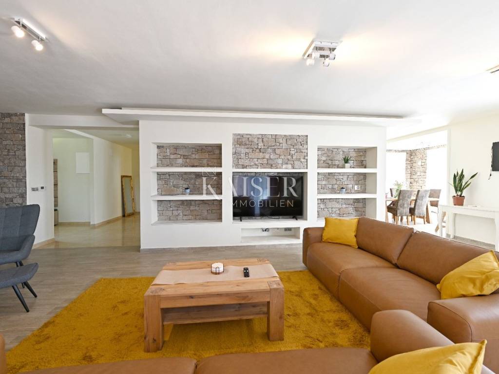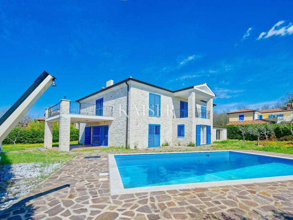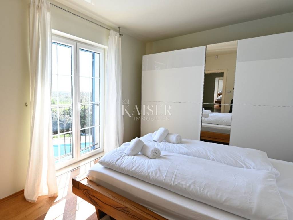 KAISER IMMOBILIEN presents you this time a beautiful villa with a large swimming pool in the town of Umag. Umag is a picturesque town in the northwest of Istria, located on the Adriatic coast, known for its rich history, Mediterranean atmosphere and developed tourism. The old town core with narrow stone streets and walls bears witness to the Roman and Venetian heritage, while modern Umag offers well-maintained beaches, promenades and sports facilities. The town is particularly recognizable for the ATP Croatia Open tennis tournament, which attracts visitors from all over the world every year, and the combination of sea, culture and gastronomy makes Umag an attractive place to relax and live. This beautiful holiday villa is located in a quiet and secluded location, far from the hustle and bustle of the city, in an exceptionally beautiful position that provides complete privacy and relaxation. It is surrounded by a very large garden, enriched with centuries-old olive trees that create a special Mediterranean atmosphere and a sense of connection with nature. The villa is built in an authentic Istrian style, with carefully preserved traditional elements such as stone and warm natural materials, which are harmoniously complemented by details of modern architecture. The combination of indigenous Istrian motifs and contemporary design results in an elegant, comfortable and functional space, ideal for a peaceful and luxurious holiday in the heart of Istria. The villa has been designed with special attention to comfort, functionality and a sense of spaciousness. Entering the hall opens the way to an exceptionally large and bright living room, designed in a modern *open space* style, in which the living area, elegant dining room and fully equipped kitchen are harmoniously connected. This layout creates an ideal environment for socializing, relaxing and sharing moments in a pleasant atmosphere. The villa has five separate bedrooms, each of identical size, which ensures the same level of comfort for all guests. There are also two modern bathrooms, as well as an additional, separate toilet. A special room is intended for sports and recreation and is decorated as a fitness room, allowing for active stay in the privacy of your own space. For a pleasant temperature throughout the year, the villa has a heating and cooling system via air conditioning, as well as a heat pump connected to underfloor heating, which guarantees a superior level of comfort in all seasons. The outdoor area is a true little Mediterranean paradise. The spacious garden is surrounded by an olive grove that provides natural shade and a sense of peace, while the large 6 x 8 meter swimming pool invites you to refresh and enjoy the warm summer days. The large terrace offers enough space for outdoor activities, relaxing in the shade with a glass of cold drink, sunbathing or evening gatherings. There is a special area for barbecues and relaxing in comfortable armchairs, making this villa the perfect place for a carefree and luxurious vacation in the Istrian environment.