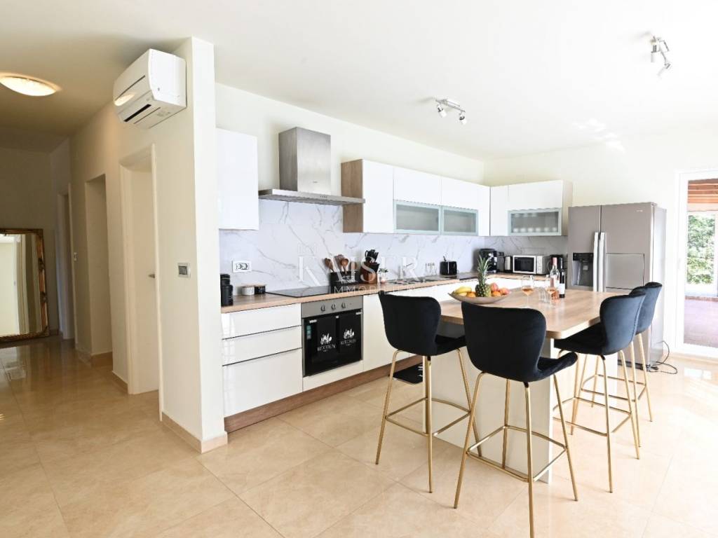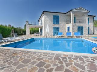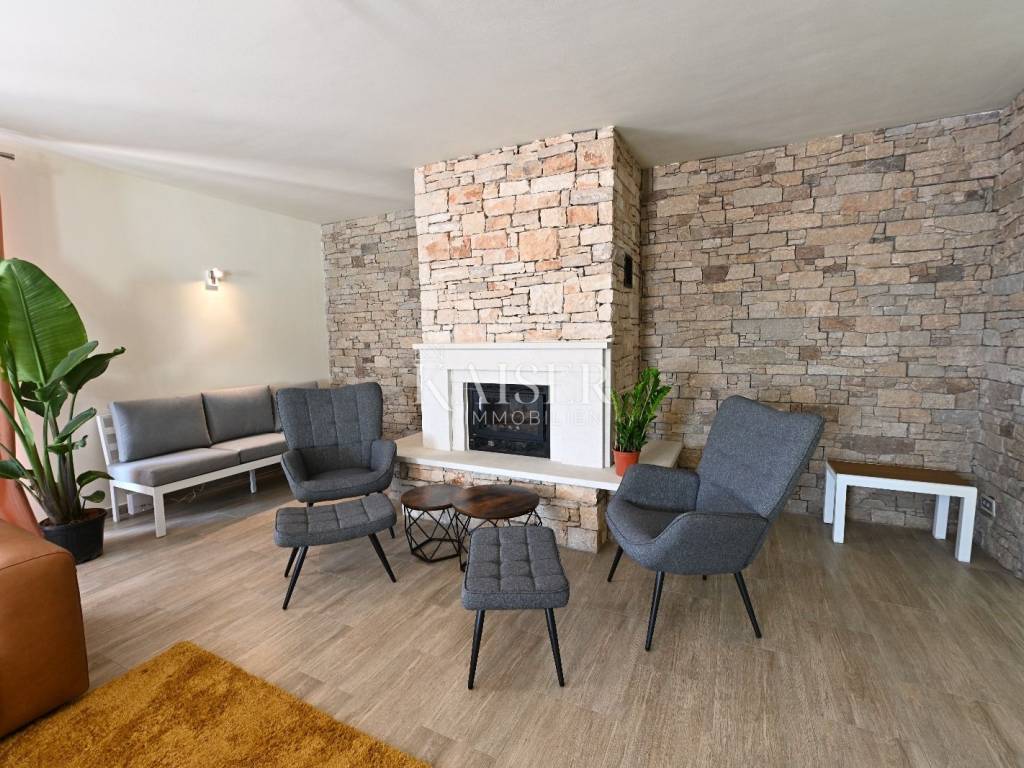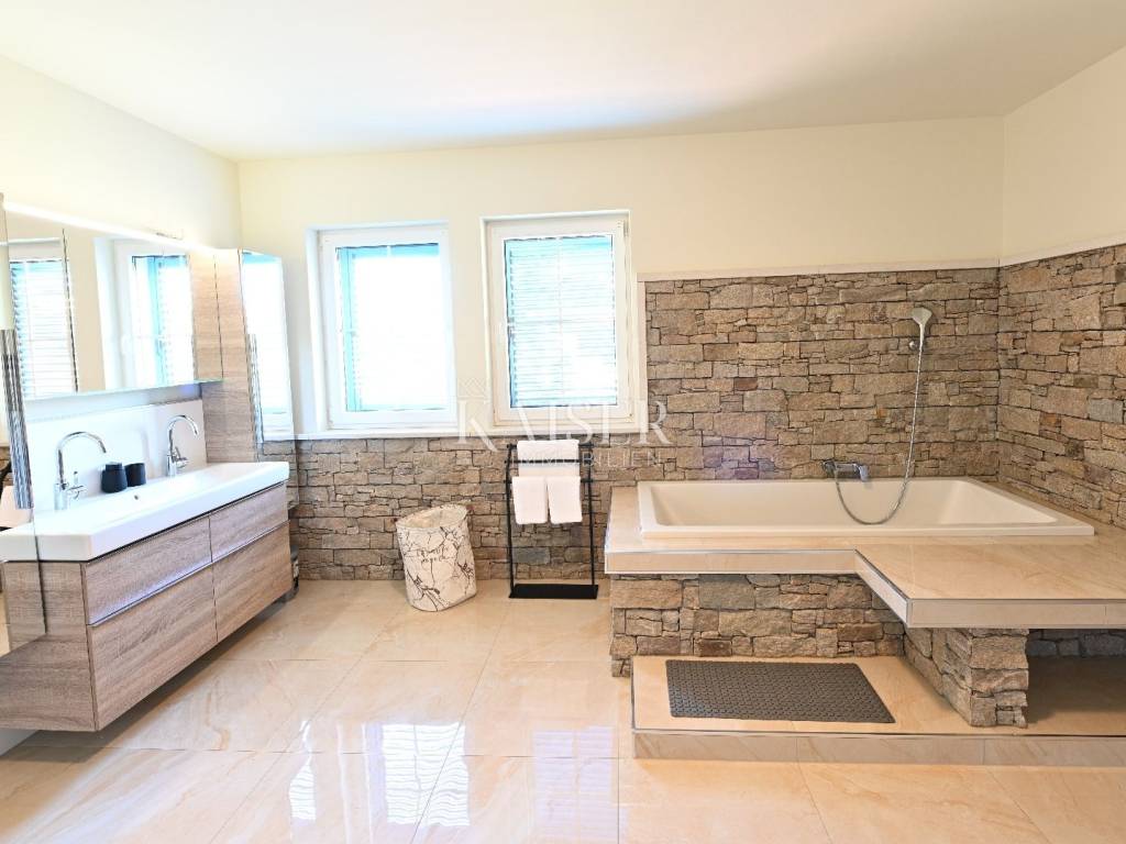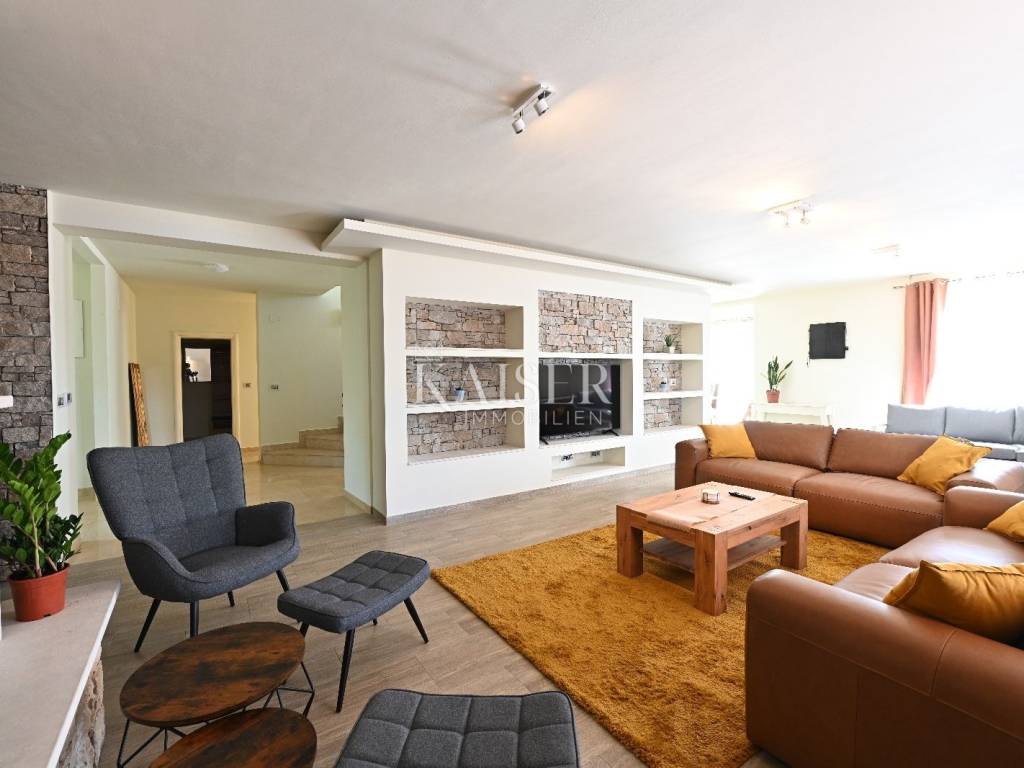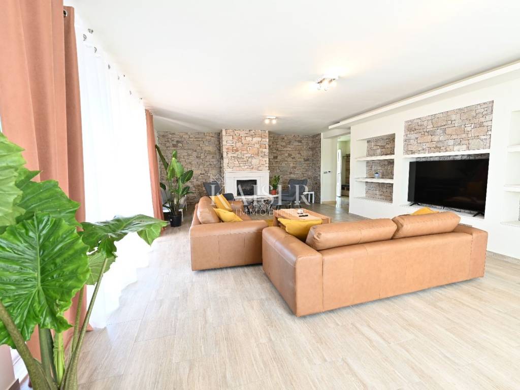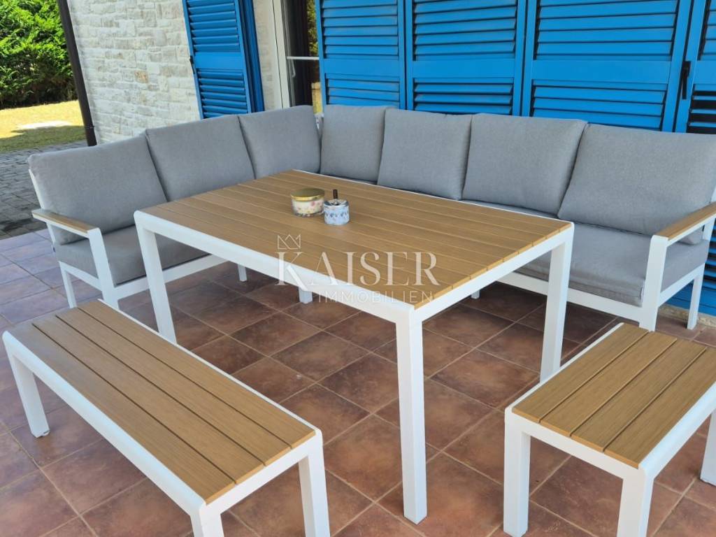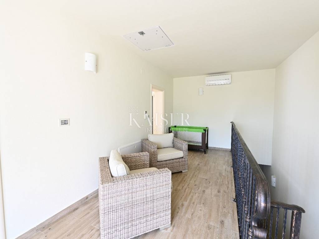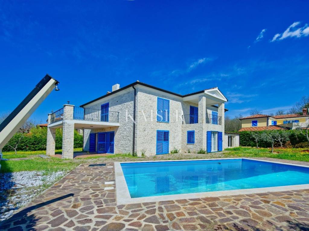 KAISER IMMOBILIEN presents you this time a beautiful villa with a large swimming pool in the town of Umag. Umag is a picturesque town in the northwest of Istria, located on the Adriatic coast, known for its rich history, Mediterranean atmosphere and developed tourism. The old town core with narrow stone streets and walls bears witness to the Roman and Venetian heritage, while modern Umag offers well-maintained beaches, promenades and sports facilities. The town is particularly recognizable for the ATP Croatia Open tennis tournament, which attracts visitors from all over the world every year, and the combination of sea, culture and gastronomy makes Umag an attractive place to relax and live. This beautiful holiday villa is located in a quiet and secluded location, far from the hustle and bustle of the city, in an exceptionally beautiful position that provides complete privacy and relaxation. It is surrounded by a very large garden, enriched with centuries-old olive trees that create a special Mediterranean atmosphere and a sense of connection with nature. The villa is built in an authentic Istrian style, with carefully preserved traditional elements such as stone and warm natural materials, which are harmoniously complemented by details of modern architecture. The combination of indigenous Istrian motifs and contemporary design results in an elegant, comfortable and functional space, ideal for a peaceful and luxurious holiday in the heart of Istria. The villa has been designed with special attention to comfort, functionality and a sense of spaciousness. Entering the hall opens the way to an exceptionally large and bright living room, designed in a modern *open space* style, in which the living area, elegant dining room and fully equipped kitchen are harmoniously connected. This layout creates an ideal environment for socializing, relaxing and sharing moments in a pleasant atmosphere. The villa has five separate bedrooms, each of identical size, which ensures the same level of comfort for all guests. There are also two modern bathrooms, as well as an additional, separate toilet. A special room is intended for sports and recreation and is decorated as a fitness room, allowing for active stay in the privacy of your own space. For a pleasant temperature throughout the year, the villa has a heating and cooling system via air conditioning, as well as a heat pump connected to underfloor heating, which guarantees a superior level of comfort in all seasons. The outdoor area is a true little Mediterranean paradise. The spacious garden is surrounded by an olive grove that provides natural shade and a sense of peace, while the large 6 x 8 meter swimming pool invites you to refresh and enjoy the warm summer days. The large terrace offers enough space for outdoor activities, relaxing in the shade with a glass of cold drink, sunbathing or evening gatherings. There is a special area for barbecues and relaxing in comfortable armchairs, making this villa the perfect place for a carefree and luxurious vacation in the Istrian environment.