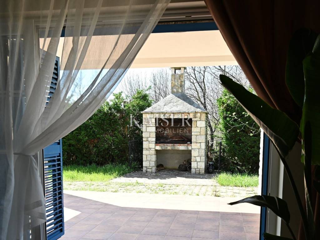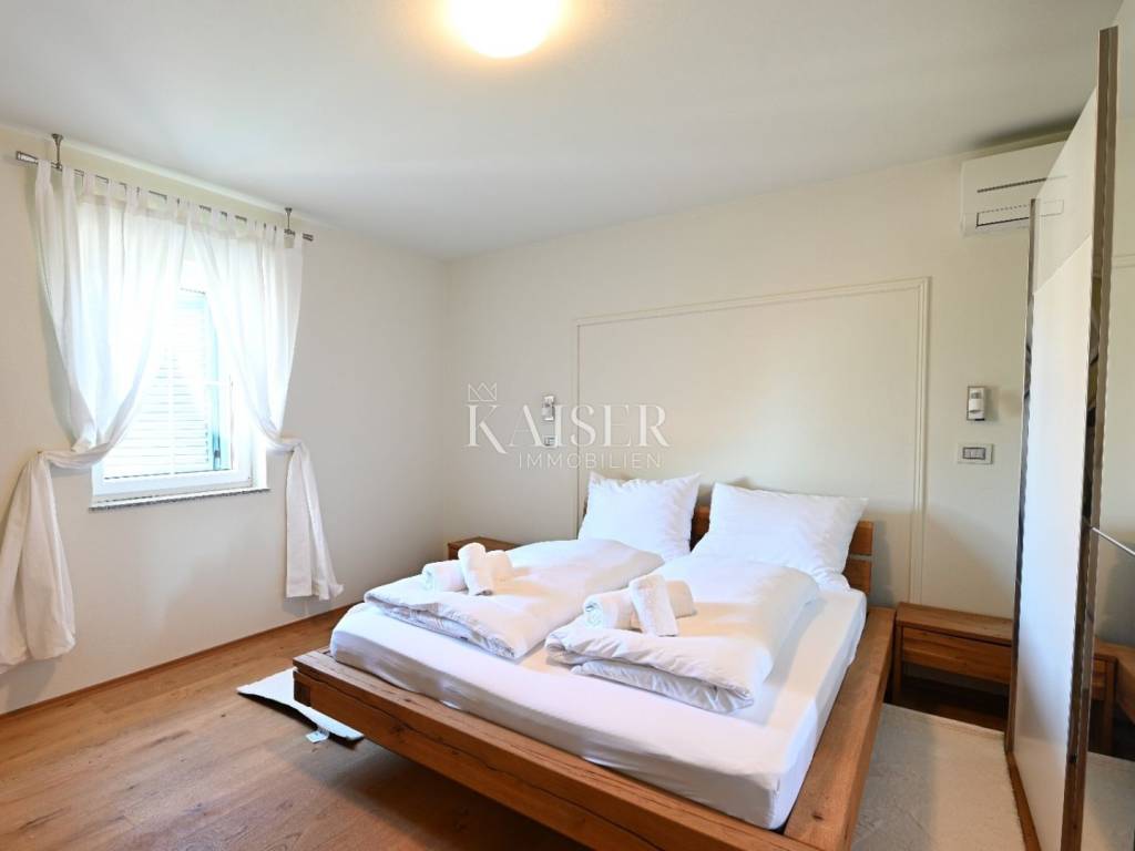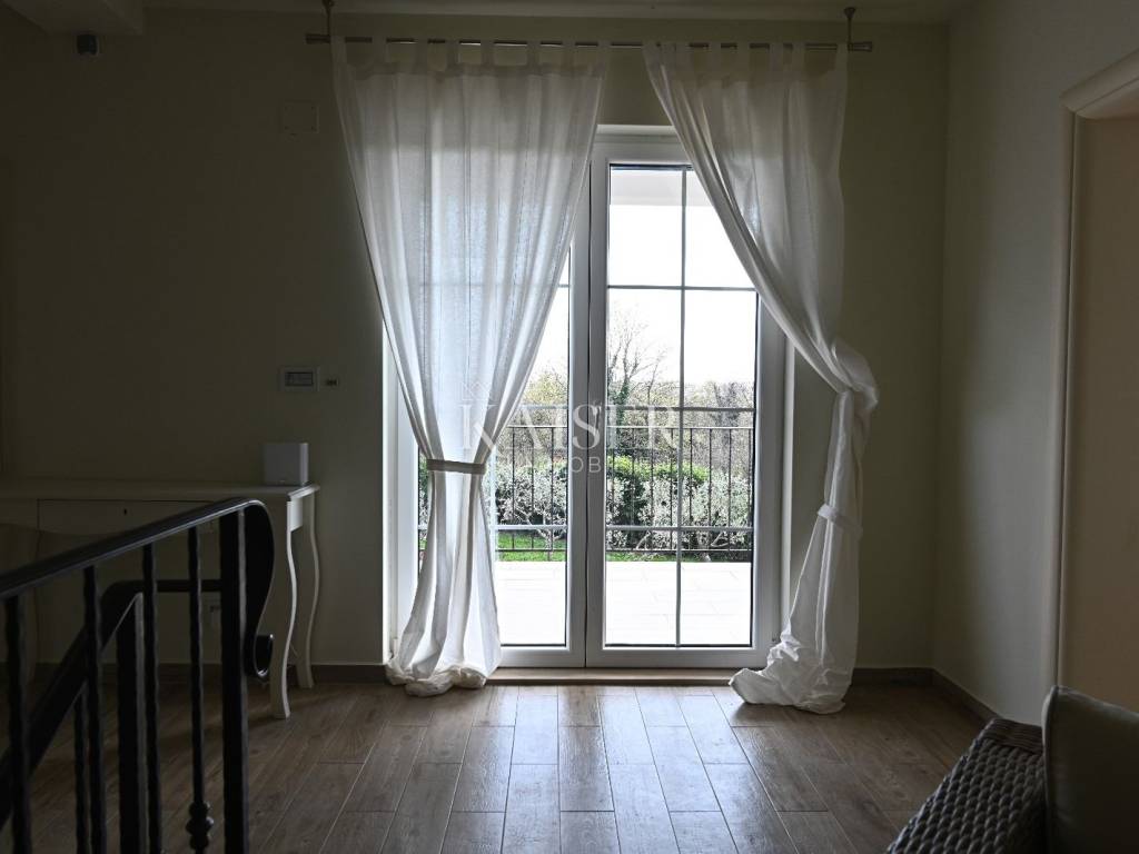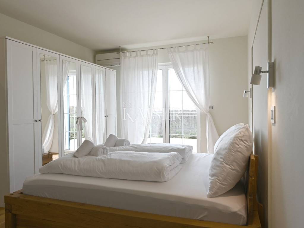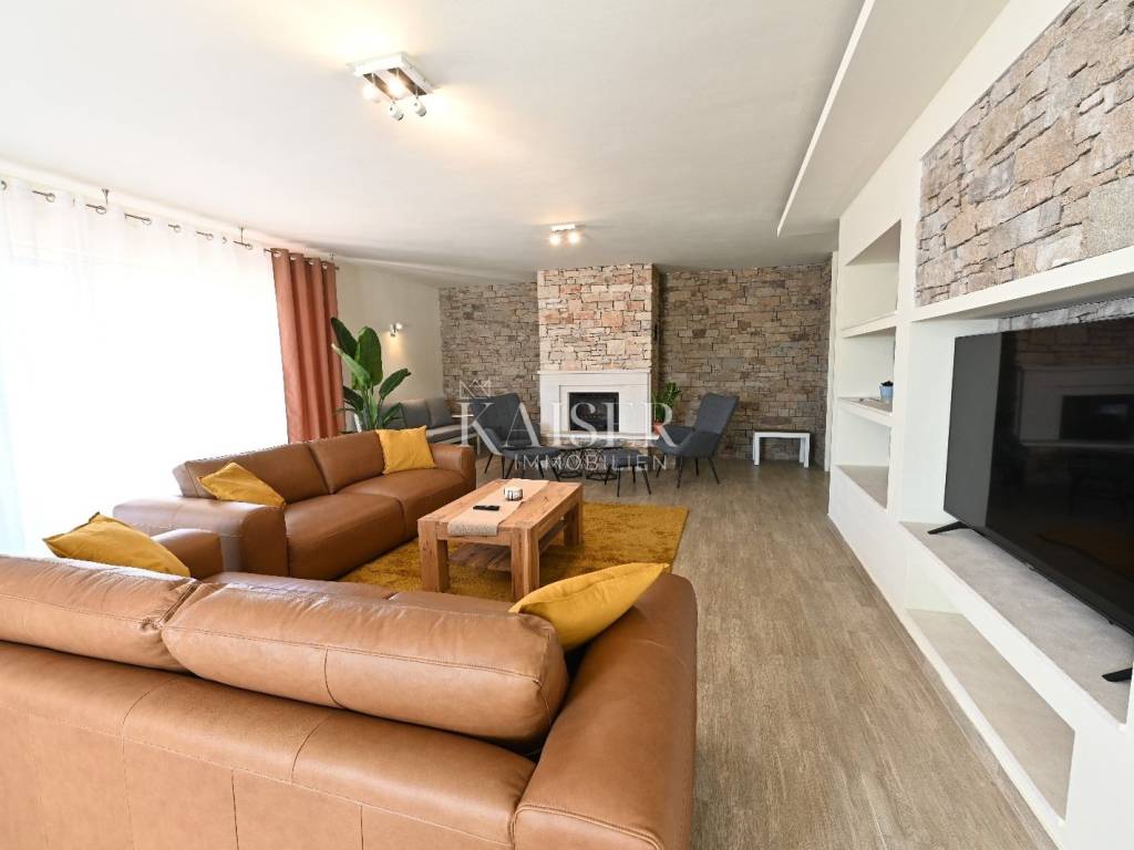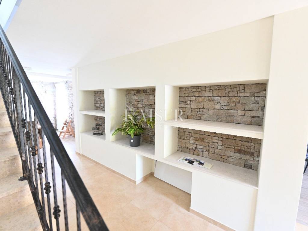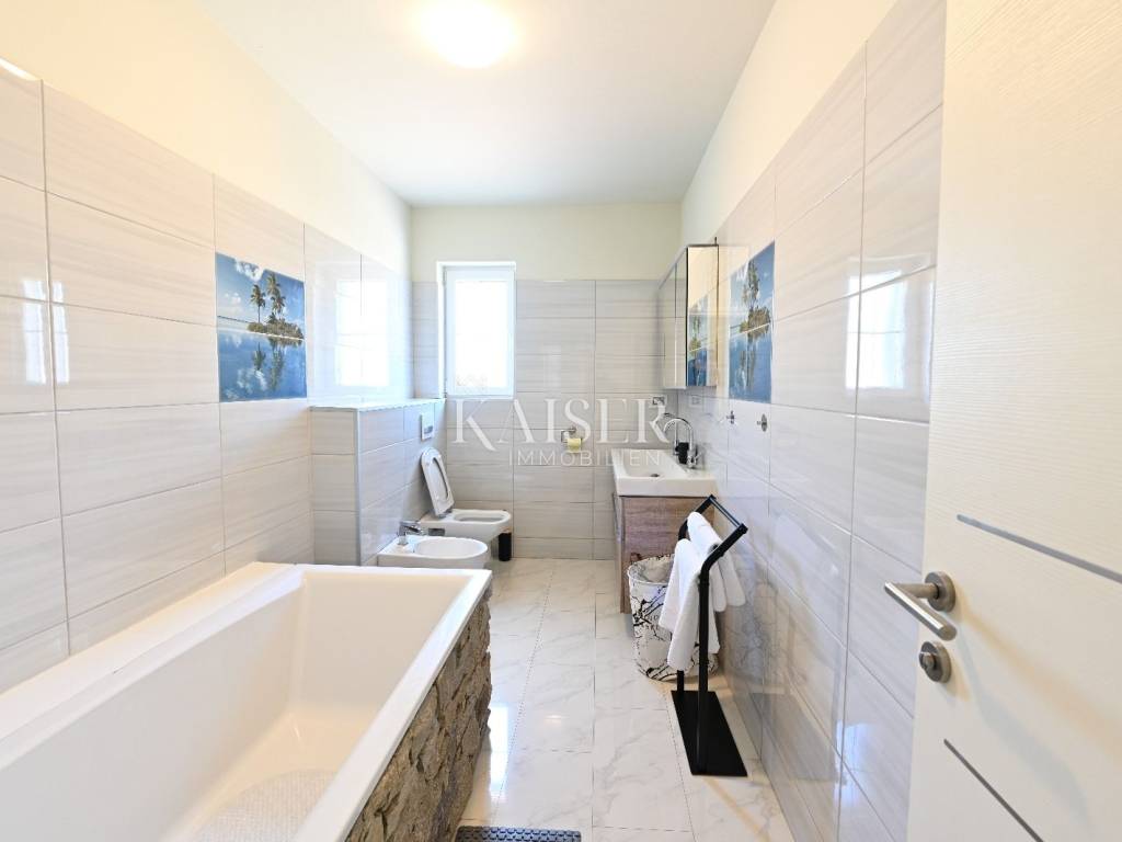 KAISER IMMOBILIEN presents you this time a beautiful villa with a large swimming pool in the town of Umag. Umag is a picturesque town in the northwest of Istria, located on the Adriatic coast, known for its rich history, Mediterranean atmosphere and developed tourism. The old town core with narrow stone streets and walls bears witness to the Roman and Venetian heritage, while modern Umag offers well-maintained beaches, promenades and sports facilities. The town is particularly recognizable for the ATP Croatia Open tennis tournament, which attracts visitors from all over the world every year, and the combination of sea, culture and gastronomy makes Umag an attractive place to relax and live. This beautiful holiday villa is located in a quiet and secluded location, far from the hustle and bustle of the city, in an exceptionally beautiful position that provides complete privacy and relaxation. It is surrounded by a very large garden, enriched with centuries-old olive trees that create a special Mediterranean atmosphere and a sense of connection with nature. The villa is built in an authentic Istrian style, with carefully preserved traditional elements such as stone and warm natural materials, which are harmoniously complemented by details of modern architecture. The combination of indigenous Istrian motifs and contemporary design results in an elegant, comfortable and functional space, ideal for a peaceful and luxurious holiday in the heart of Istria. The villa has been designed with special attention to comfort, functionality and a sense of spaciousness. Entering the hall opens the way to an exceptionally large and bright living room, designed in a modern *open space* style, in which the living area, elegant dining room and fully equipped kitchen are harmoniously connected. This layout creates an ideal environment for socializing, relaxing and sharing moments in a pleasant atmosphere. The villa has five separate bedrooms, each of identical size, which ensures the same level of comfort for all guests. There are also two modern bathrooms, as well as an additional, separate toilet. A special room is intended for sports and recreation and is decorated as a fitness room, allowing for active stay in the privacy of your own space. For a pleasant temperature throughout the year, the villa has a heating and cooling system via air conditioning, as well as a heat pump connected to underfloor heating, which guarantees a superior level of comfort in all seasons. The outdoor area is a true little Mediterranean paradise. The spacious garden is surrounded by an olive grove that provides natural shade and a sense of peace, while the large 6 x 8 meter swimming pool invites you to refresh and enjoy the warm summer days. The large terrace offers enough space for outdoor activities, relaxing in the shade with a glass of cold drink, sunbathing or evening gatherings. There is a special area for barbecues and relaxing in comfortable armchairs, making this villa the perfect place for a carefree and luxurious vacation in the Istrian environment.