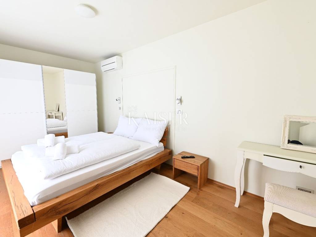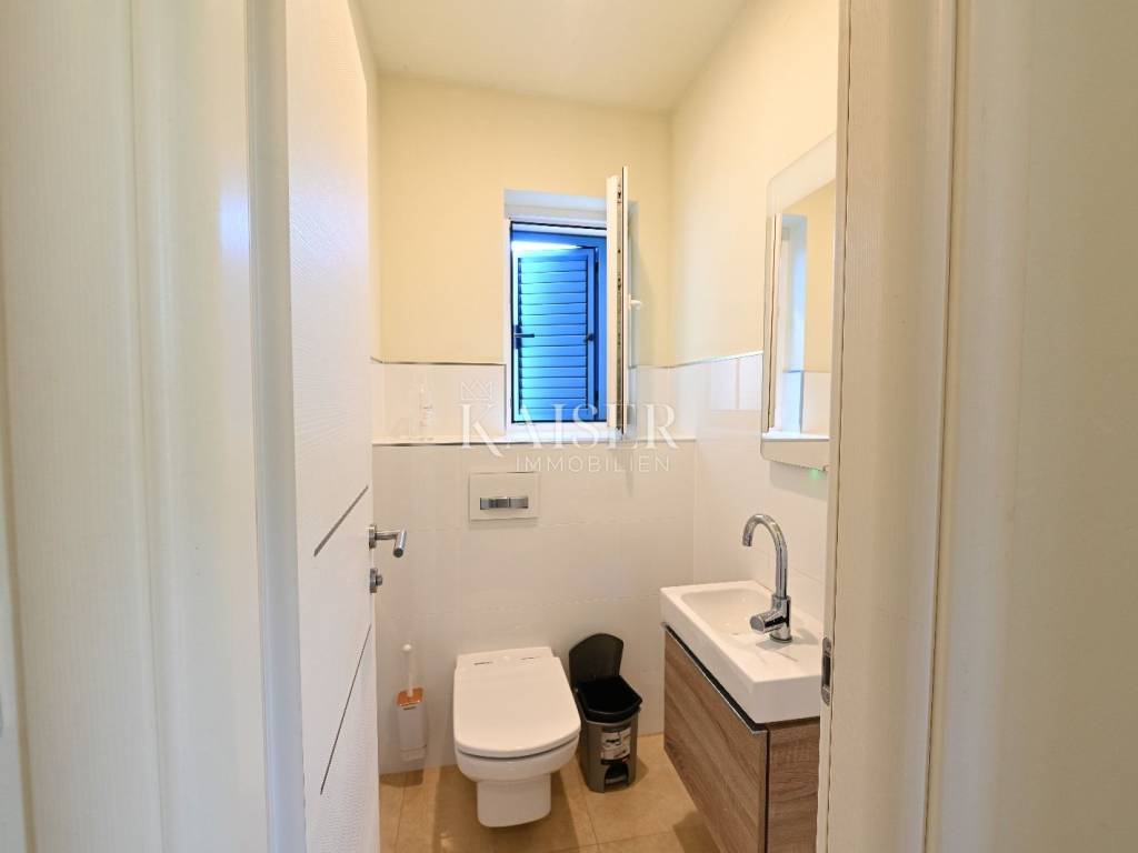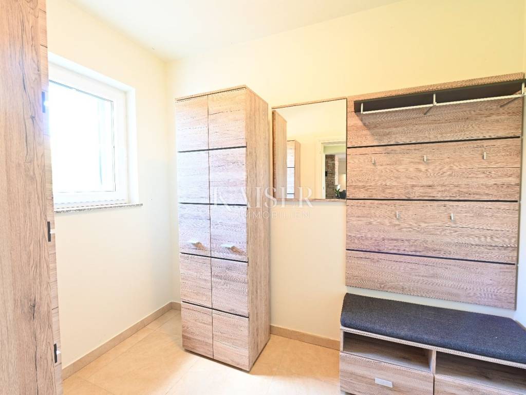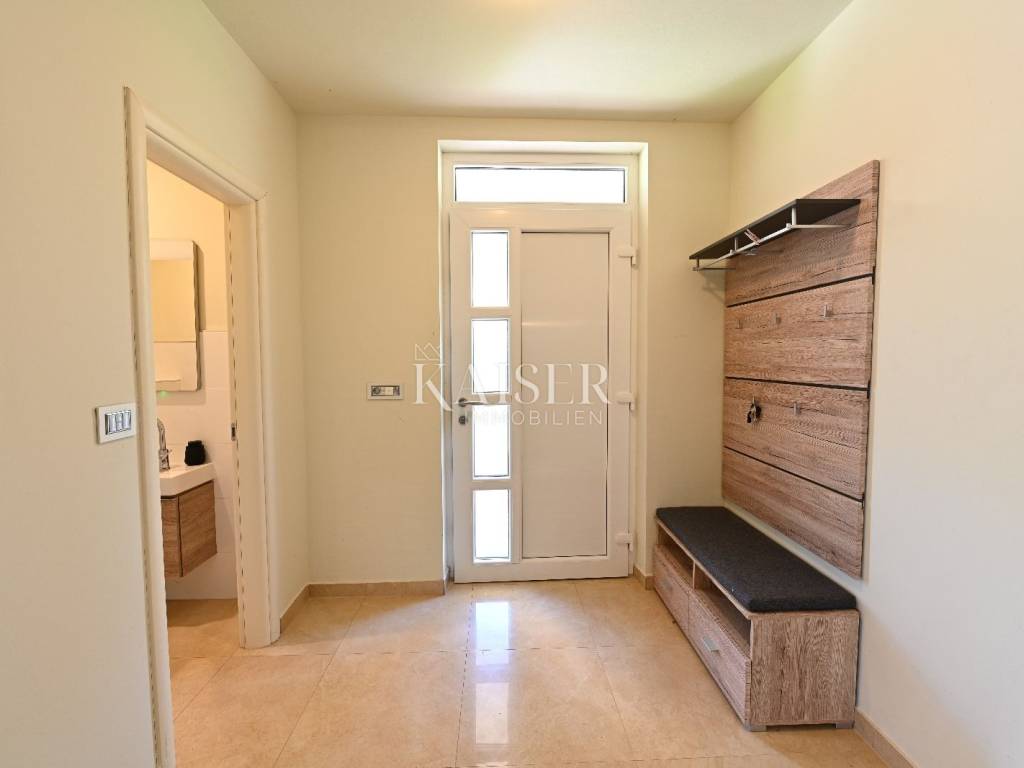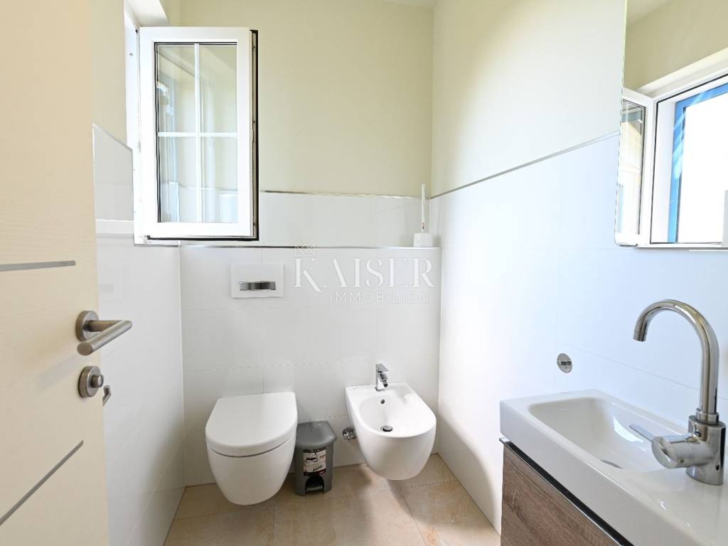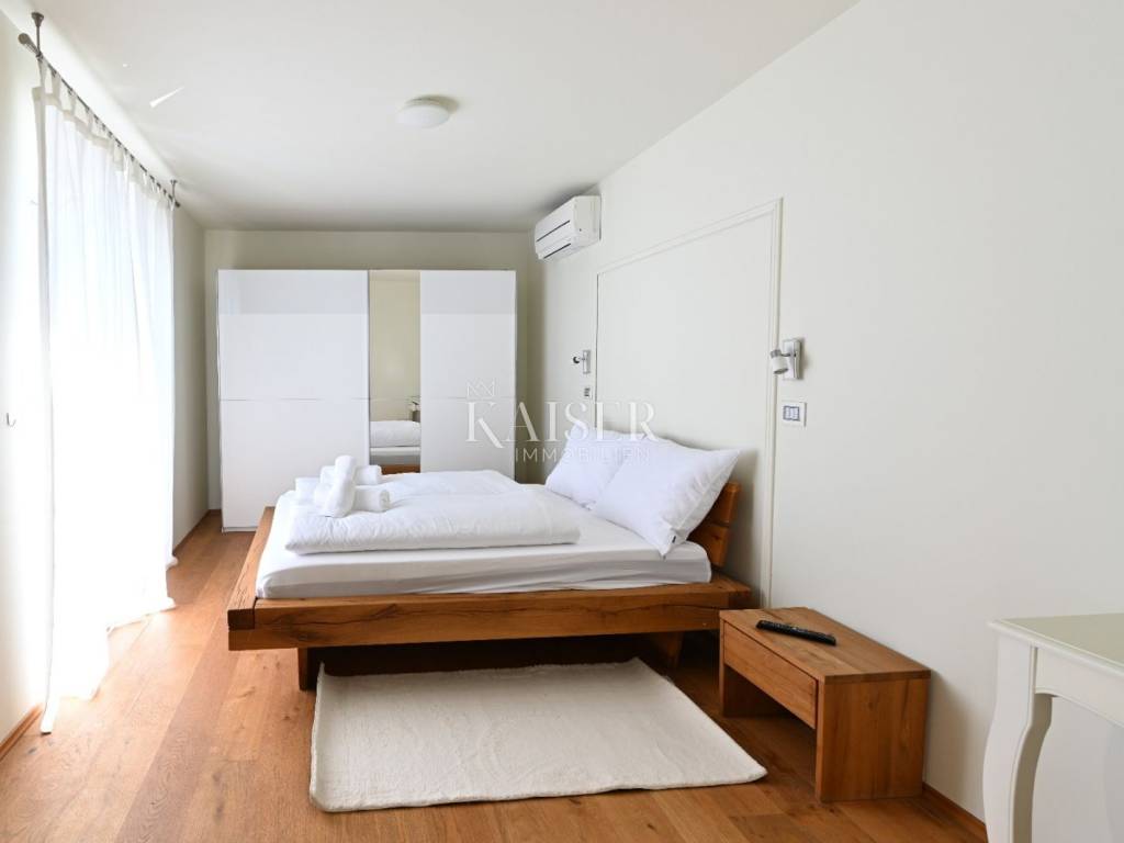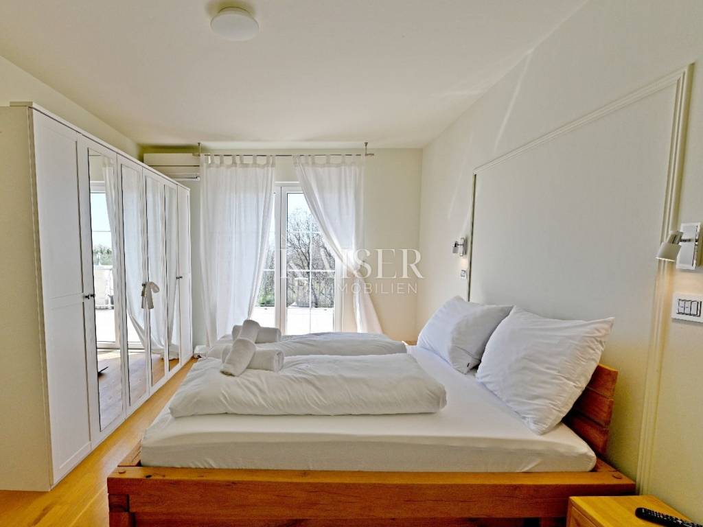KAISER IMMOBILIEN presents you this time a beautiful villa with a large swimming pool in the town of Umag. Umag is a picturesque town in the northwest of Istria, located on the Adriatic coast, known for its rich history, Mediterranean atmosphere and developed tourism. The old town core with narrow stone streets and walls bears witness to the Roman and Venetian heritage, while modern Umag offers well-maintained beaches, promenades and sports facilities. The town is particularly recognizable for the ATP Croatia Open tennis tournament, which attracts visitors from all over the world every year, and the combination of sea, culture and gastronomy makes Umag an attractive place to relax and live. This beautiful holiday villa is located in a quiet and secluded location, far from the hustle and bustle of the city, in an exceptionally beautiful position that provides complete privacy and relaxation. It is surrounded by a very large garden, enriched with centuries-old olive trees that create a special Mediterranean atmosphere and a sense of connection with nature. The villa is built in an authentic Istrian style, with carefully preserved traditional elements such as stone and warm natural materials, which are harmoniously complemented by details of modern architecture. The combination of indigenous Istrian motifs and contemporary design results in an elegant, comfortable and functional space, ideal for a peaceful and luxurious holiday in the heart of Istria. The villa has been designed with special attention to comfort, functionality and a sense of spaciousness. Entering the hall opens the way to an exceptionally large and bright living room, designed in a modern *open space* style, in which the living area, elegant dining room and fully equipped kitchen are harmoniously connected. This layout creates an ideal environment for socializing, relaxing and sharing moments in a pleasant atmosphere. The villa has five separate bedrooms, each of identical size, which ensures the same level of comfort for all guests. There are also two modern bathrooms, as well as an additional, separate toilet. A special room is intended for sports and recreation and is decorated as a fitness room, allowing for active stay in the privacy of your own space. For a pleasant temperature throughout the year, the villa has a heating and cooling system via air conditioning, as well as a heat pump connected to underfloor heating, which guarantees a superior level of comfort in all seasons. The outdoor area is a true little Mediterranean paradise. The spacious garden is surrounded by an olive grove that provides natural shade and a sense of peace, while the large 6 x 8 meter swimming pool invites you to refresh and enjoy the warm summer days. The large terrace offers enough space for outdoor activities, relaxing in the shade with a glass of cold drink, sunbathing or evening gatherings. There is a special area for barbecues and relaxing in comfortable armchairs, making this villa the perfect place for a carefree and luxurious vacation in the Istrian environment.