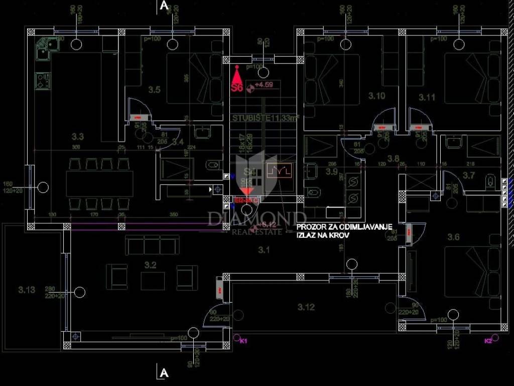 Apartment S4 is located on the second floor of a smaller residential building. This comfortable, luxurious apartment consists of a hallway, anteroom, three modern bathrooms, living room, kitchen and dining room, four spacious bedrooms, a terrace and a loggia, which makes a total square footage of 146.39 m2. The apartment also has a storage room with a gross area of 3.15 m2, which is not included in the square footage of the apartment, as well as one outdoor parking space and two garage spaces. The orientation of the apartment is south-southwest, which brings plenty of natural light, and the fascinating view of the sea will delight you even more!