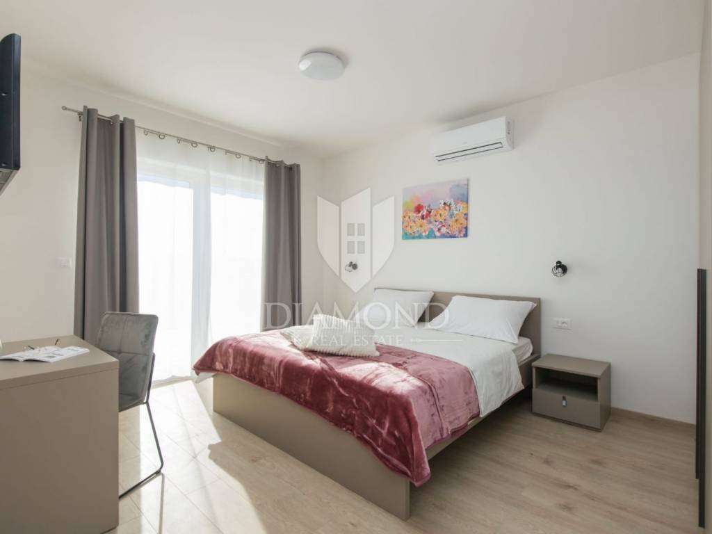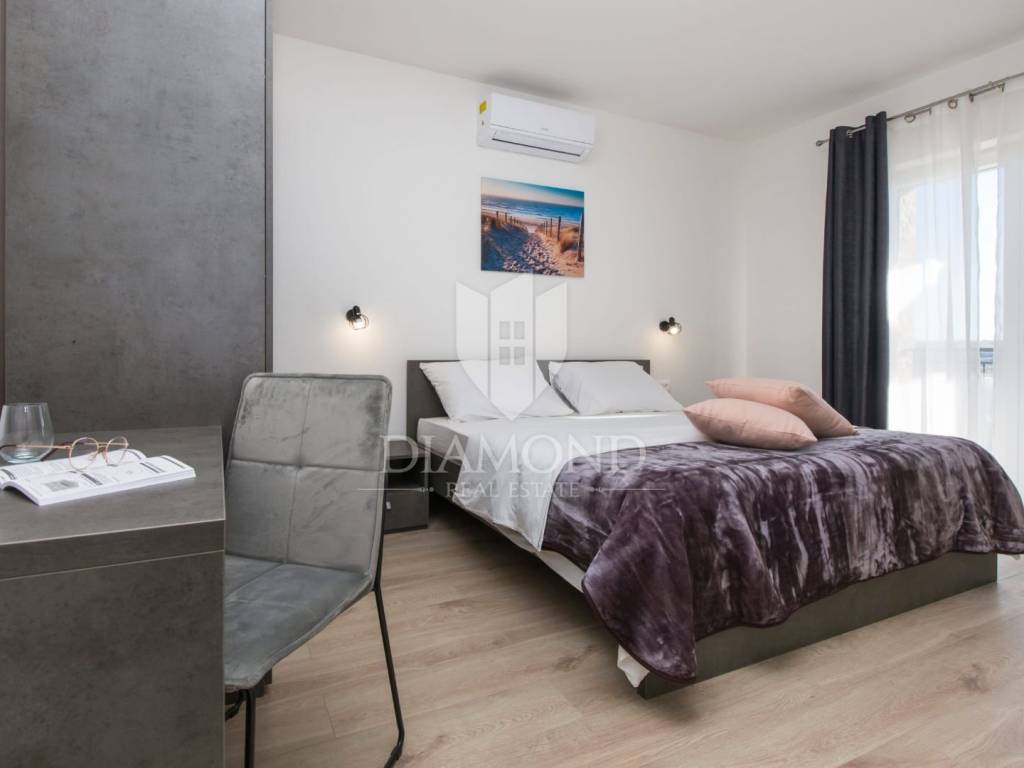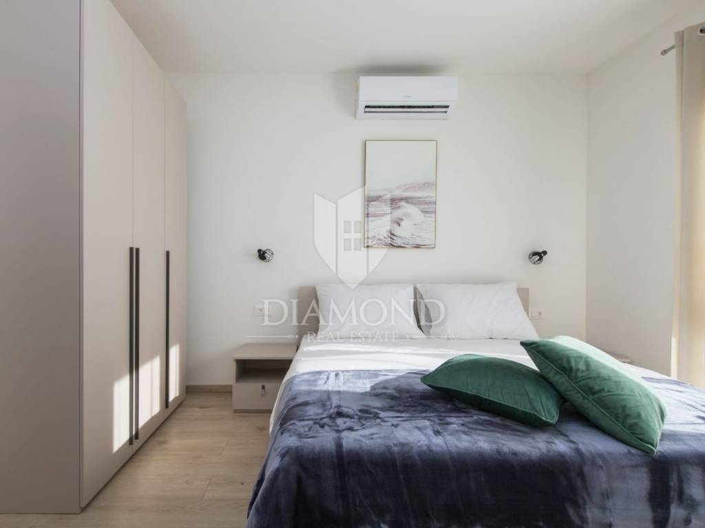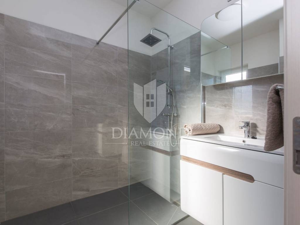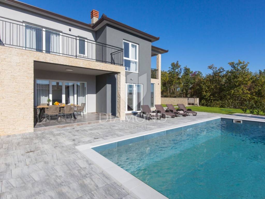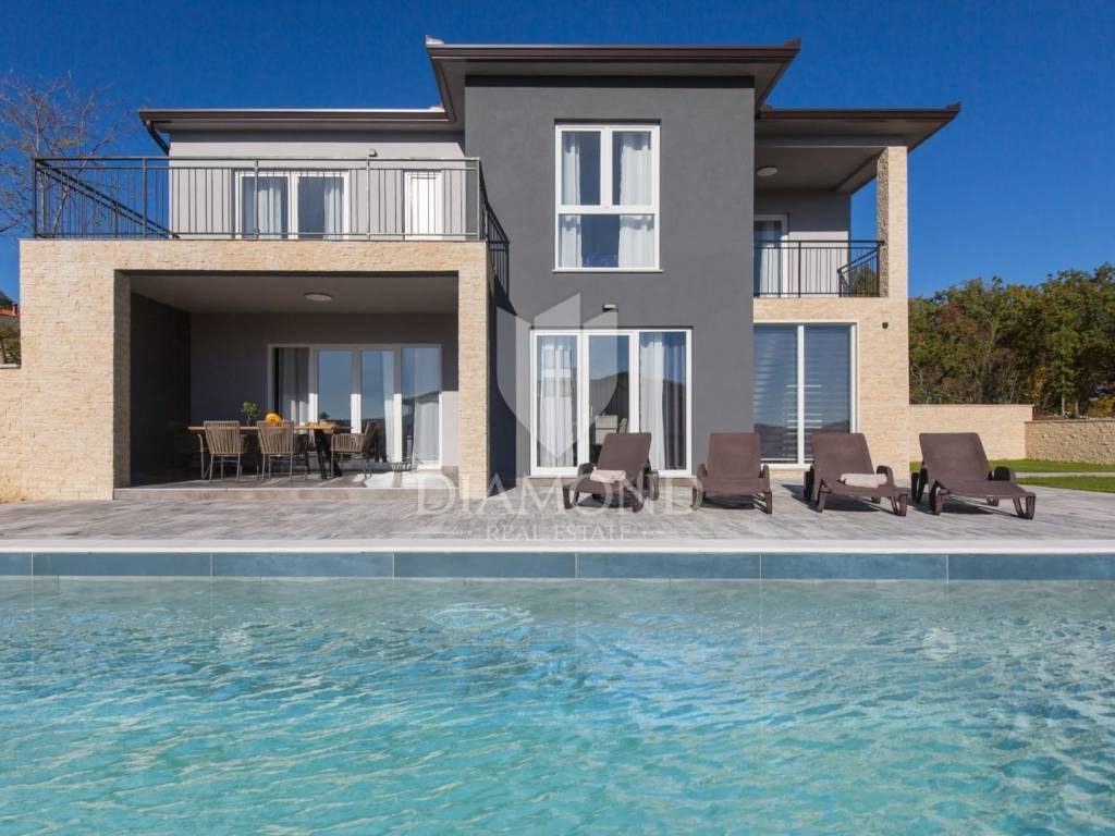 We are selling a beautiful newly built vacation home only 4.5 kilometers from Labin. Located in a beautiful position on elevated ground with a beautiful view, the holiday home with a swimming pool has a total square footage of 165 m2. It is designed as a multi-storey house. The ground floor includes a spacious living room with an open space concept with a dining room and a kitchen with a pantry. There is also a guest toilet and a laundry room. On the first floor, there are three comfortable bedrooms with their own bathrooms, and two of them have access to the balcony, which offers a beautiful open view of the hilly landscape and the Old Town of Labin. The issue of heating and cooling is solved with installed air conditioners in every room and underfloor heating, which makes the house comfortable to live in all year round. There is also the possibility of installing a fireplace in the living room for additional atmosphere. The landscaped yard has a total square footage of 890 m2 with secured parking and beautiful green areas, and the center of attention is certainly the 40 m2 swimming pool and the landscaped sunbathing area. The property represents an excellent opportunity to invest in a quality holiday home through which a quick return on investment is guaranteed. The location of the property is quiet, surrounded by holiday homes. The first store is 3.5 kilometers away, and the town of Labin with all the necessary amenities is 4.5 kilometers away. Rabac with beautiful beaches is only 9 km away. An exceptional opportunity to acquire quality real estate.